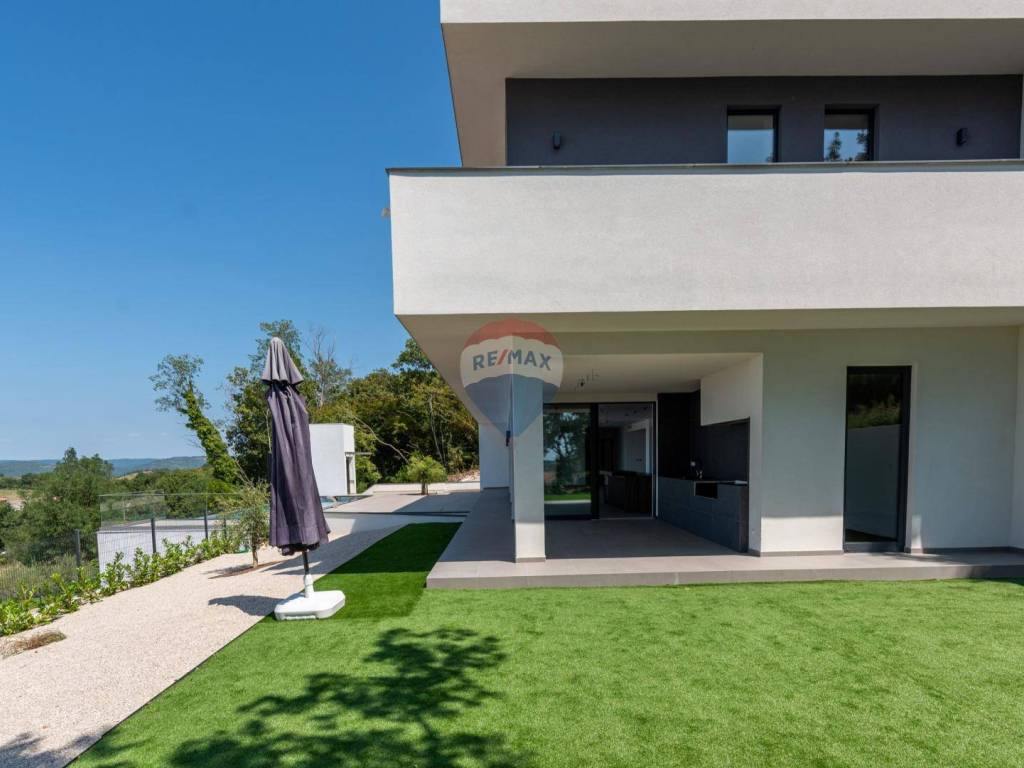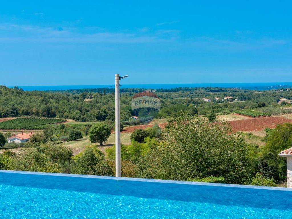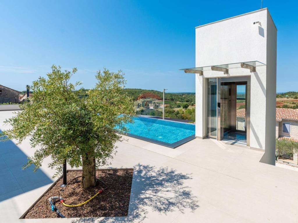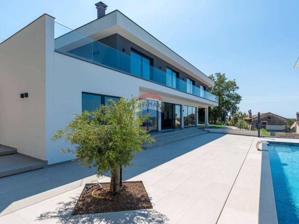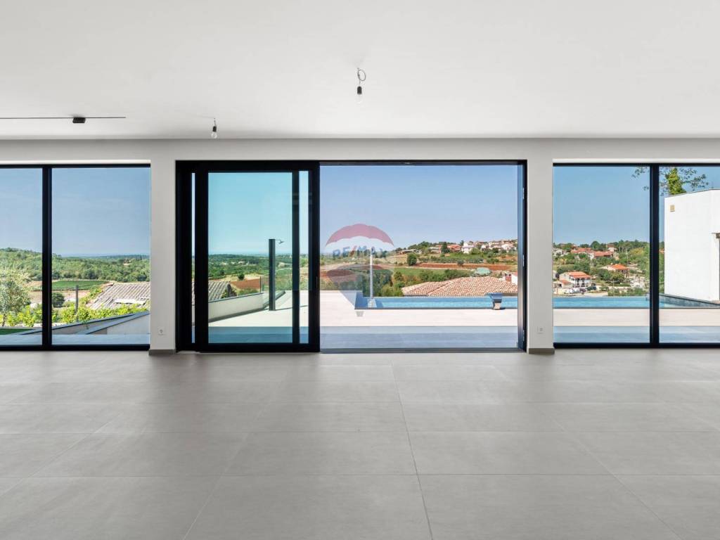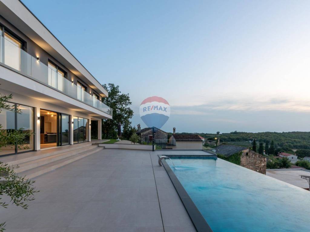 Eine moderne Villa zum Verkauf, gelegen in einem kleinen ruhigen Ort in der Nähe von Vižinada. Die Villa liegt auf einem Hügel, der einen herrlichen Blick auf das Meer, Weinberge, Olivenhaine und bis hin zur italienischen Küste und den Alpen bietet.