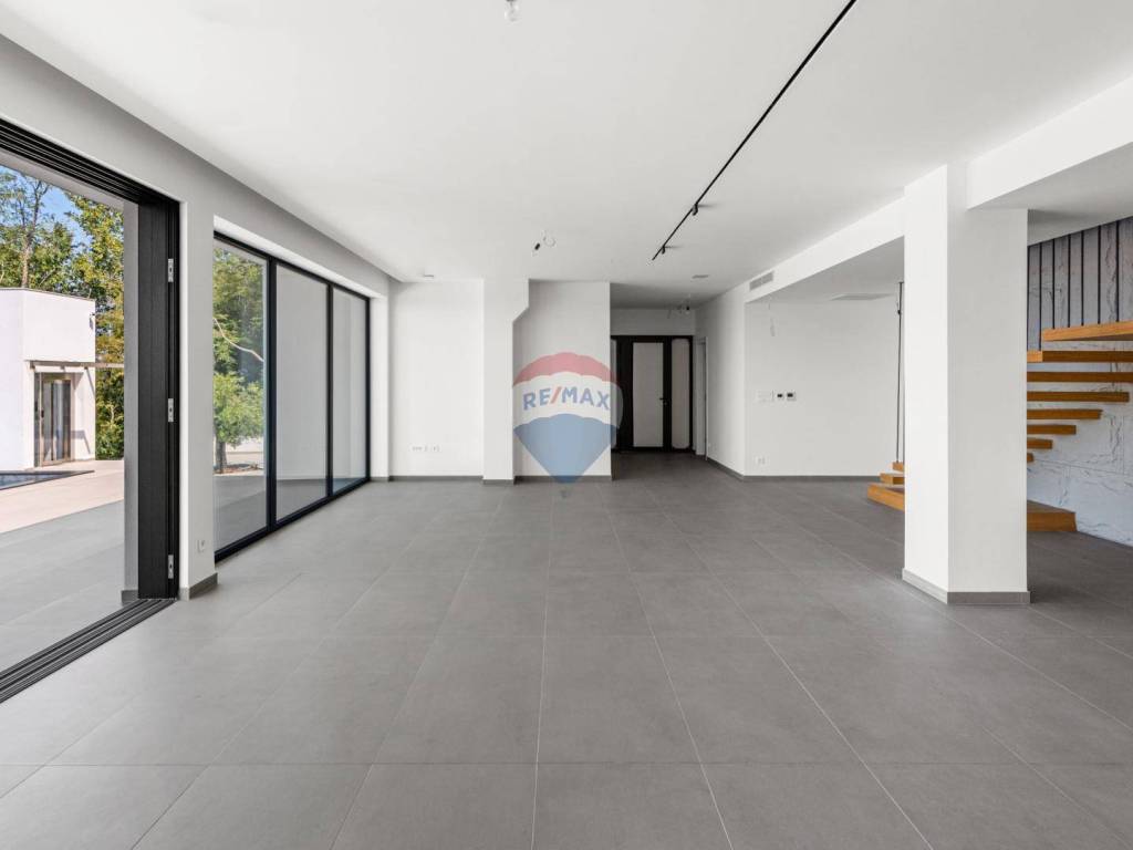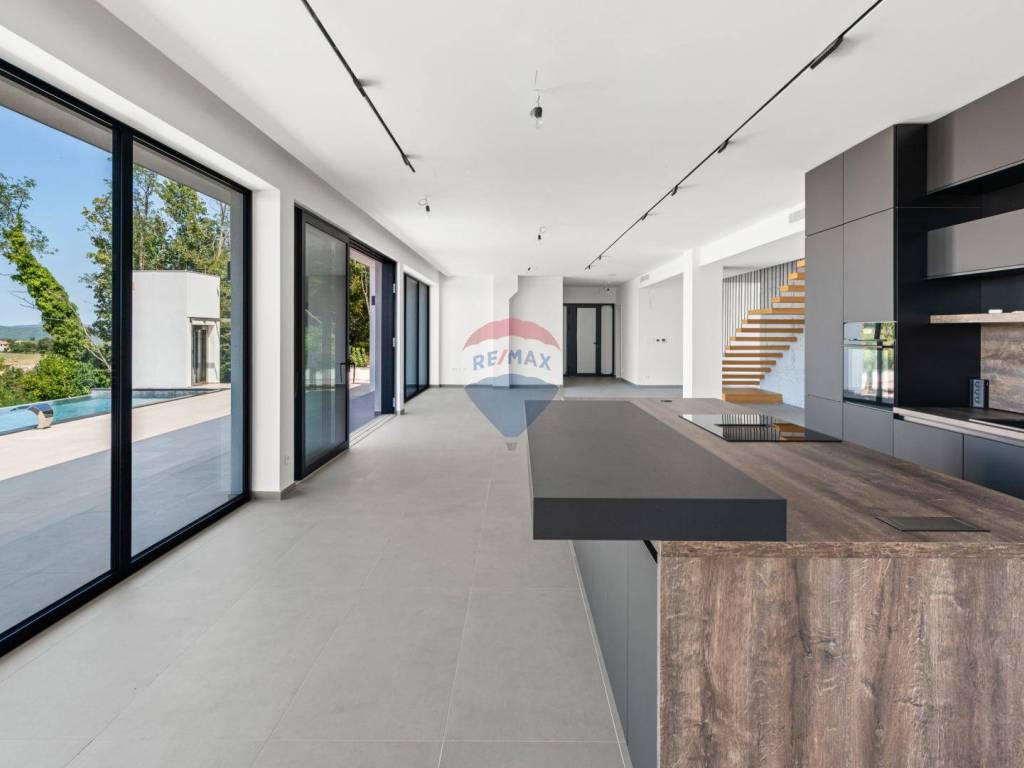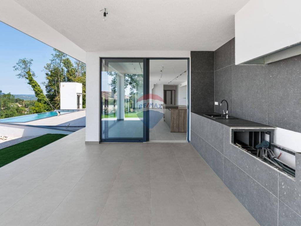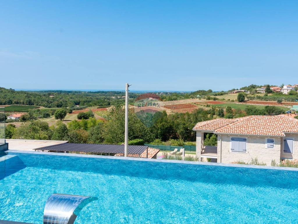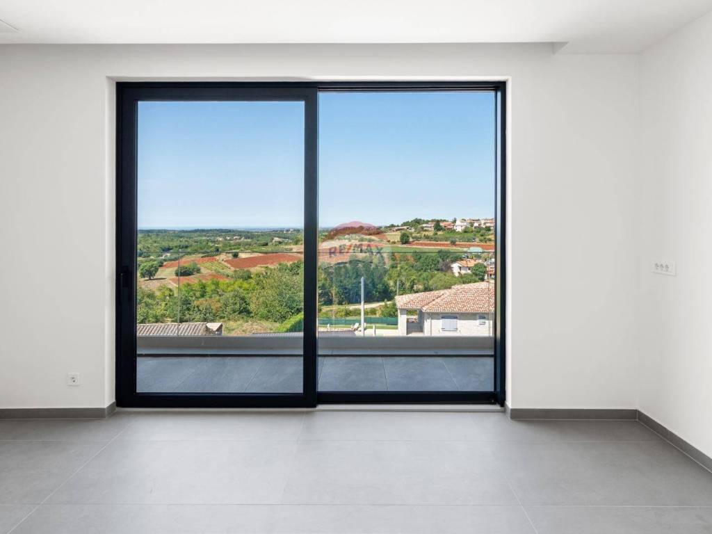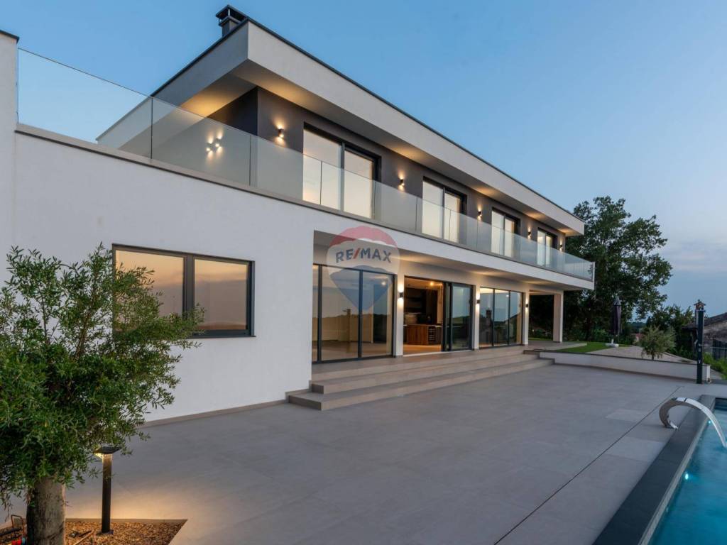 Eine moderne Villa zum Verkauf, gelegen in einem kleinen ruhigen Ort in der Nähe von Vižinada. Die Villa liegt auf einem Hügel, der einen herrlichen Blick auf das Meer, Weinberge, Olivenhaine und bis hin zur italienischen Küste und den Alpen bietet.