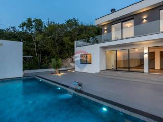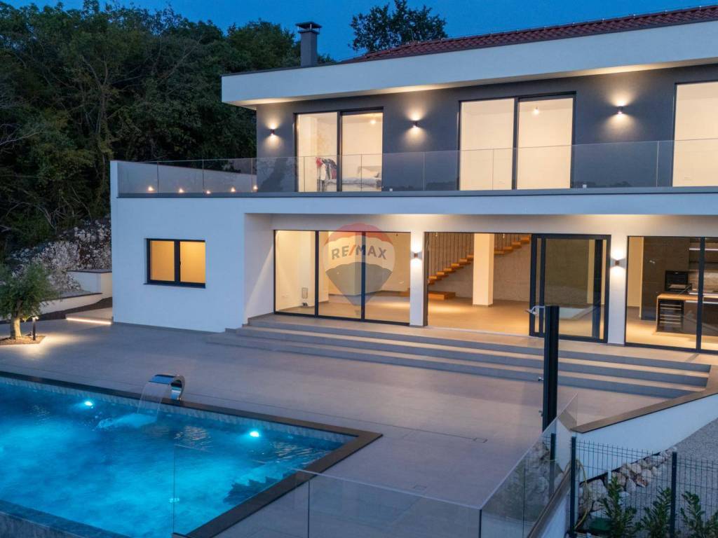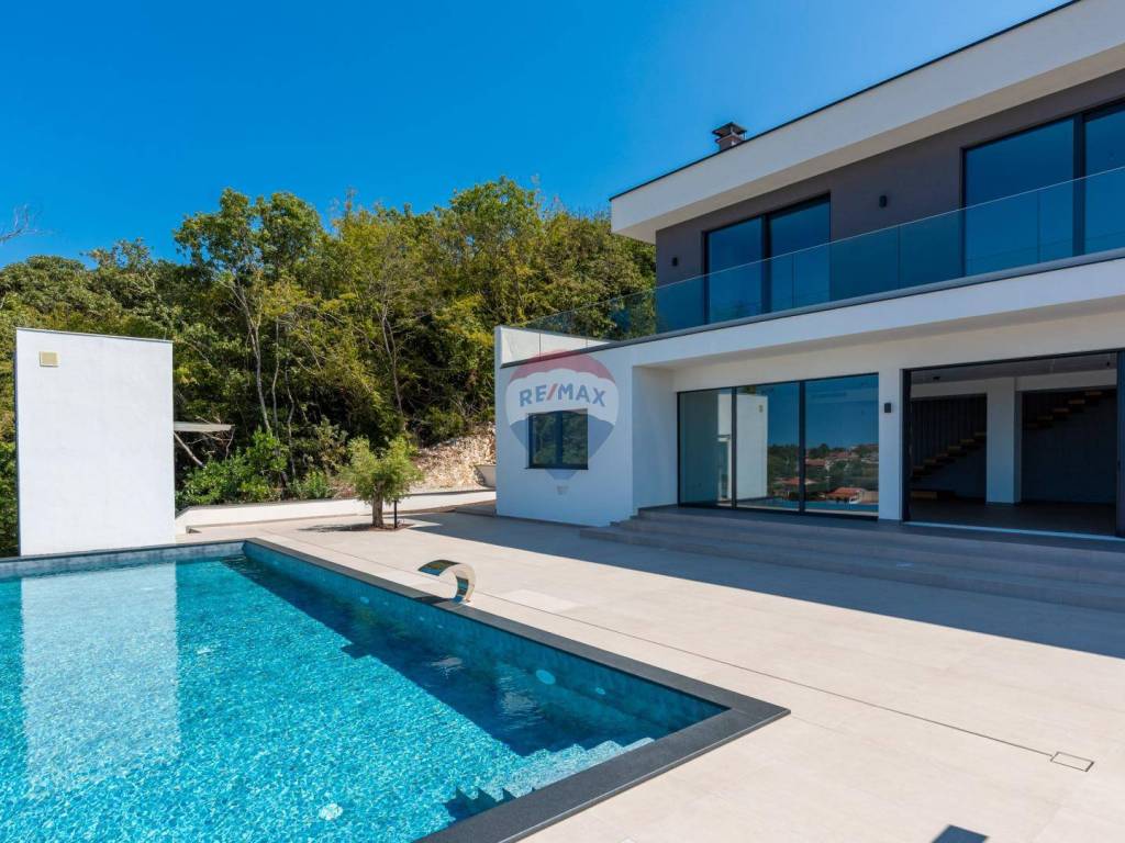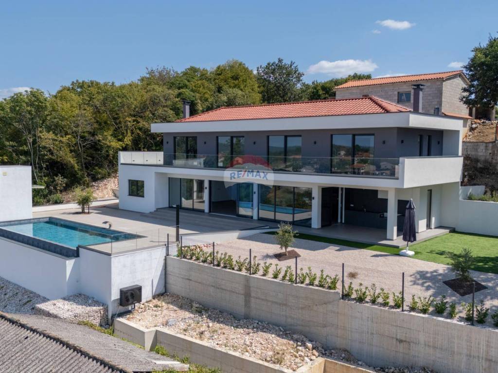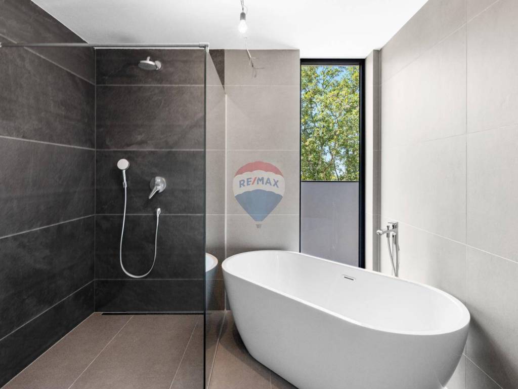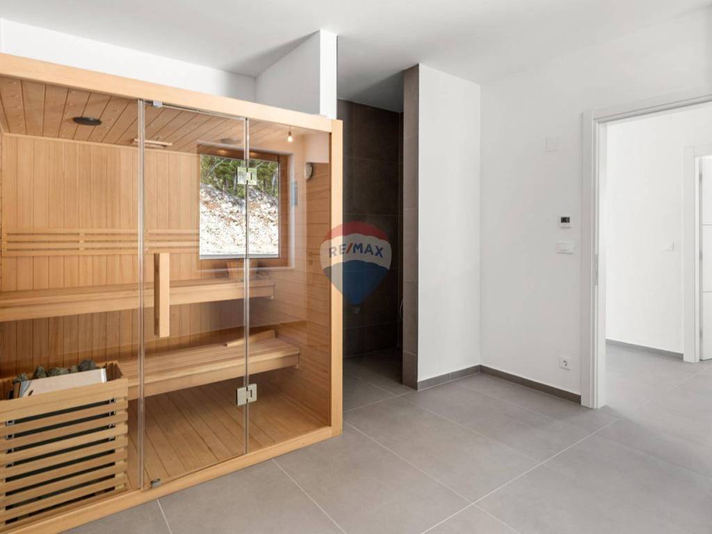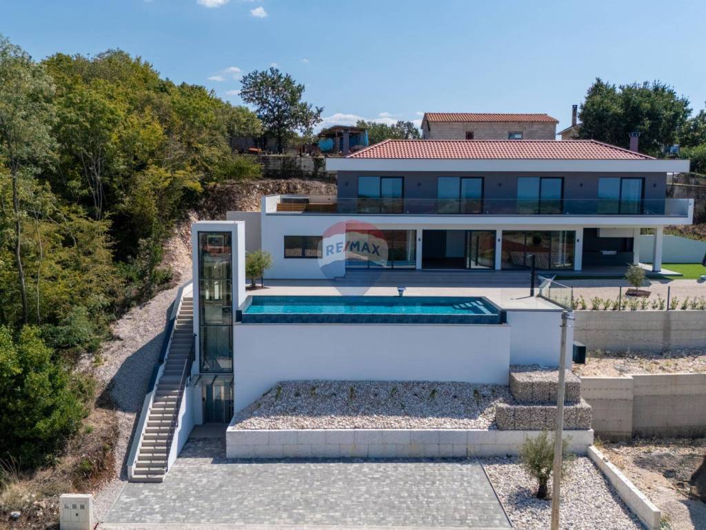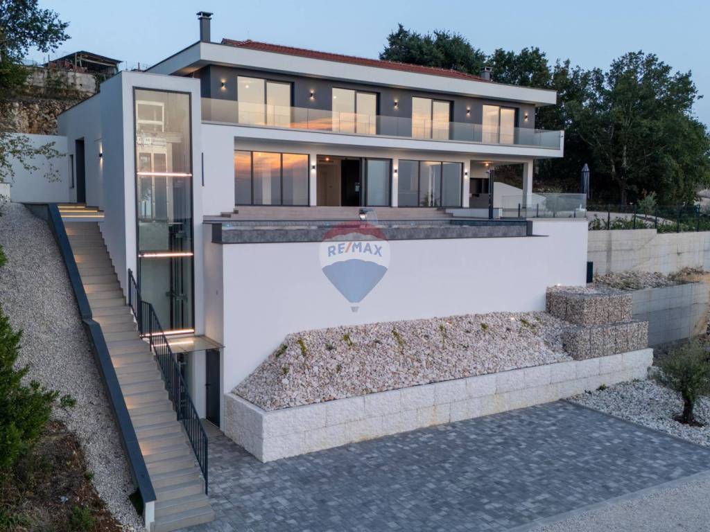 Mit einem weitläufigen Garten von 1.094 m2 bietet das Haus luxuriöse Einrichtungen wie einen großen Infinity-Pool mit Wasserfall, eine überdachte Außenküche, einen überdachten Parkplatz mit Ladegerät für Elektroautos, neben dem sich ein Aufzug befindet, der uns hinaufbringt eine Höhe von 7 Metern, wo sich die Villa selbst befindet. Das Innere des Hauses begeistert durch ein offenes Raumkonzept im Erdgeschoss mit einem großzügigen Wohnzimmer mit Kamin, einem Esszimmer und einer modernen Küche. Eine große Glaswand bietet einen freien Blick auf die Liegewiese und den im Hof gelegenen Swimmingpool, der bis zum Meer reicht. Hier gibt es auch zusätzliche Räume wie einen Fitnessraum, einen Wellnessbereich mit finnischer Sauna und einen Weinraum für gemütliches Beisammensein. Im Obergeschoss befinden sich vier Schlafzimmer mit jeweils eigenem Bad und einer Gemeinschaftsterrasse mit Whirlpool.