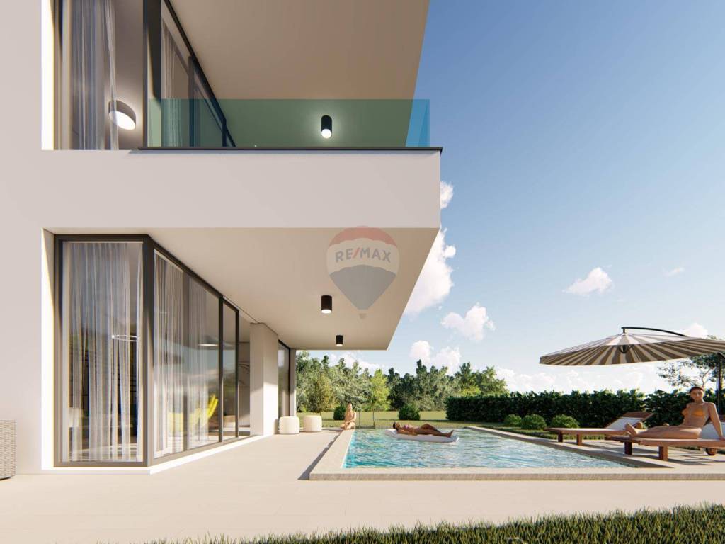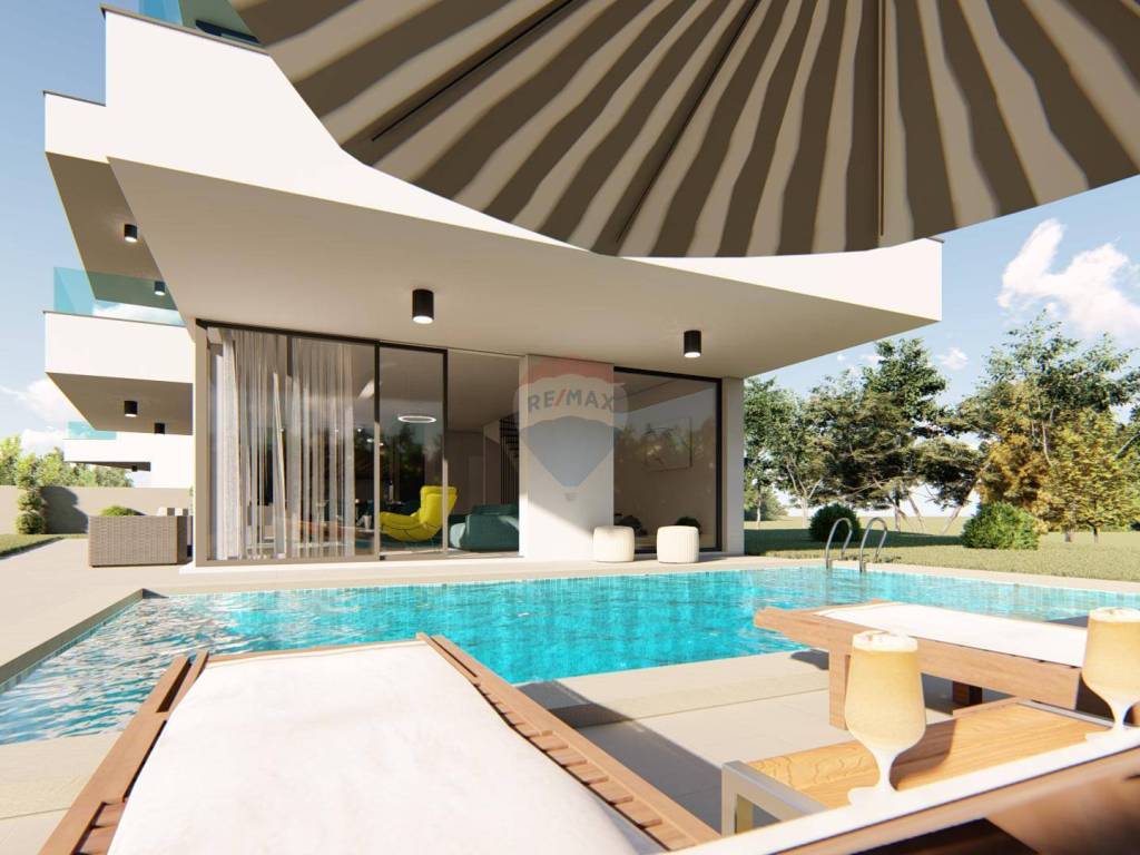 Terrasse gibt es einen Swimmingpool. In Wohnzimmer, Küche und Esszimmer führt eine Treppe
