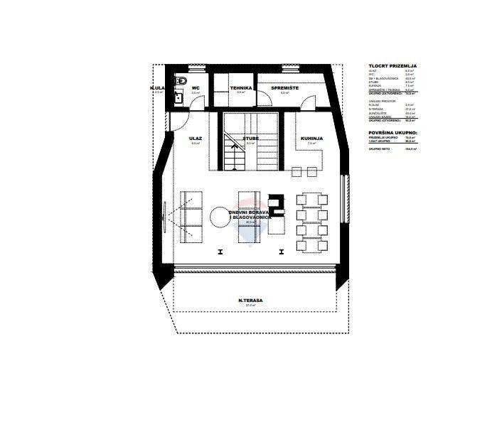 Im Erdgeschoss befinden sich eine Treppe, ein Wohnzimmer mit Esszimmer, ein Serviceraum und ein geräumiges Wohnzimmer mit Zugang zum Garten