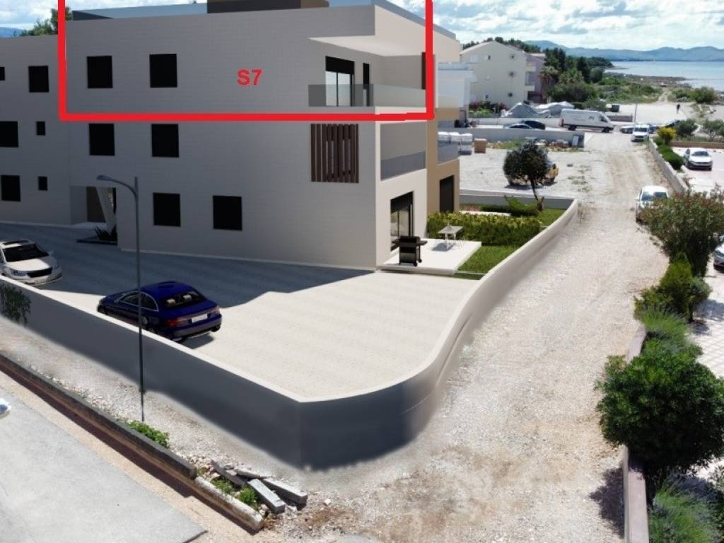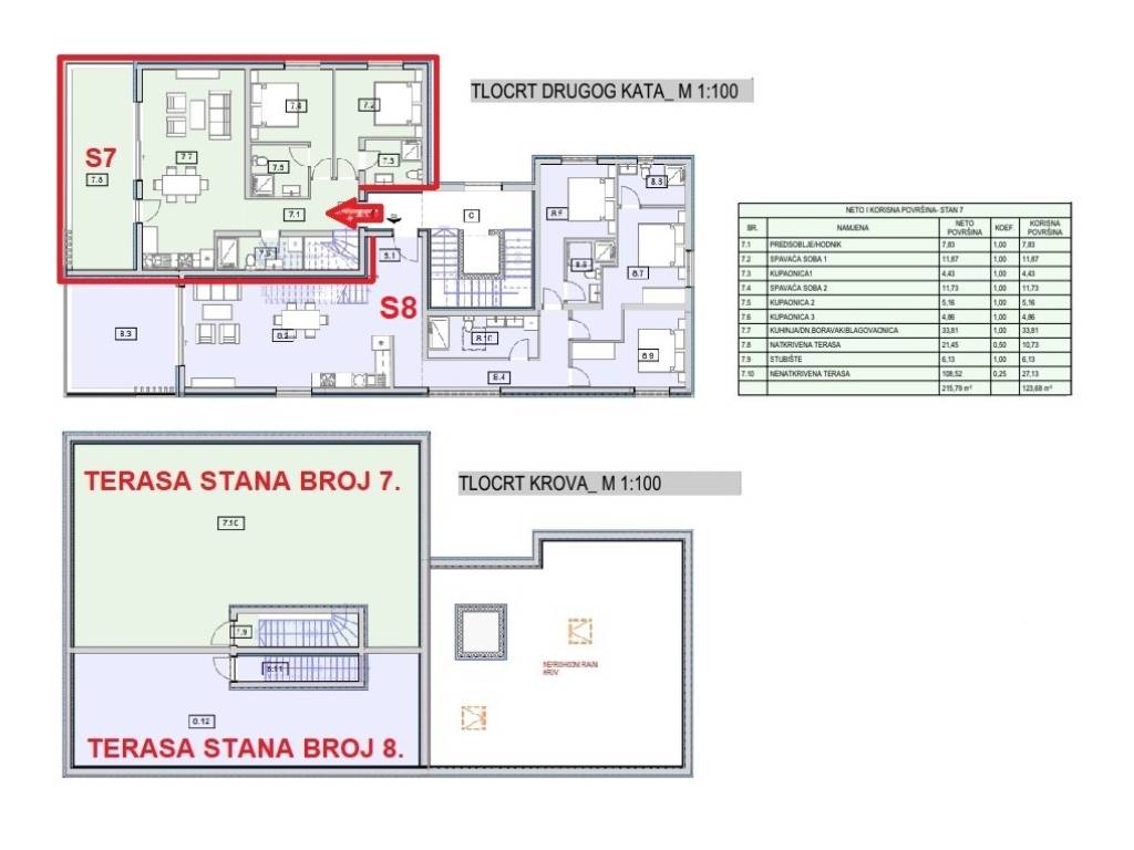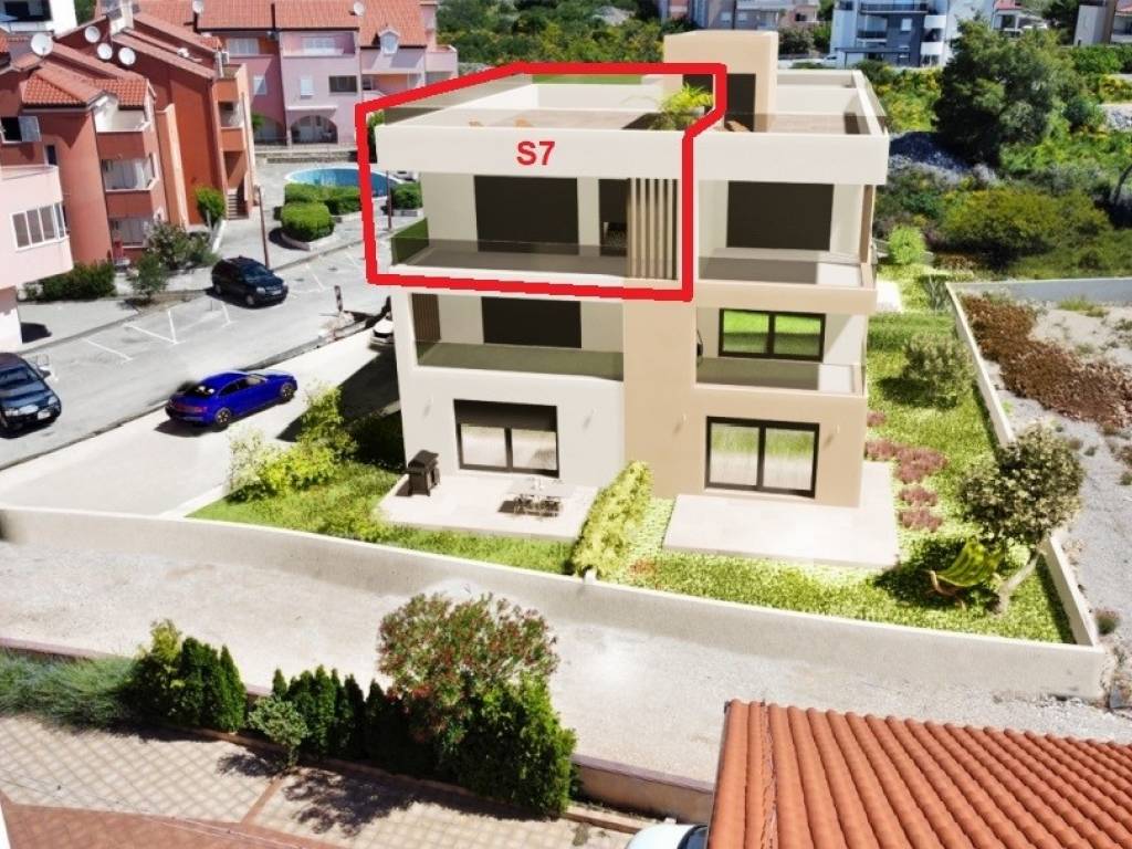 Die Wohnung TS-S7 verfügt über zwei Schlafzimmer, Flur und Eingangsbereich, eine Wohn-Kochbereich, drei Badezimmer und eine überdachte Terrasse. Zur Wohnung gehören zwei Parkplätze. Die 108,52 m² große, eigene Terrasse, befindet sich im dritten Obergeschoss.