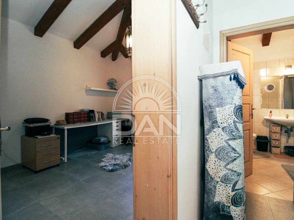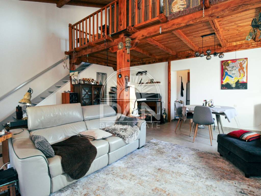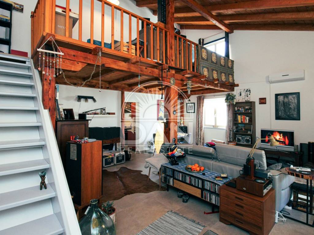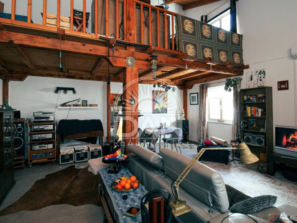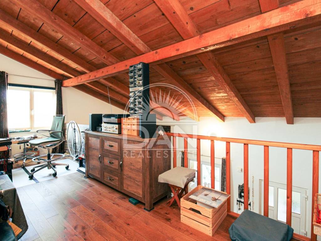 Das Innere besteht aus einem großzügigen Wohn- und Essbereich mit hohen Decken, sichtbaren Holzbalken und einem Holzofen, der dem Raum besonderen Charakter verleiht. Die Küche ist getrennt und komplett ausgestattet. Das Haus verfügt über zwei Schlafzimmer, beide mit hohen Decken und gut erhaltenen Originaldetails. Auf der Zwischentage befindet sich ein zusätzlicher Raum, der aktuell als Büro genutzt wird.