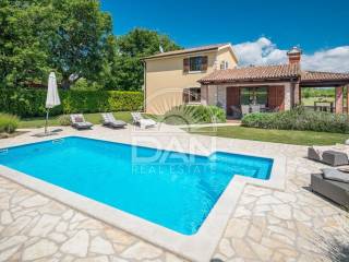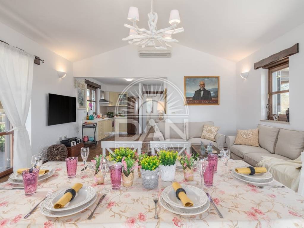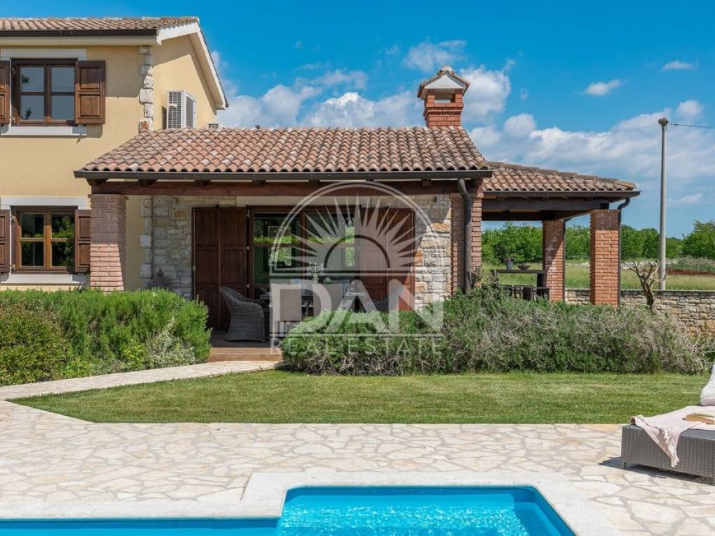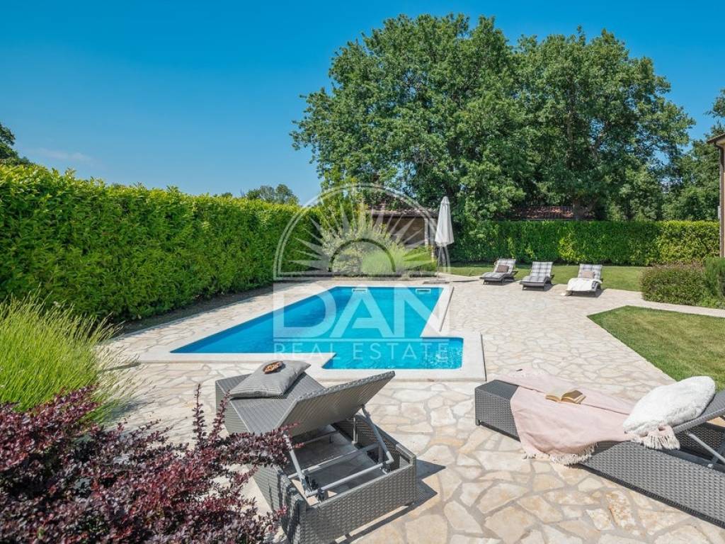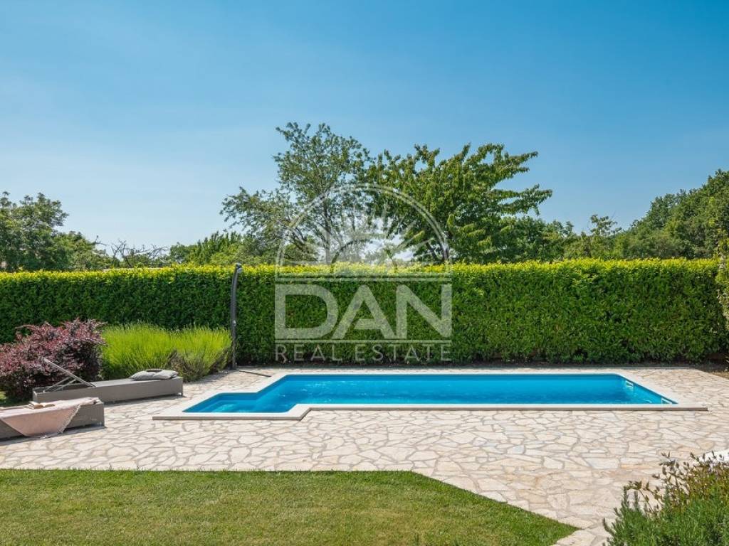 In einem ruhigen istrischen Ort, am Rand der Siedlung und in unmittelbarer Nähe zum Wald, befindet sich dieses attraktive Haus mit Pool – ideal für Erholung und Entspannung. Das Haus verfügt über eine Wohnfläche von 144 m² und erstreckt sich über zwei Etagen. Im Erdgeschoss befinden sich der Eingangsbereich, ein heller Wohnbereich mit offener Küche und Esszimmer, ein Abstellraum, ein Schlafzimmer sowie ein Gäste-WC. Im Obergeschoss liegen zwei weitere Schlafzimmer und ein Badezimmer. Vom Wohn- und Essbereich gelangt man auf die Terrassen, die dank der günstigen Ausrichtung das ganze Jahr über viel Tageslicht bieten. Der gepflegte Garten besticht durch einen Swimmingpool mit Sonnenterrasse als zentralem Element sowie eine geschmackvoll gestaltete mediterrane Außenküche mit steinernem Kamin – ideal für gesellige Stunden im Freien. Das Haus ist mit vier Klimaanlagen ausgestattet und bietet ganzjährigen Wohnkomfort. Zudem stehen drei private Parkplätze zur Verfügung. Aufgrund der ruhigen Lage, der Privatsphäre, des ansprechenden Interieurs und der Nähe zur Natur ist diese Immobilie eine perfekte Wahl für alle, die ein eigenes Refugium in Istrien fernab von Hektik und Menschenmengen suchen.