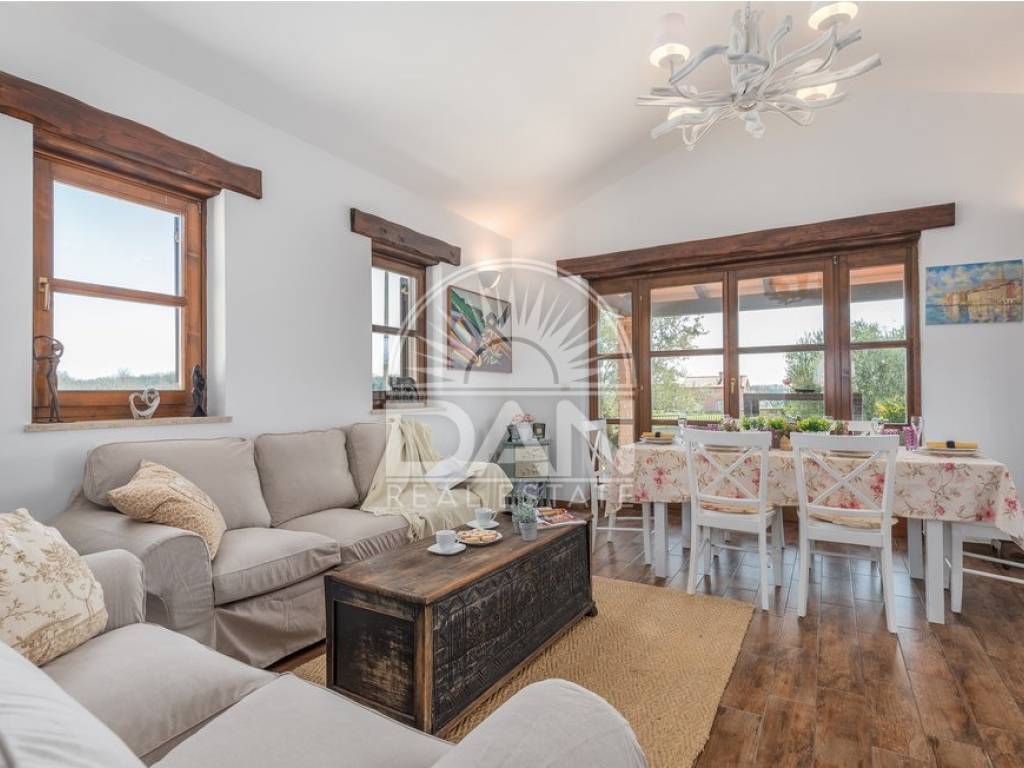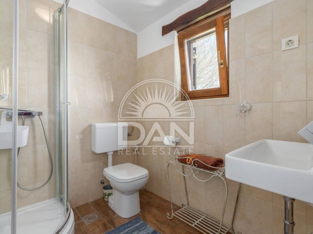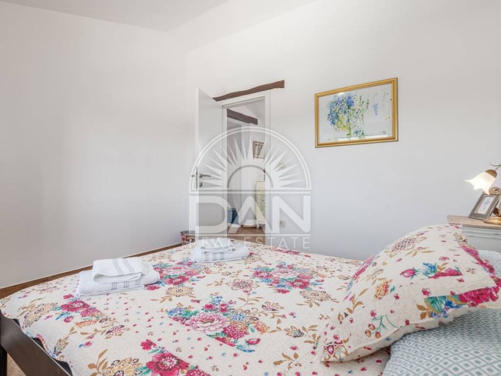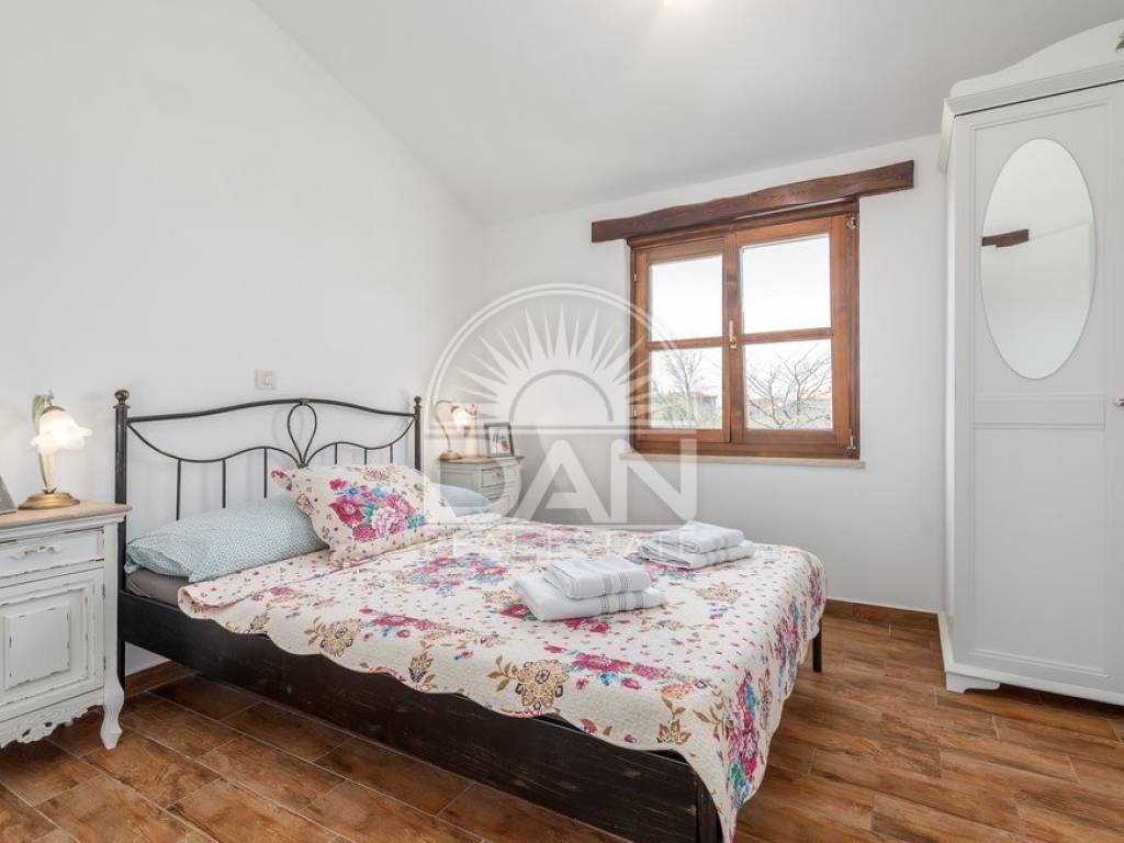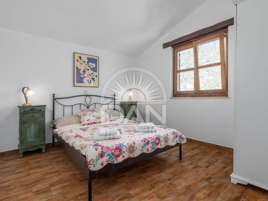 In einem ruhigen istrischen Ort, am Rand der Siedlung und in unmittelbarer Nähe zum Wald, befindet sich dieses attraktive Haus mit Pool – ideal für Erholung und Entspannung. Das Haus verfügt über eine Wohnfläche von 144 m² und erstreckt sich über zwei Etagen. Im Erdgeschoss befinden sich der Eingangsbereich, ein heller Wohnbereich mit offener Küche und Esszimmer, ein Abstellraum, ein Schlafzimmer sowie ein Gäste-WC. Im Obergeschoss liegen zwei weitere Schlafzimmer und ein Badezimmer. Vom Wohn- und Essbereich gelangt man auf die Terrassen, die dank der günstigen Ausrichtung das ganze Jahr über viel Tageslicht bieten. Der gepflegte Garten besticht durch einen Swimmingpool mit Sonnenterrasse als zentralem Element sowie eine geschmackvoll gestaltete mediterrane Außenküche mit steinernem Kamin – ideal für gesellige Stunden im Freien. Das Haus ist mit vier Klimaanlagen ausgestattet und bietet ganzjährigen Wohnkomfort. Zudem stehen drei private Parkplätze zur Verfügung. Aufgrund der ruhigen Lage, der Privatsphäre, des ansprechenden Interieurs und der Nähe zur Natur ist diese Immobilie eine perfekte Wahl für alle, die ein eigenes Refugium in Istrien fernab von Hektik und Menschenmengen suchen.