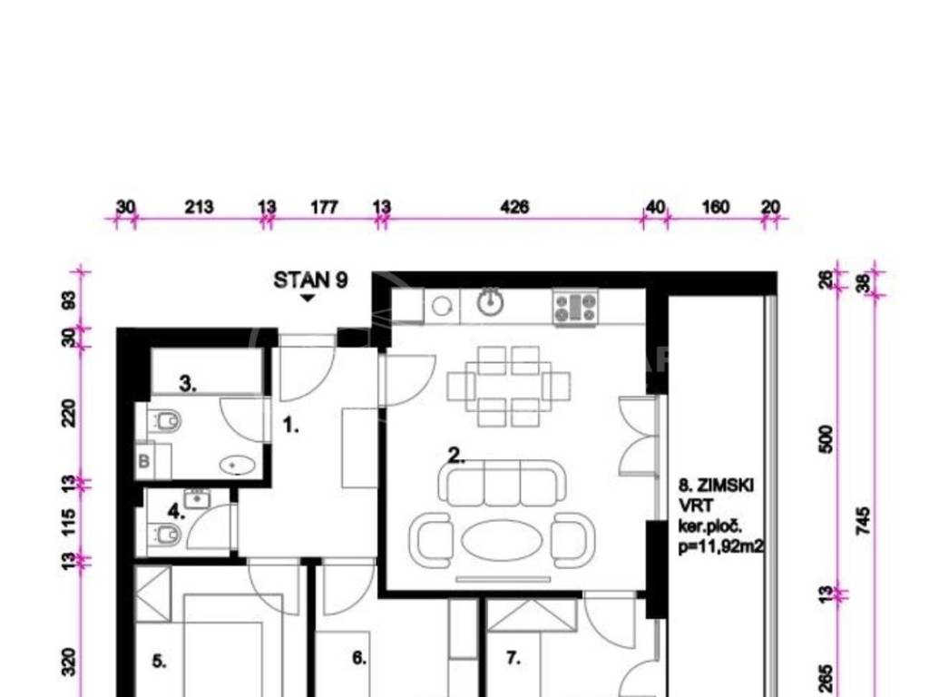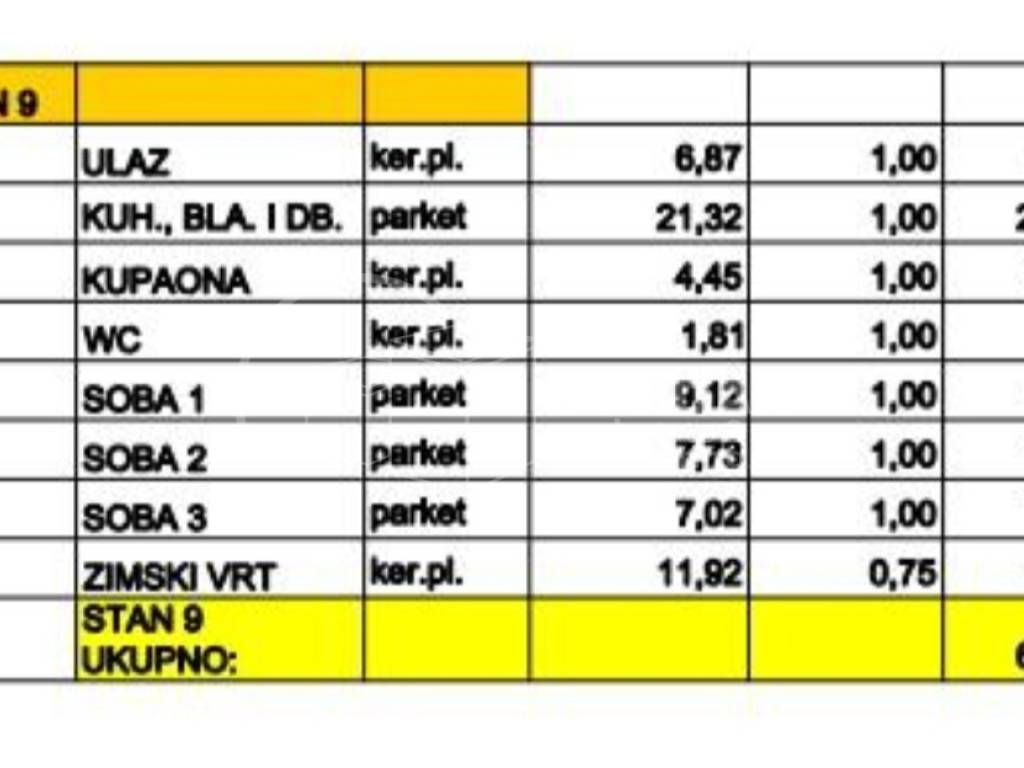 Stan se sastoji od ulaza, kuhinje, blagovaonice sa dnevnim boravkom, tri spavaće sobe, kupaonice, wc-a i zimskog vrta.