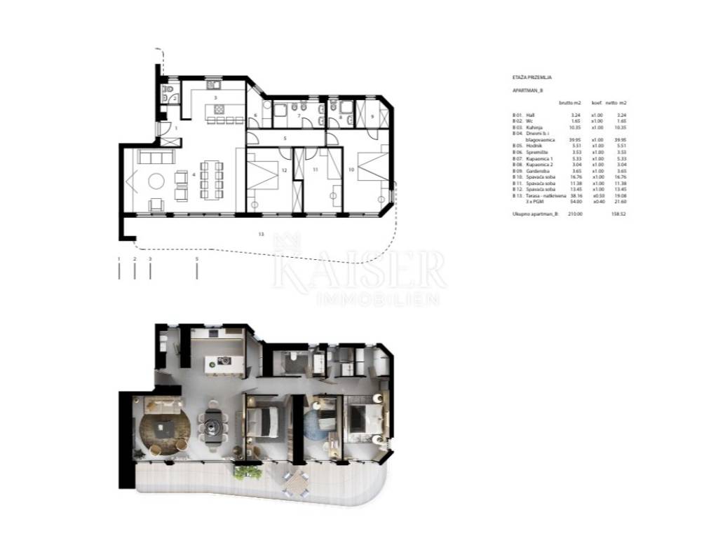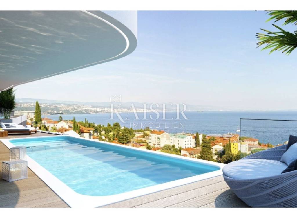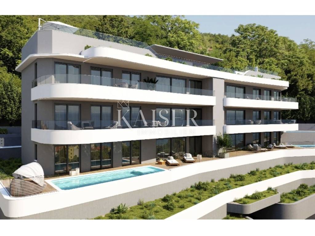 Kaiser Immobilien präsentiert eine moderne Wohnung in einem Neubau in ruhiger Lage nahe dem Meer in Opatija. Die Wohnung hat eine Fläche von 158 m2 und besteht aus einer Eingangshalle (3,24 m2), einem Wohnzimmer mit Esszimmer (39,95 m2), einer kleinen Toilette (1,65 m2), einem Flur (5,51 m2) und einem Abstellraum Zimmer (3,53 m2), Hauptschlafzimmer mit eigenem Bad und Ankleidezimmer. (16,76 m2, 5,33 m2 und 3,65 m2). Darüber hinaus verfügen wir über zwei weitere Schlafzimmer (11,38 m2 und 13,45 m2) und ein Badezimmer (3,04 m2). Zur Wohnung gehört außerdem eine überdachte Terrasse von 20 m2 und drei Parkplätze in der Garage. Die Heizung erfolgt über eine Fußbodenheizung mit Wärmepumpen. Das Apartment bietet Meerblick. Alle wichtigen Einrichtungen befinden sich in der Nähe des Grundstücks selbst, während das Meer nur 100 Meter Luftlinie entfernt ist. Das Gebäude befindet sich im Bau und beim Bau selbst werden nur Materialien höchster Qualität verwendet. Die Fertigstellung der Arbeiten wird für Ende 2023 erwartet.