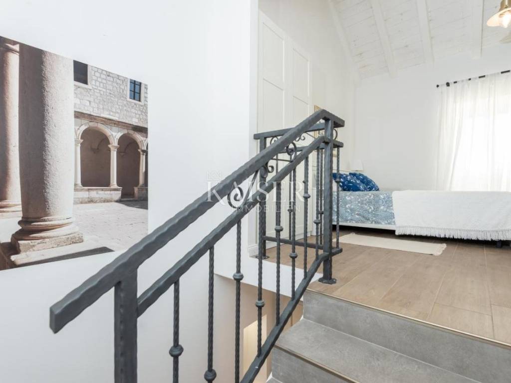 Kaiser Immobilien präsentiert ein wunderschönes Steinhaus auf der Insel Ugljan, erste Reihe zum Meer. Das Haus wurde vor 1968 erbaut und 2019 vollständig renoviert, wobei bis auf die Außenwände alles abgerissen wurde. Alle Installationen wurden renoviert und das Haus ist voll möbliert. Die gesamte Wohnfläche des Hauses beträgt 75 m2, der Garten ist ca. 300 m2 groß. Das Haus besteht aus Erdgeschoss, erstem und zweitem Stock. Im Erdgeschoss gibt es ein Wohnzimmer mit Küche und Esszimmer sowie eine Toilette. Im ersten Stock befindet sich ein geräumiges Schlafzimmer mit eigenem Badezimmer. Im zweiten Stock befindet sich ein weiteres geräumiges Schlafzimmer mit eigenem Badezimmer. Das Haus verfügt über neue Holztischlereiarbeiten mit Fensterläden und das Holz ist Lärche. Alle Räume sind klimatisiert und verfügen über einen Kamin zur Festbrennstoffheizung. Der Garten verfügt außerdem über einen großen Swimmingpool und einen Parkplatz für zwei Autos. Das Haus bietet von allen Etagen einen unverbauten Blick auf das Meer. Lage: Meer - 50 m Geschäft - 300 m Restaurant und Café - 50 m Strand - 50 m Für alle weiteren Informationen wenden Sie sich an den Makler: Davor Piškulić davor@kaiser-immobilien.hr +00 385 95 583 8240 WhatsApp, Viber