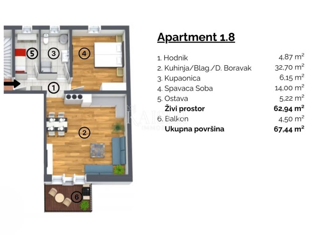 Kaiser Immobilien präsentiert Ihnen eine Wohnung in einem kleinen istrischen Dorf in der Nähe von Buje. Mit einer Fläche von 62,94 m² bietet diese Wohnung einen geräumigen Wohn-, Ess- und Küchenbereich (32,70 m²), ein Schlafzimmer (14,00 m²) und ein modernes Badezimmer (6,15 m²). Ein Abstellraum (5,22 m²) bietet zusätzlichen Stauraum. Ein 4,5 m² großer Balkon erweitert den Wohnbereich im Freien und lädt zum Entspannen ein. Zur hochwertigen Ausstattung gehören Eichenparkett, Klimaanlage und eine voll ausgestattete Küche. Ein privater Parkplatz ist im Preis inbegriffen. Die Grenze zu Slowenien ist nur 10 Autominuten entfernt, während schöne Strände, verschiedene gute Restaurants, Cafés, Promenaden, Radwege, Geschäfte und verschiedene andere notwendige Annehmlichkeiten eine 15-minütige Autofahrt entfernt sind. Die Stadt Buje erreichen Sie nach 5 Autominuten. Der Preis der Wohnung versteht sich inklusive Mehrwertsteuer. Sie wird teilmöbliert verkauft – sie verfügt über fertige Badezimmer, Eichenparkett und eine Einbauküche mit Geräten. Top-Ausstattung: Die Apartments sind mit hochwertigen Materialien und modernen Annehmlichkeiten ausgestattet und bieten so höchsten Wohnkomfort. Gemeinschaftsgarten: Genießen Sie erholsame Momente im sorgfältig angelegten Gemeinschaftsgarten mit Sitzecke, Solardusche und Grill – ideal zum Entspannen und für gemütliche Abende in geselliger Runde. Attraktive Lage: Das idyllische istrische Dorf vereint Ruhe und zentrale Lage – nur 15 km vom Meer und der Küstenstadt Umag entfernt. Die Stadt Buje mit Geschäften, Restaurants, einer Bank und medizinischen Dienstleistungen ist nur 2 km entfernt. Komplettservice: Auf Wunsch übernimmt der Verkäufer die komplette Vermietung und Verwaltung Ihrer Wohnung. Sie genießen eine sorgenfreie Investition und können Ihre Wohnung selbst nutzen. Aufgrund ihrer Lage und Ausstattung eignet sich diese Immobilie hervorragend als Investition für den Tourismus oder zum ganzjährigen Wohnen. Die Maklercourtage für den Käufer beträgt 3 % zzgl. MwSt. Die Provision deckt alle mit dem Kauf verbundenen Dienstleistungen ab und wird erst beim Kauf einer Immobilie beim Abschluss des ersten Rechtsgeschäfts fällig. Für weitere Informationen und zur Vereinbarung einer Besichtigung der Immobilie kontaktieren Sie uns bitte: Damir Mlacović E-Mail: damir@kaiser-immobilien.hr Telefon: +385-98-339-933