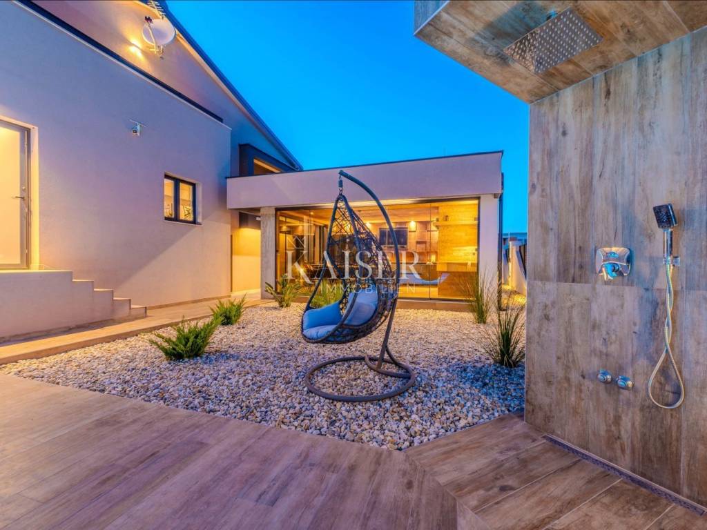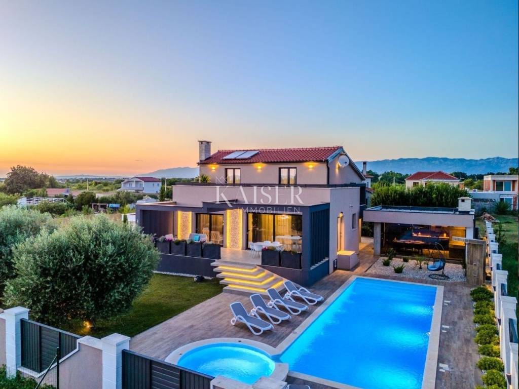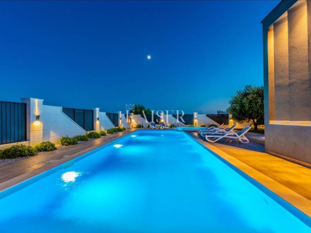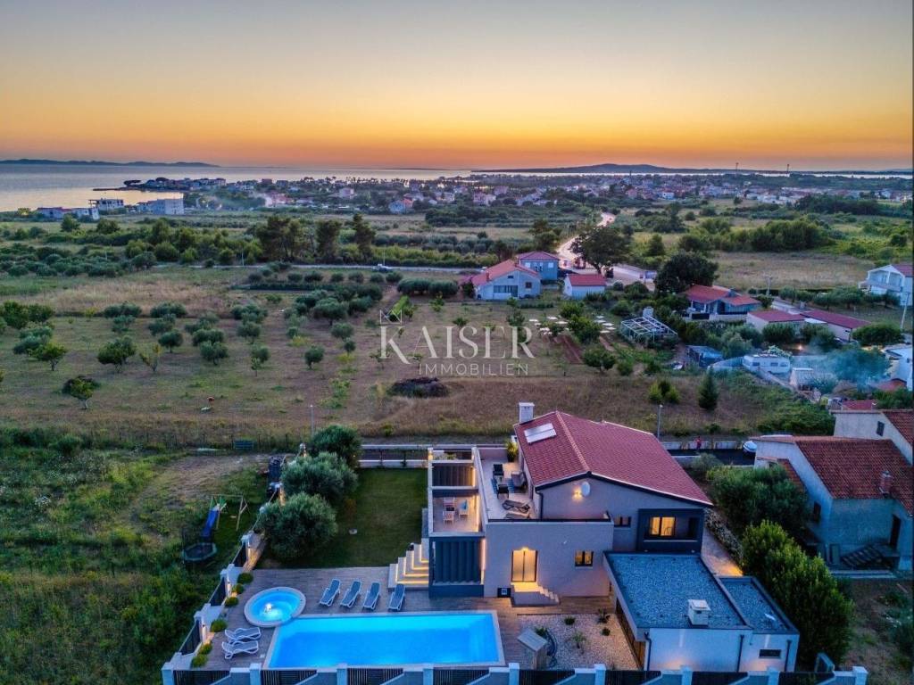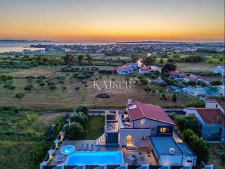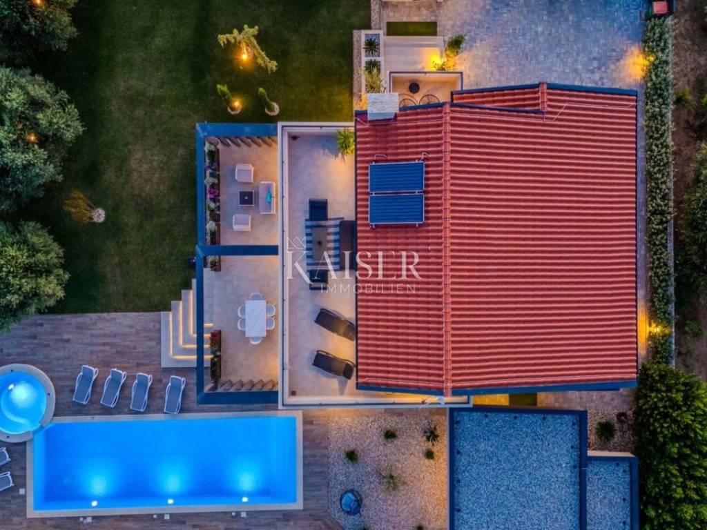 Es gibt Orte, die keine Aufmerksamkeit erfordern – sie gehören ganz natürlich einem. Räume mit einem unaufdringlichen Gefühl von Güte. Kaiser Immobilien präsentiert diese wunderschöne Villa in Privlaka bei Zadar, die nicht nur Architektur, Quadratmeterzahl und Luxus verkörpert. Sie vermittelt ein Gefühl von Ort, Raum und Zeit. Das Gefühl, dort angekommen zu sein, wo man hingehört. Hier sind die Morgen und Nächte duftend und ruhig. Von jedem Zimmer dieser wunderschönen Villa schweift der Blick über Weinberge, Olivenhaine und Felder bis hin zum Meer, das weit am Horizont dieses Bild vollkommener Freiheit abschließt. Auf einem 913 m² großen Grundstück gelegen, umgeben von nichts als Natur, fügt sich diese moderne, 350 m² große Villa in die Umgebung ein, ohne sich aufzudrängen. Dank ihrer eigenen Solaranlage ist sie autark und völlig energieunabhängig. Der Zugang zum Anwesen erfolgt über ein automatisches Türsystem mit ferngesteuertem Öffnen und Schließen, das zur Eingangshalle mit eigener Veranda führt. Der Haupteingang ist über eine Treppe erreichbar. Sicherheit und Zugangskontrolle werden durch eine Gegensprechanlage und Videoüberwachung gewährleistet. Beim Betreten des Anwesens eröffnet sich ein freier Blick auf den angelegten Garten mit seinen üppigen mediterranen Pflanzen und der großzügigen Rasenfläche, die ein Gefühl von Privatsphäre und Komfort vermitteln. Im Zentrum des Gartens befindet sich ein beheizter Swimmingpool mit integriertem Whirlpool-Massagebereich, Außendusche und Liegewiese – ein idealer Ort, um warme Tage zu genießen. Eine besondere Ergänzung dieses Außenbereichs ist das Poolhaus mit einer voll ausgestatteten Sommerküche, die fast das ganze Jahr über die perfekte Umgebung für geselliges Beisammensein und Leben im Freien schafft. Das Haus erstreckt sich über drei Etagen, von denen jede ihre eigene Funktion und Geschichte hat und zusammen einen harmonischen, durchdachten Wohnraum schafft. Im Erdgeschoss befindet sich ein Erholungs- und Entspannungsbereich – ein modernes Fitnessstudio, ein Ruhebereich – ein Heimkino, das zusätzlich mit einer separaten Toilette für mehr Komfort ausgestattet ist. Die mittlere Etage, die gleichzeitig die Haupteingangsebene darstellt, umfasst eine Gästetoilette und einen langen Flur, der zu den Hauptwohnbereichen führt. Es gibt eine beeindruckende Küche, ausgestattet mit modernen Geräten und einer Kochinsel mit viel Stauraum, ein geräumiges, elegant eingerichtetes Esszimmer und ein Wohnzimmer, in dem der Kamin im Mittelpunkt steht – als Quelle der Wärme und einer gemütlichen Atmosphäre. Große Glaswände verwischen die Grenze zwischen Innen- und Außenbereich, verbinden die Wohnbereiche mit dem Garten und schaffen ein Gefühl von fließender, luftiger Atmosphäre und ständiger Verbundenheit mit der Natur. Der Wohnbereich öffnet sich zu einer Terrasse mit einer Kombination aus Ess- und Loungebereich – der perfekte Ort für den Morgenkaffee, zum Lesen oder für ruhige Abende bei Sonnenuntergang und geselliges Beisammensein im Freien. Die Terrasse geht nahtlos in eine Rasenfläche, ein Sonnendeck, einen Swimmingpool und einen Kinderspielplatz über und schafft so einen nahtlosen Wohnraum – vom Zuhause in die Natur. Im zweiten Stock befinden sich drei Schlafzimmer und ein luxuriöses, geräumiges Badezimmer, während im dritten Stock zwei Hauptschlafzimmer liegen – jedes mit eigenem Bad, eines mit Zugang zu einer großen Terrasse mit Sonnendeck und eines mit einem schattigen, gemütlichen kleinen Schlafzimmer. Der Ausblick aus jedem Zimmer inspiriert, entspannt und inspiriert. Die Villa ist hervorragend ausgestattet und sofort bezugsfertig. Es ist aus hochwertigen Materialien gebaut und mit Fußbodenheizung, Heiz- und Kühlsystem, PVC-Tischlerei, Sicherheitstüren und Videoüberwachung ausgestattet. Es hat einen eigenen Eingang, geräumige Terrassen, große Glaswände und einen zusätzlichen Parkplatz. Es enthält zwei reich ausgestattete Küchen – eine Innenküche mit erstklassigen modernen Geräten und eine Außenküche am Pool. Klimaanlage, Video-Gegensprechanlage, ein Rasenmäher neben dem Haus (automatisches Mähsystem), ein Bohrloch mit eigenem Bewässerungssystem und alle Strom- und Wasseranschlüsse sind bezahlt. Das Eigentum ist ordentlich. Diese Villa ist für diejenigen, die unaufdringlichen Luxus verstehen – moderne Naturliebhaber, kreative Menschen – diejenigen, die Raum zum Schaffen, Atmen und Leben in Balance suchen. Privlaka bietet genau das – den unaufdringlichen natürlichen Charme eines dalmatinischen Fischerdorfes für wahre Liebhaber dieser Region oder für diejenigen, die sich noch nicht von Privlakas langsamem Tempo erobern lassen haben, eine Flucht vor der geschäftigen Stadt, eine Flucht vor dem Smog der Großstadt, Abstand vom Lärm, aber nicht vom Inhalt. Hier kennt man seine Nachbarn noch beim Namen und das Meer ist nur ein paar Minuten entfernt. Die Stadt selbst hat alle Annehmlichkeiten, die man für das tägliche Leben braucht: Geschäfte, Supermärkte, eine Apotheke, eine Schule, einen Kindergarten, Cafés, Restaurants. Und wenn Sie mehr wollen – Zadar mit seinem internationalen Flughafen, Spitzenrestaurants, Museen und Jachthäfen ist nur zwanzig Autominuten entfernt und in nur einer halben Stunde zu erreichen. Im Umkreis von einer Autostunde liegen einige der schönsten Naturparks und Nationalparks Kroatiens – Nationalpark Kornati, Paklenica, Vrana-See, Velebit – perfekt für Tagesausflüge, Segeln, Wandern oder einfach zum tief Durchatmen. Nähe zu Stränden und Promenaden: Nächster Strand – 800 m Die wichtigsten Sandstrände von Privlaka (Sabunike, Bilotinjak, Škrapavac) – im Umkreis von 1 bis 3 km Promenaden am Meer ziehen sich kilometerweit an der Küste entlang – ideal für Morgenspaziergänge, Joggen, Radfahren oder Entspannen bei Sonnenuntergang. In der Nähe der Nin-Salzebenen, einem heilenden, schlammreichen