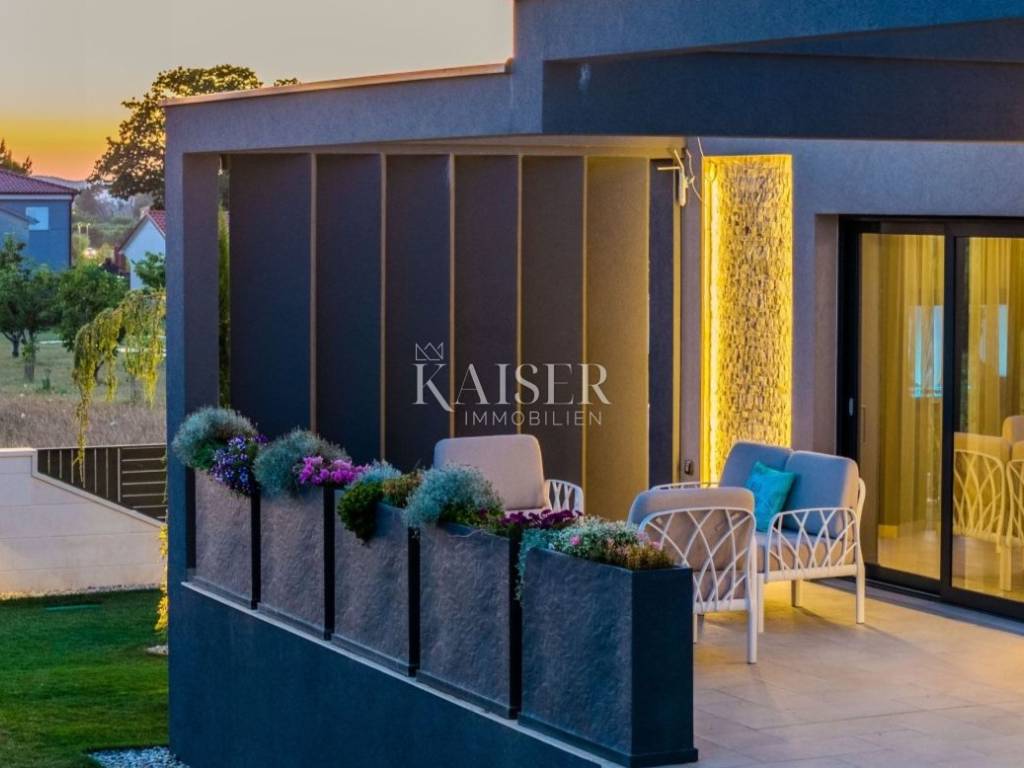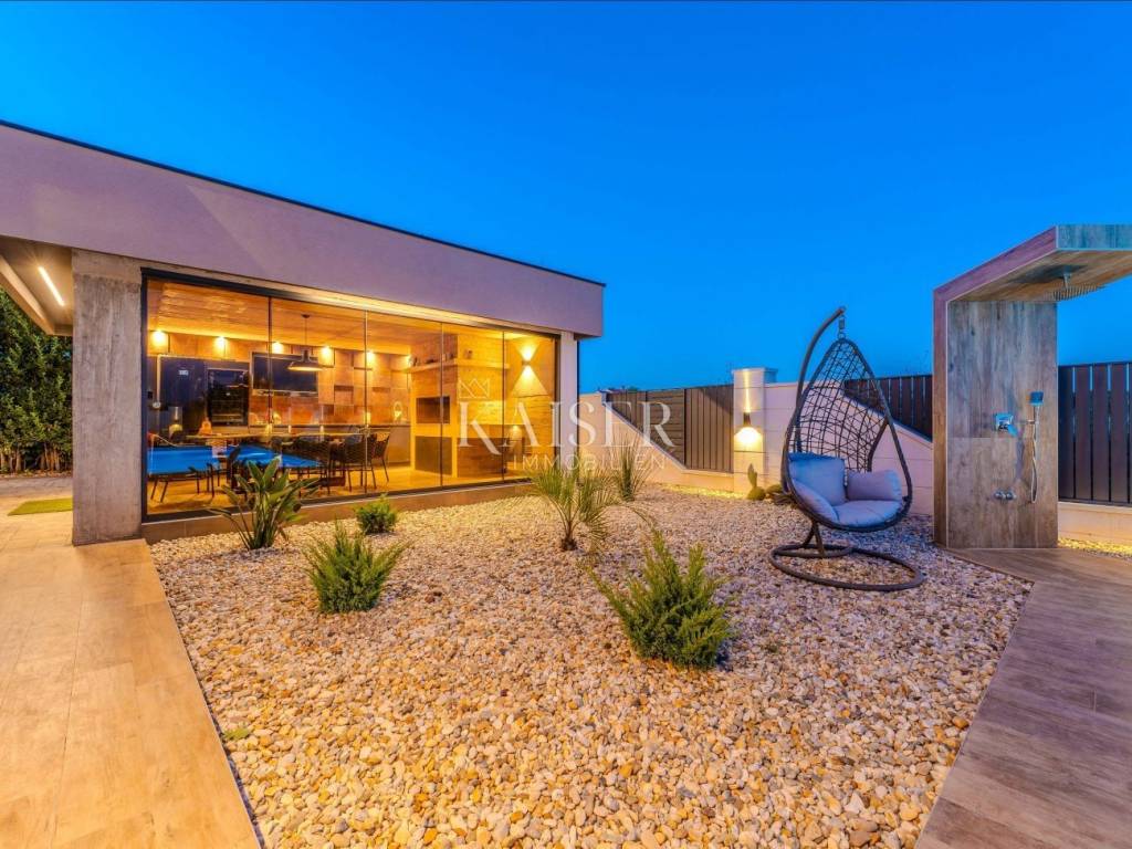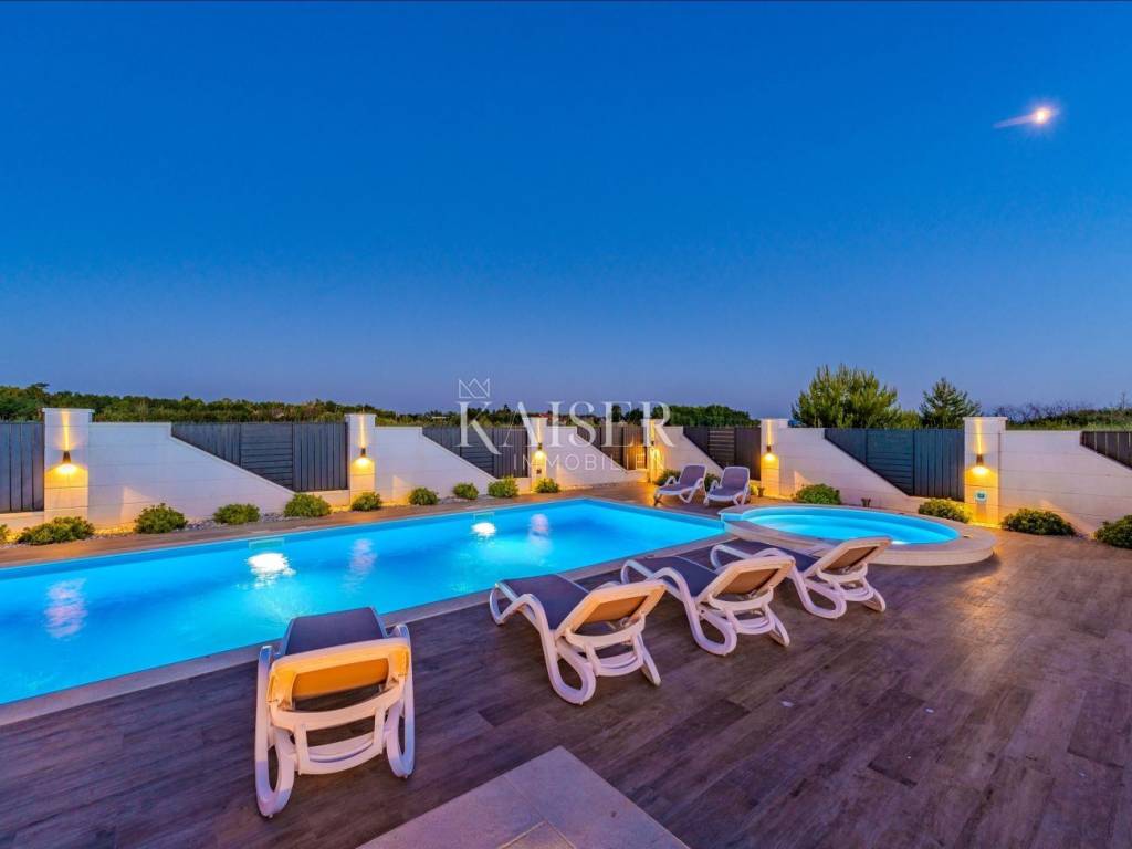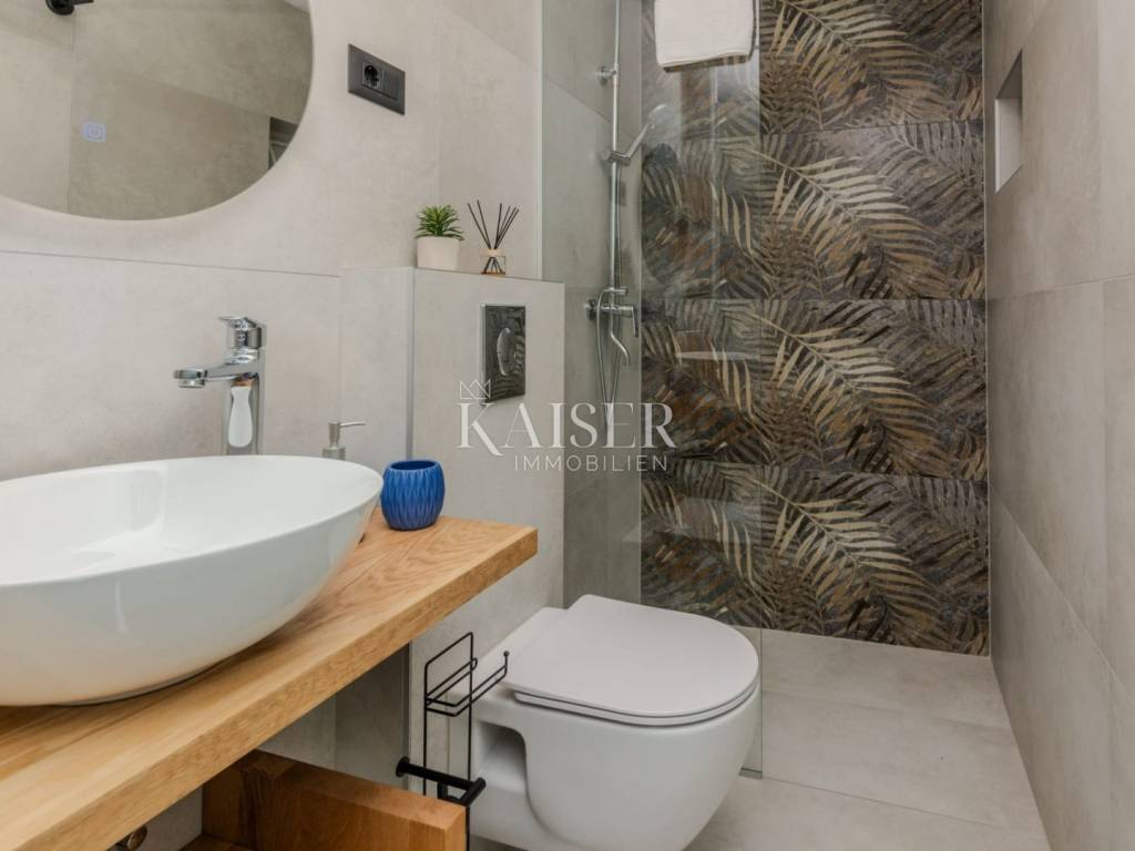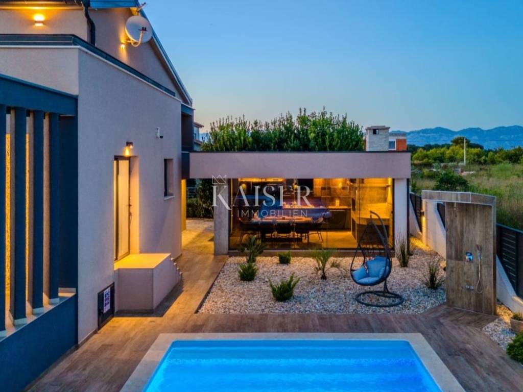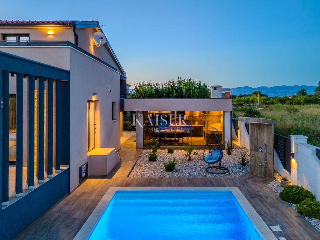 Es gibt Orte, die keine Aufmerksamkeit erfordern – sie gehören ganz natürlich einem. Räume mit einem unaufdringlichen Gefühl von Güte. Kaiser Immobilien präsentiert diese wunderschöne Villa in Privlaka bei Zadar, die nicht nur Architektur, Quadratmeterzahl und Luxus verkörpert. Sie vermittelt ein Gefühl von Ort, Raum und Zeit. Das Gefühl, dort angekommen zu sein, wo man hingehört. Hier sind die Morgen und Nächte duftend und ruhig. Von jedem Zimmer dieser wunderschönen Villa schweift der Blick über Weinberge, Olivenhaine und Felder bis hin zum Meer, das weit am Horizont dieses Bild vollkommener Freiheit abschließt. Auf einem 913 m² großen Grundstück gelegen, umgeben von nichts als Natur, fügt sich diese moderne, 350 m² große Villa in die Umgebung ein, ohne sich aufzudrängen. Dank ihrer eigenen Solaranlage ist sie autark und völlig energieunabhängig. Der Zugang zum Anwesen erfolgt über ein automatisches Türsystem mit ferngesteuertem Öffnen und Schließen, das zur Eingangshalle mit eigener Veranda führt. Der Haupteingang ist über eine Treppe erreichbar. Sicherheit und Zugangskontrolle werden durch eine Gegensprechanlage und Videoüberwachung gewährleistet. Beim Betreten des Anwesens eröffnet sich ein freier Blick auf den angelegten Garten mit seinen üppigen mediterranen Pflanzen und der großzügigen Rasenfläche, die ein Gefühl von Privatsphäre und Komfort vermitteln. Im Zentrum des Gartens befindet sich ein beheizter Swimmingpool mit integriertem Whirlpool-Massagebereich, Außendusche und Liegewiese – ein idealer Ort, um warme Tage zu genießen. Eine besondere Ergänzung dieses Außenbereichs ist das Poolhaus mit einer voll ausgestatteten Sommerküche, die fast das ganze Jahr über die perfekte Umgebung für geselliges Beisammensein und Leben im Freien schafft. Das Haus erstreckt sich über drei Etagen, von denen jede ihre eigene Funktion und Geschichte hat und zusammen einen harmonischen, durchdachten Wohnraum schafft. Im Erdgeschoss befindet sich ein Erholungs- und Entspannungsbereich – ein modernes Fitnessstudio, ein Ruhebereich – ein Heimkino, das zusätzlich mit einer separaten Toilette für mehr Komfort ausgestattet ist. Die mittlere Etage, die gleichzeitig die Haupteingangsebene darstellt, umfasst eine Gästetoilette und einen langen Flur, der zu den Hauptwohnbereichen führt. Es gibt eine beeindruckende Küche, ausgestattet mit modernen Geräten und einer Kochinsel mit viel Stauraum, ein geräumiges, elegant eingerichtetes Esszimmer und ein Wohnzimmer, in dem der Kamin im Mittelpunkt steht – als Quelle der Wärme und einer gemütlichen Atmosphäre. Große Glaswände verwischen die Grenze zwischen Innen- und Außenbereich, verbinden die Wohnbereiche mit dem Garten und schaffen ein Gefühl von fließender, luftiger Atmosphäre und ständiger Verbundenheit mit der Natur. Der Wohnbereich öffnet sich zu einer Terrasse mit einer Kombination aus Ess- und Loungebereich – der perfekte Ort für den Morgenkaffee, zum Lesen oder für ruhige Abende bei Sonnenuntergang und geselliges Beisammensein im Freien. Die Terrasse geht nahtlos in eine Rasenfläche, ein Sonnendeck, einen Swimmingpool und einen Kinderspielplatz über und schafft so einen nahtlosen Wohnraum – vom Zuhause in die Natur. Im zweiten Stock befinden sich drei Schlafzimmer und ein luxuriöses, geräumiges Badezimmer, während im dritten Stock zwei Hauptschlafzimmer liegen – jedes mit eigenem Bad, eines mit Zugang zu einer großen Terrasse mit Sonnendeck und eines mit einem schattigen, gemütlichen kleinen Schlafzimmer. Der Ausblick aus jedem Zimmer inspiriert, entspannt und inspiriert. Die Villa ist hervorragend ausgestattet und sofort bezugsfertig. Es ist aus hochwertigen Materialien gebaut und mit Fußbodenheizung, Heiz- und Kühlsystem, PVC-Tischlerei, Sicherheitstüren und Videoüberwachung ausgestattet. Es hat einen eigenen Eingang, geräumige Terrassen, große Glaswände und einen zusätzlichen Parkplatz. Es enthält zwei reich ausgestattete Küchen – eine Innenküche mit erstklassigen modernen Geräten und eine Außenküche am Pool. Klimaanlage, Video-Gegensprechanlage, ein Rasenmäher neben dem Haus (automatisches Mähsystem), ein Bohrloch mit eigenem Bewässerungssystem und alle Strom- und Wasseranschlüsse sind bezahlt. Das Eigentum ist ordentlich. Diese Villa ist für diejenigen, die unaufdringlichen Luxus verstehen – moderne Naturliebhaber, kreative Menschen – diejenigen, die Raum zum Schaffen, Atmen und Leben in Balance suchen. Privlaka bietet genau das – den unaufdringlichen natürlichen Charme eines dalmatinischen Fischerdorfes für wahre Liebhaber dieser Region oder für diejenigen, die sich noch nicht von Privlakas langsamem Tempo erobern lassen haben, eine Flucht vor der geschäftigen Stadt, eine Flucht vor dem Smog der Großstadt, Abstand vom Lärm, aber nicht vom Inhalt. Hier kennt man seine Nachbarn noch beim Namen und das Meer ist nur ein paar Minuten entfernt. Die Stadt selbst hat alle Annehmlichkeiten, die man für das tägliche Leben braucht: Geschäfte, Supermärkte, eine Apotheke, eine Schule, einen Kindergarten, Cafés, Restaurants. Und wenn Sie mehr wollen – Zadar mit seinem internationalen Flughafen, Spitzenrestaurants, Museen und Jachthäfen ist nur zwanzig Autominuten entfernt und in nur einer halben Stunde zu erreichen. Im Umkreis von einer Autostunde liegen einige der schönsten Naturparks und Nationalparks Kroatiens – Nationalpark Kornati, Paklenica, Vrana-See, Velebit – perfekt für Tagesausflüge, Segeln, Wandern oder einfach zum tief Durchatmen. Nähe zu Stränden und Promenaden: Nächster Strand – 800 m Die wichtigsten Sandstrände von Privlaka (Sabunike, Bilotinjak, Škrapavac) – im Umkreis von 1 bis 3 km Promenaden am Meer ziehen sich kilometerweit an der Küste entlang – ideal für Morgenspaziergänge, Joggen, Radfahren oder Entspannen bei Sonnenuntergang. In der Nähe der Nin-Salzebenen, einem heilenden, schlammreichen