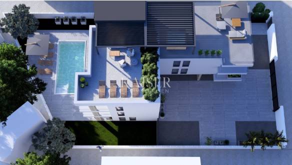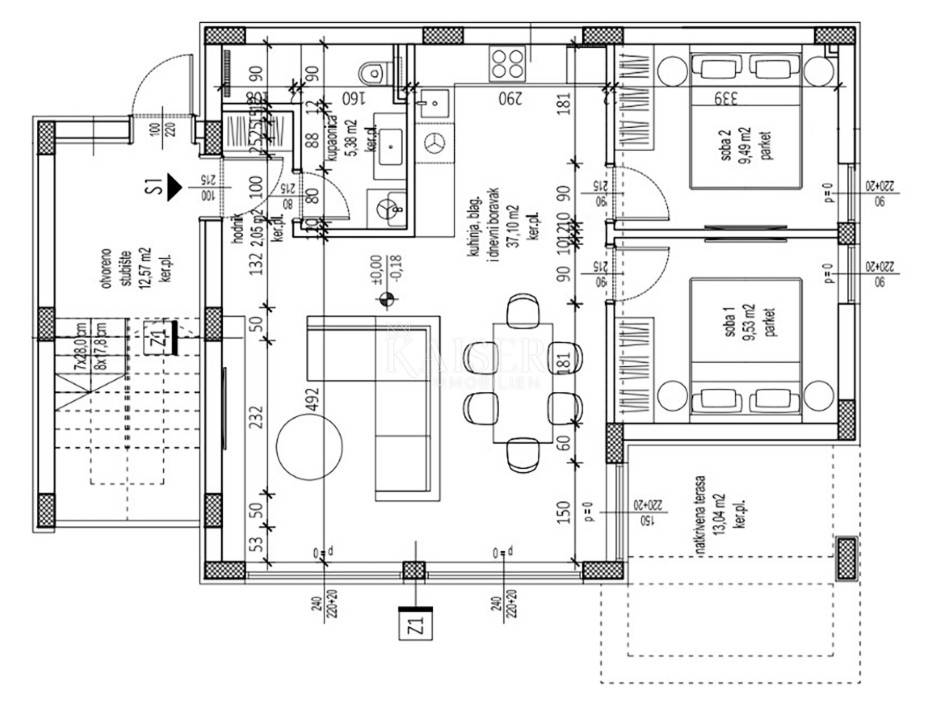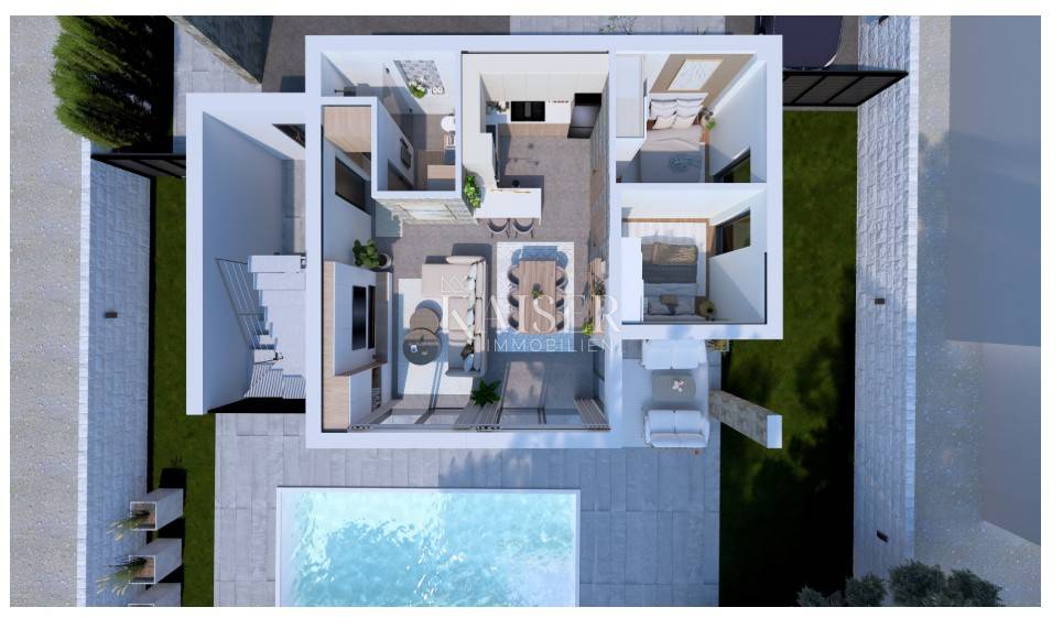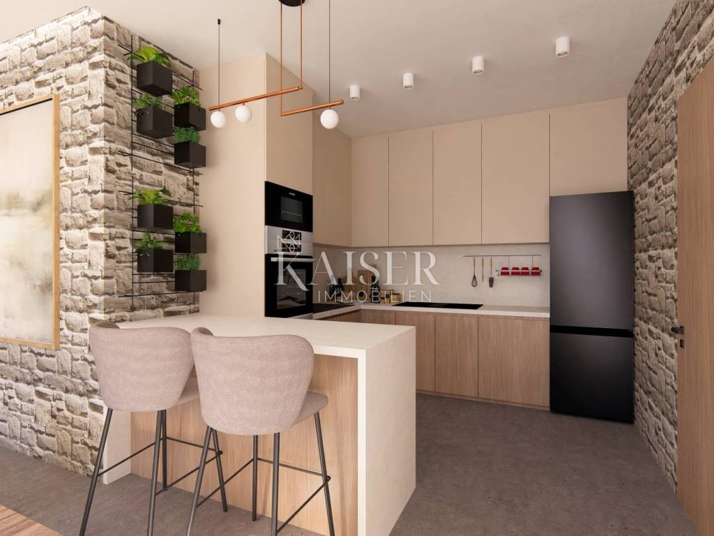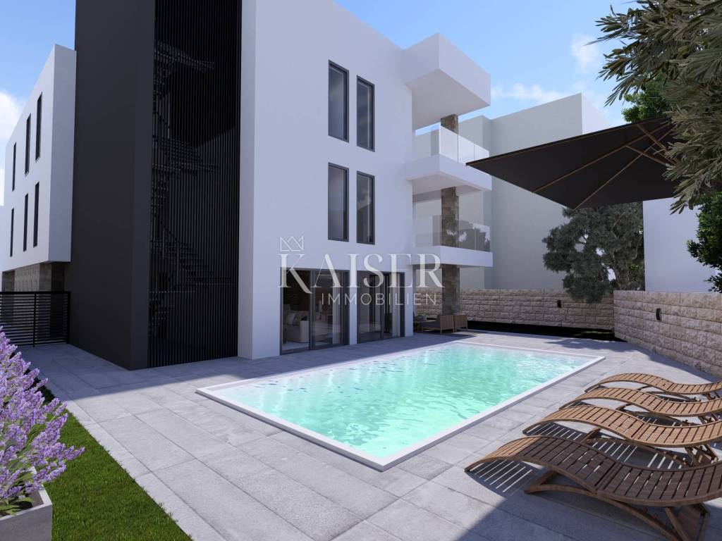 Kaiser Immobilien präsentiert: Luxuriöse Erdgeschosswohnung (S1) mit großem Garten und privatem Pool, Petrčane. Im malerischen dalmatinischen Dorf Petrčane, unweit von Zadar, befindet sich diese einzigartige, luxuriös ausgestattete Wohnung im Erdgeschoss einer modernen Stadtvilla. Mit einem großzügigen privaten Garten, einem großen Pool und zwei Terrassen bietet diese Immobilie alle Annehmlichkeiten eines Hauses, kombiniert mit dem Komfort einer Wohnung, in einer äußerst begehrten Lage. ÜBER DIE OBJEKT: Die Wohnung wurde sorgfältig gestaltet, um maximalen Komfort, Luxus und Naturverbundenheit zu bieten. Große Glaswände im Wohnzimmer sorgen für viel Tageslicht und bieten einen wunderschönen Blick auf Pool und Garten. Bezeichnung: Wohnung S1 (Erdgeschoss, Nordwesten) Preis: [Preis eingeben] € Gesamtnutzfläche: 101,48 m² (Gesamtfläche inkl. Anbauten 263,82 m²) AUFTEILUNG DER WOHNUNG (63,55 m²): Wohnbereich (offener Raum): Großzügige Küche mit L-Bar, Essbereich und Wohnzimmer (37,10 m²), die das Herzstück der Wohnung bilden, mit Kamin und direktem Zugang zur Terrasse und zum Garten. Zwei komfortable Schlafzimmer: Zimmer 1: 9,53 m² Zimmer 2: 9,49 m² Badezimmer (5,38 m²): Elegantes Badezimmer mit Dusche und Platz für Waschmaschine und Trockner. Flur (2,05 m²): Verbindet alle Zimmer. PRIVATER AUSSENBEREICH UND ANBAUTEN: Privater Pool (7,6 x 4 m): Genießen Sie absolute Privatsphäre und Erfrischung in Ihrem eigenen großen Pool. Großer privater Garten (101,53 m²): Eine weitläufige grüne Oase zum Entspannen, Spielen und geselligen Beisammensein. Zwei Terrassen: Eine überdachte Terrasse (13,00 m²) und eine zusätzliche, nicht überdachte Terrasse (58,24 m²). Zwei Parkplätze: Zur Wohnung gehören zwei Parkplätze – einer überdacht (13,75 m²) und einer nicht überdacht (13,75 m²). Hochwertige Ausstattung: Böden: Alle Wohnungen sind mit Parkett und erstklassigen Keramikfliesen ausgestattet. Hochwertige Bauweise: Das Gebäude wird nach höchsten Standards errichtet und garantiert so Langlebigkeit und niedrigen Energieverbrauch. Lage: Petrčane ist bekannt für seine wunderschönen Strände, das kristallklare Meer und das vielfältige touristische Angebot. Die Nähe zur historischen Stadt Zadar, zum Flughafen und zu Nationalparks macht diesen Ort ideal für ein ruhiges Familienleben und einen luxuriösen Urlaub. Diese Wohnung ist eine außergewöhnliche Gelegenheit für alle, die eine Immobilie suchen, die alle Annehmlichkeiten einer Luxusvilla bietet – einen weitläufigen Garten, einen großen Swimmingpool und absolute Privatsphäre, alles in fußläufiger Entfernung zum Meer. Die Maklerprovision für den Käufer beträgt 3 % zzgl. MwSt. und wird im Falle eines Immobilienkaufs mit Abschluss der ersten notariellen Urkunde fällig. Eine Besichtigung ist nur nach vorheriger Unterzeichnung eines Vermittlungsvertrags für Immobiliengeschäfte möglich. Wenn Sie die Immobilie persönlich besichtigen möchten, kontaktieren Sie bitte: Joško Bašić, E-Mail: josko@kaiser-immobilien.hr, Tel.: +385-91-511-2993, http://kaiser-immobilien.hr/