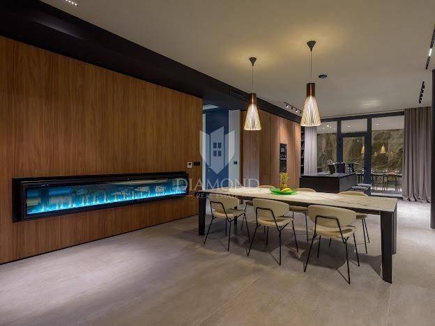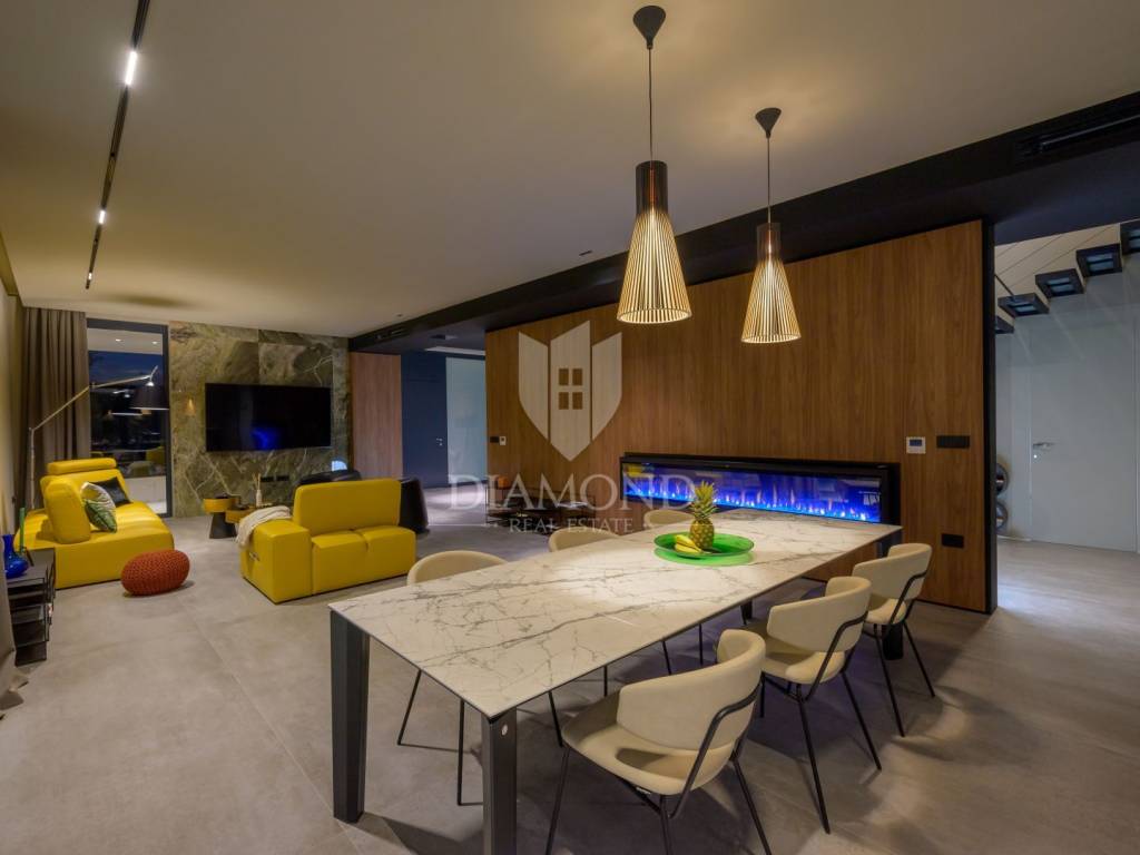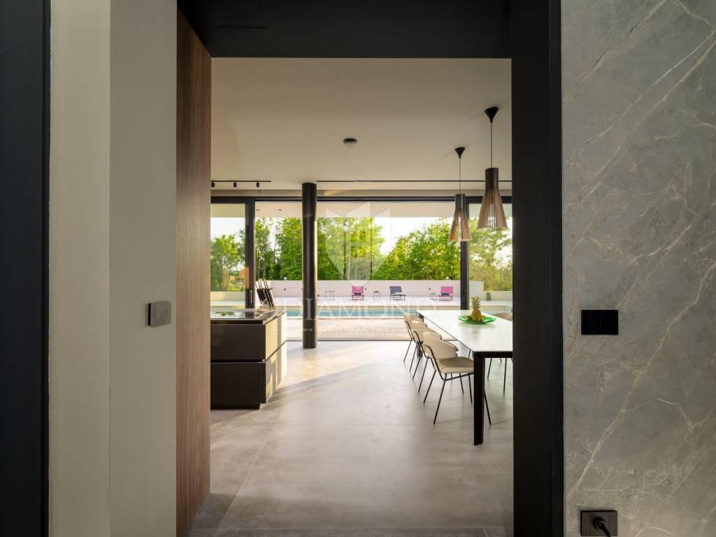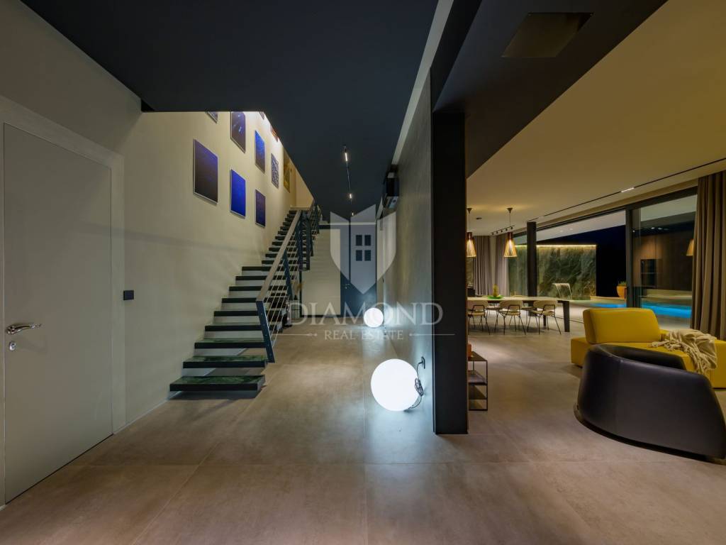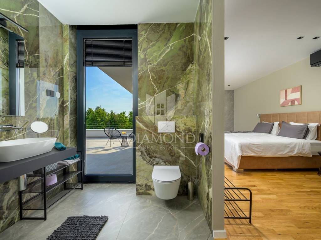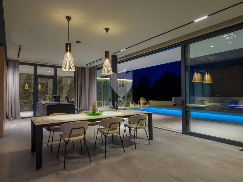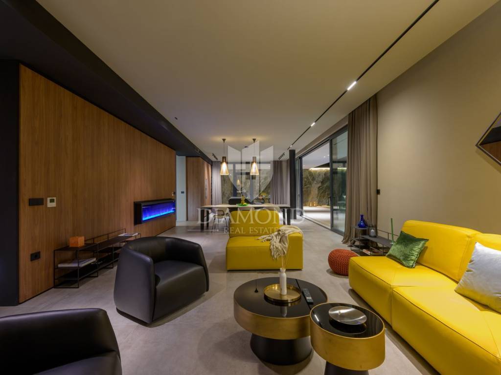 Die Villa befindet sich auf einem Grundstück mit einer Fläche von 2150 m2. Die Villa erstreckt sich über 300m2 das Erdgeschoss und eine Etage . Im Erdgeschoss des Hauses befindet sich ein mit luxuriösen italienischen Möbeln aus echtem Leder ausgestattetes Wohnzimmer, eine hochwertige, ebenfalls in Italien gefertigte Küche mit Nef-Einbaugeräten und ein Essbereich. Küche und Wohnzimmer sind nach dem Open-Space-Prinzip gestaltet, von dem aus man Zugang zu einer überdachten Terrasse von 222m2 und einem Strand mit einer Gesamtfläche von 160m2, einem 15 Meter langen Pool (61m2) mit Salzwasser und einem Platz hat zum geselligen Beisammensein. Am Rand des Pools befindet sich außerdem eine voll ausgestattete Außenküche. Im Erdgeschoss des Hauses gibt es eine Toilette, Platz für eine Waschmaschine und ein Bügeleisen. Eine Marmortreppe führt in die erste Etage des Hauses, wo sich 3 luxuriös eingerichtete Schlafzimmer, Hespo-Programm 5*, befinden, von denen jedes über ein eigenes Badezimmer mit Geräten von Hans Grohe und Axor sowie separate Terrassen verfügt. Jede Terrasse bietet einen herrlichen Blick in die Natur, der einem den Atem raubt.