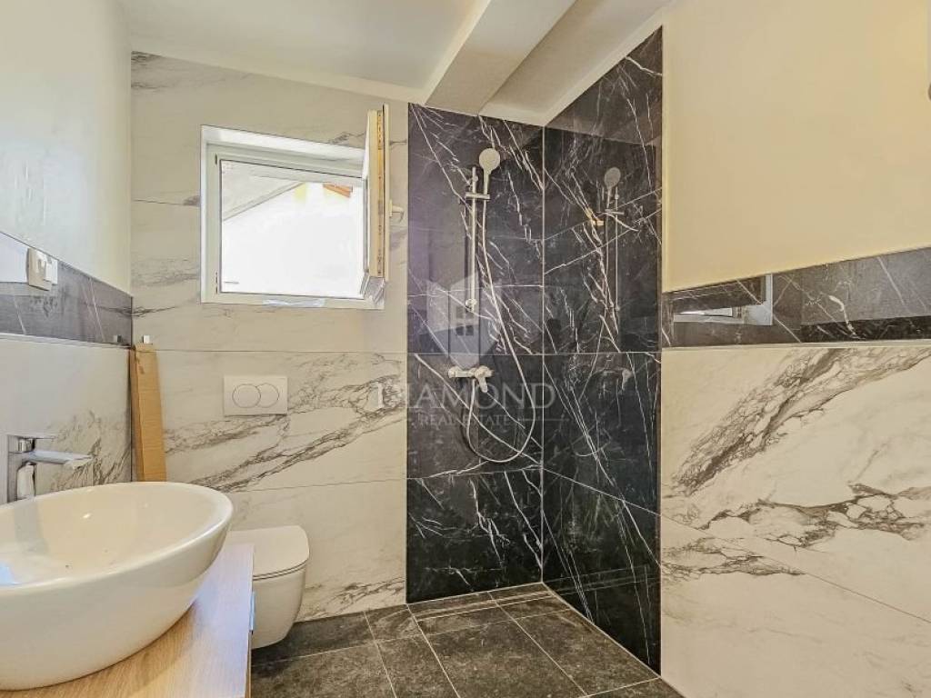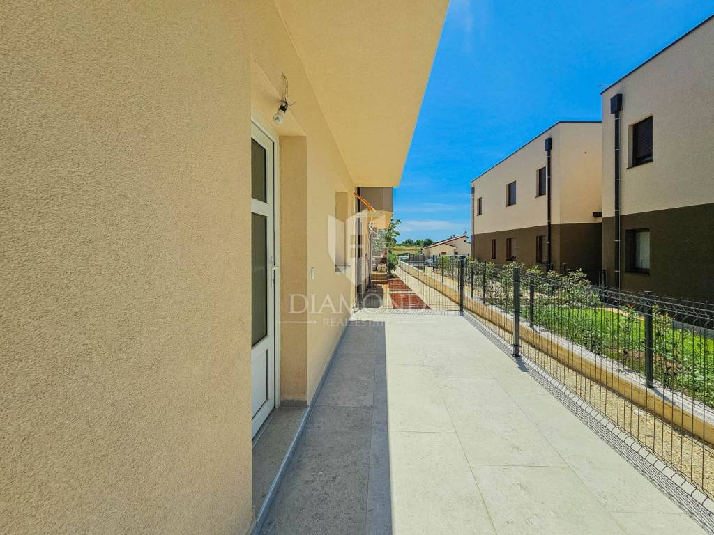 In attraktiver Lage, nur 2 km vom Meer und wenige Autominuten vom Zentrum Novigrads entfernt, befindet sich diese moderne Wohnung im Erdgeschoss eines Neubaus.