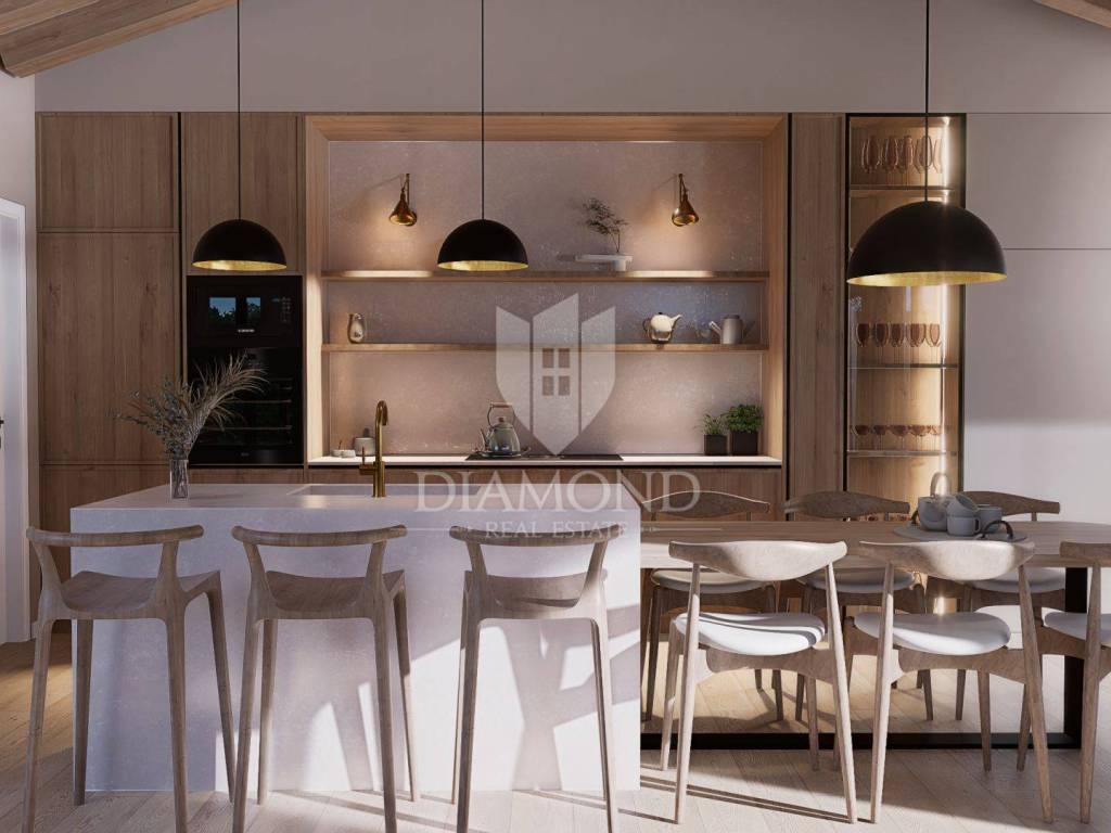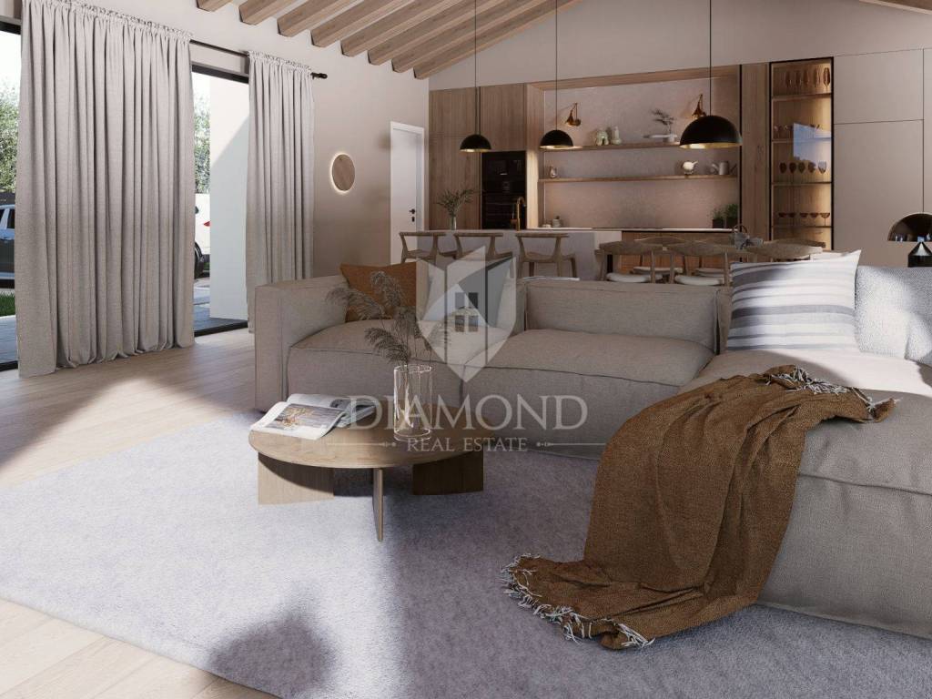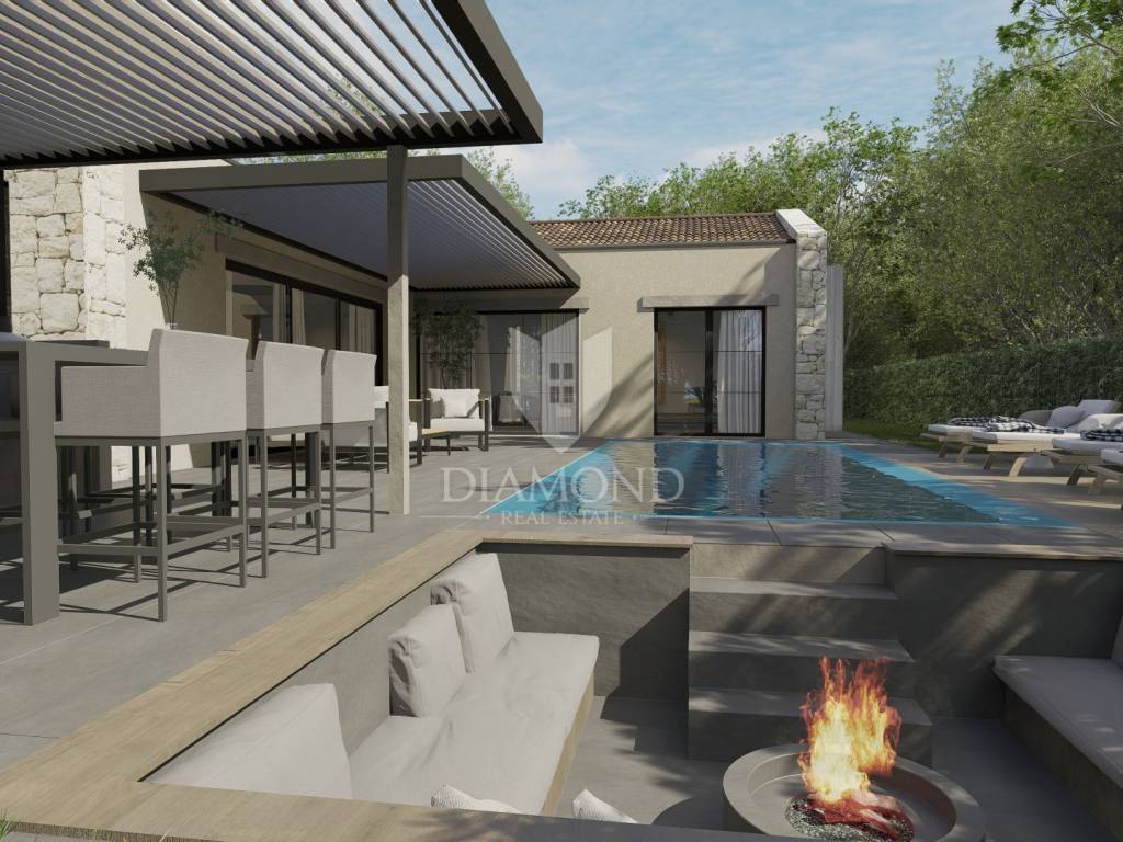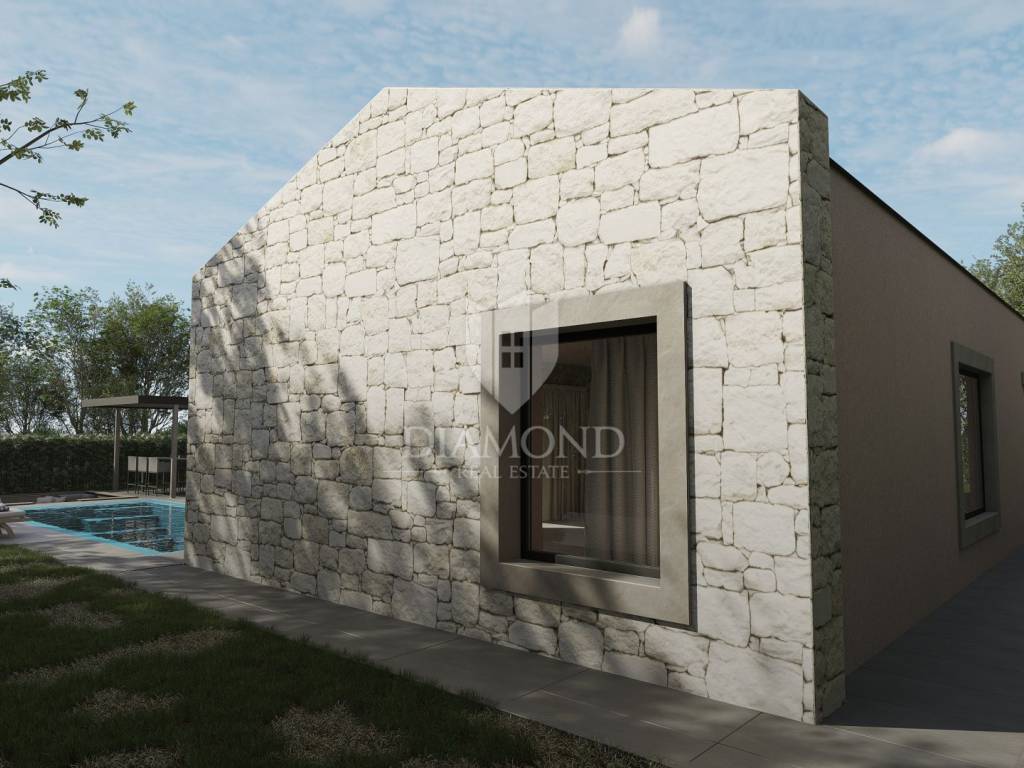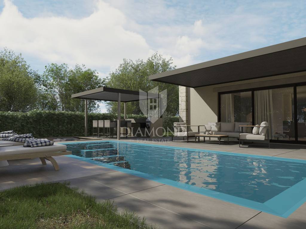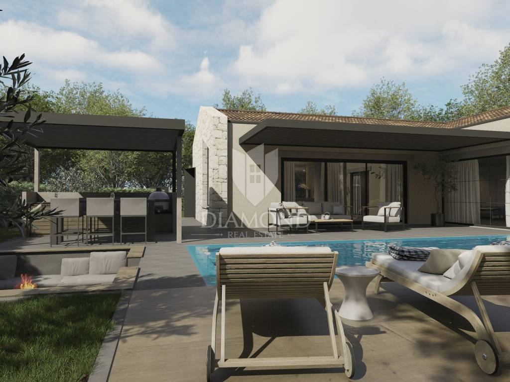 Istrien, Poreč – modernes einstöckiges Haus mit Swimmingpool in ruhiger Lage In ruhiger Lage in der Nähe von Poreč, umgeben von Grün und Wäldern, befindet sich dieses modern gestaltete einstöckige Haus, das die perfekte Kombination aus Privatsphäre, Komfort und modernem Lebensstil bietet. Die Nähe zu allen Annehmlichkeiten und der einfache Zugang zum Meer machen diese Immobilie zu einer idealen Wahl für ein Familienheim oder eine luxuriöse Ferieninvestition. Auf einem 735 m² großen Landschaftsgrundstück befindet sich eine Villa mit einer Gesamtwohnfläche von 150 m² und einem angelegten Außenbereich zum Entspannen und für geselliges Beisammensein. Der Außenbereich ist für vollkommenen Genuss konzipiert – es gibt einen Swimmingpool, ein Sonnendeck, einen Loungebereich, eine Außenküche und drei Parkplätze. Der Innenbereich ist sorgfältig gestaltet, um alle Bedürfnisse des modernen Lebens zu erfüllen. Das geräumige Wohnzimmer, das mit der Küche und dem Esszimmer verbunden ist, erstreckt sich über mehr als 60 m², während drei Schlafzimmer über eigene Badezimmer verfügen. Ein zusätzliches kleineres Badezimmer ist für Gäste vorgesehen. Große Glaswände lassen viel natürliches Licht herein und geben den Blick auf den angelegten Garten und die umliegende Natur frei. Die Umgebung bietet absolute Privatsphäre und Ruhe, während die Nähe zur Stadt alle Annehmlichkeiten des urbanen Lebens bietet. Dieses elegante einstöckige Haus stellt eine harmonische Verbindung aus moderner Architektur, Komfort und Natur dar. Die Immobilie wird schlüsselfertig verkauft. Geplante Fertigstellung: Ende 2026. Verpassen Sie nicht die Gelegenheit, Eigentümer dieser außergewöhnlichen Villa in der Nähe von Poreč zu werden – kontaktieren Sie uns und buchen Sie Ihren Besichtigungstermin!