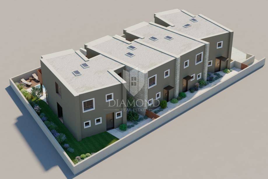 In einer ruhigen Gegend bei Rovinj, nur fünf Kilometer vom Meer entfernt, befindet sich dieses anspruchsvolle Reihenhaus, das authentischen istrischen Charme perfekt mit modernem Design verbindet. Mit einer Wohnfläche von 148,56 m² und einem Grundstück von 105 m² bietet dieses zweistöckige Haus ein geräumiges und funktionales Zuhause für komfortables Wohnen. Das Erdgeschoss zeichnet sich durch einen großzügigen offenen Wohnbereich aus, der Wohnzimmer, Esszimmer und Küche vereint, sowie einem Technikraum, einer Garderobe, einem Gäste-WC und einem Abstellraum. Eine große Aluminiumschiebetür verbindet den Innenraum mit der überdachten Terrasse, der Sommerküche, dem Sonnenbereich und dem Pool mit modernster Salzelektrolysetechnik und Vorbereitung für die Wasserheizung.