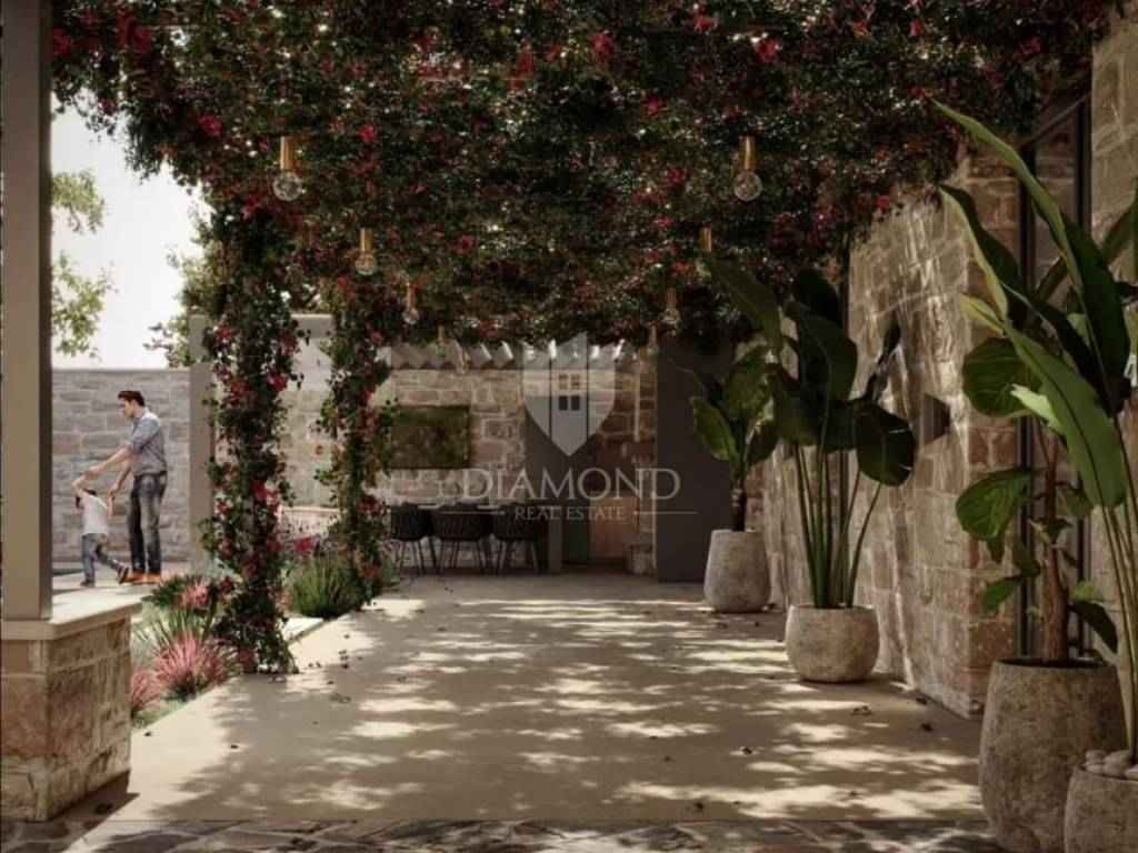 Das Haus ist vollständig renovierungsbedürftig. Ein fertiges Projekt eines renommierten kroatischen Architekten sowie sämtliche erforderliche Unterlagen liegen vor. Laut Projekt erstreckt sich das Haus über zwei Etagen. Im Erdgeschoss ist ein offener Wohnbereich mit Küche und Essbereich vorgesehen, zusätzlich ein WC, ein Technikraum und ein Abstellraum. Im Obergeschoss sind drei Schlafzimmer geplant, jeweils mit eigenem Badezimmer. Von der Immobilie bieten sich schöne Ausblicke auf die Altstadt von Bale, das Grün der Natur und Olivenhaine.
