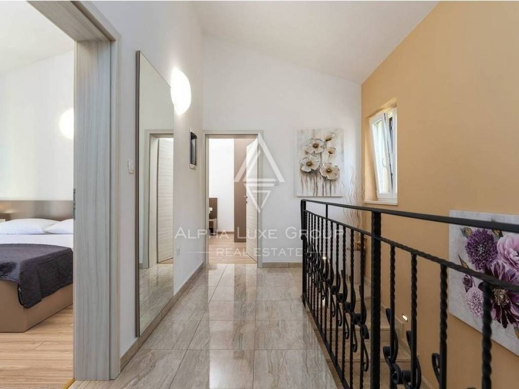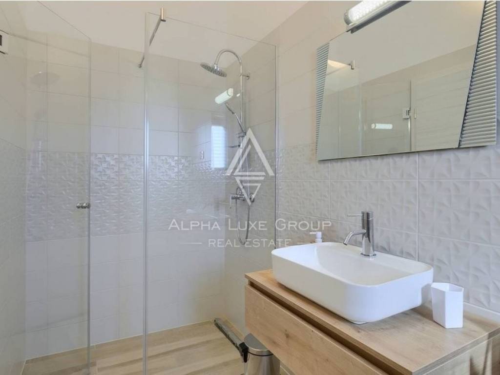 Die 245 m² große Villa erstreckt sich über zwei Etagen und umfasst ein separates 35 m² großes Apartment sowie zusätzliche Einrichtungen. Das Hauptgebäude umfasst 168 m² mit einem einladenden Wohnbereich im Erdgeschoss, der in eine moderne Küche mit Essbereich übergeht und Zugang zu einer Außenküche für den Sommer bietet. Ebenfalls im Erdgeschoss befinden sich ein Gäste-WC, ein Abstellraum und ein Wäscheraum. Im Obergeschoss verfügen drei Schlafzimmer jeweils über ein eigenes Badezimmer und teilen sich einen großen Balkon mit atemberaubendem Blick auf die ruhige Umgebung.