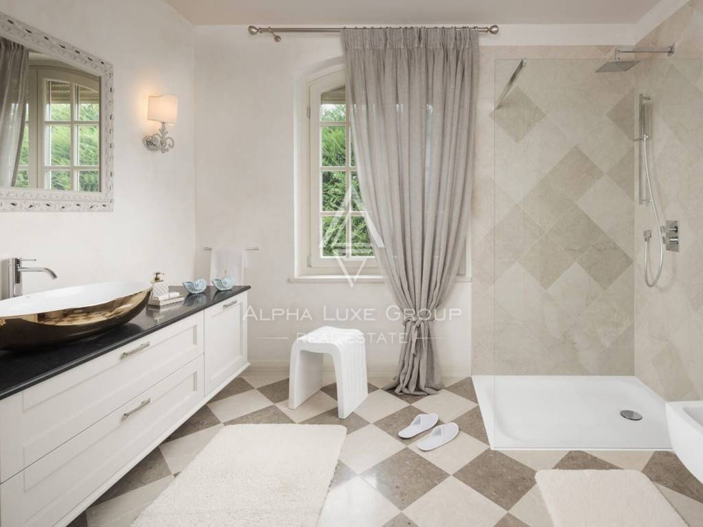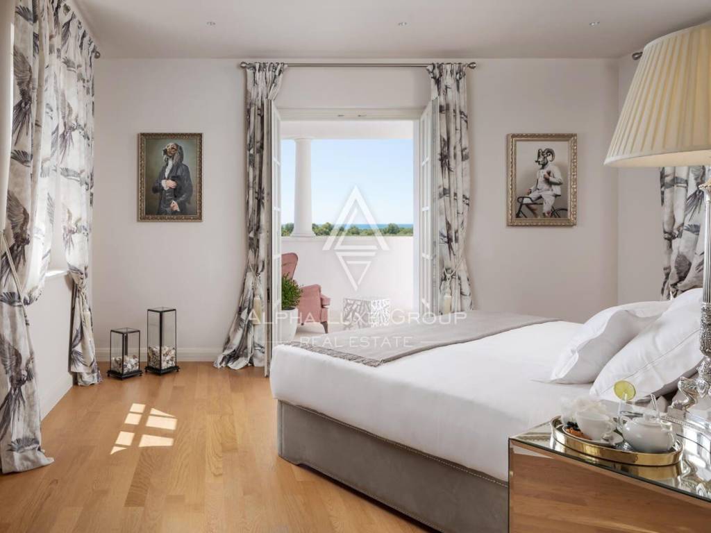 Im ersten Stock befinden sich drei Schlafzimmer, jedes mit eigenem Bad. Ein Schlafzimmer bietet eine Pergola mit direktem Zugang zum Pool, während die anderen zwei über private Balkone verfügen. Eine große Terrasse mit Lounge-Bereich und Sonnenliegen bietet einen spektakulären Blick auf die Adria. Die Villa ist vollständig klimatisiert und mit Fußbodenheizung ausgestattet. Das Anwesen bietet auch private Parkplätze.