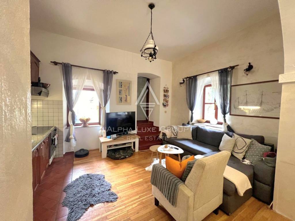 Hohe Decken und erhaltene Gewölbe im Wohnzimmer schaffen ein einzigartiges Ambiente, das in Neubauten nicht zu finden ist. Zwei Schlafzimmer, ein modernes Badezimmer und eine Terrasse – eine echte Rarität in der Altstadt – machen den Raum äußerst funktional und attraktiv.