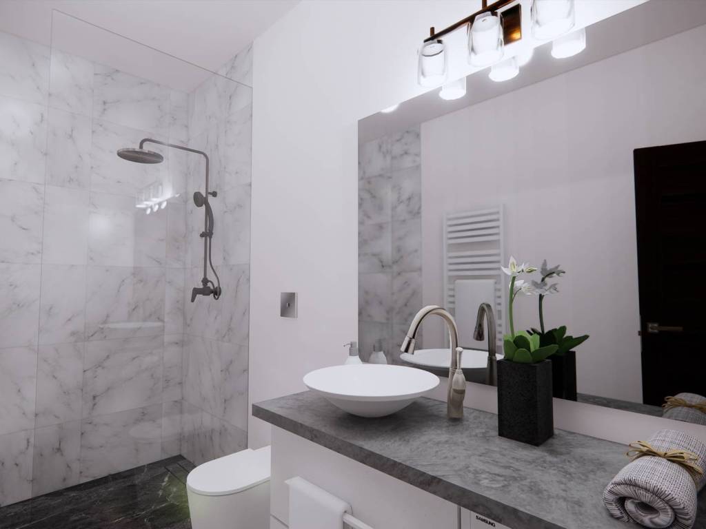 - Badezimmer mit keramischen Fliesen (Auswahl nach Käuferwunsch innerhalb eines bestimmten Preisrahmens)