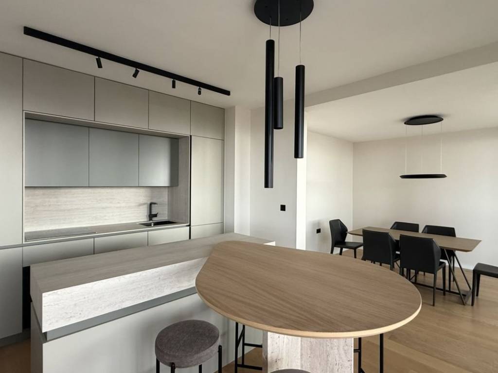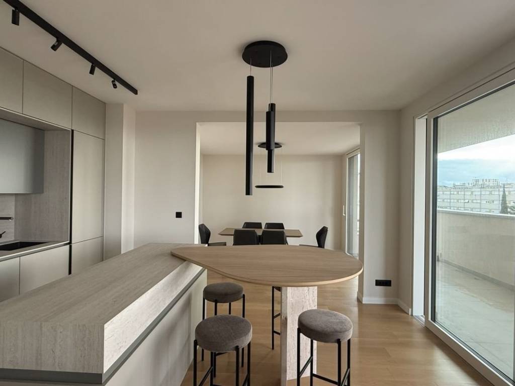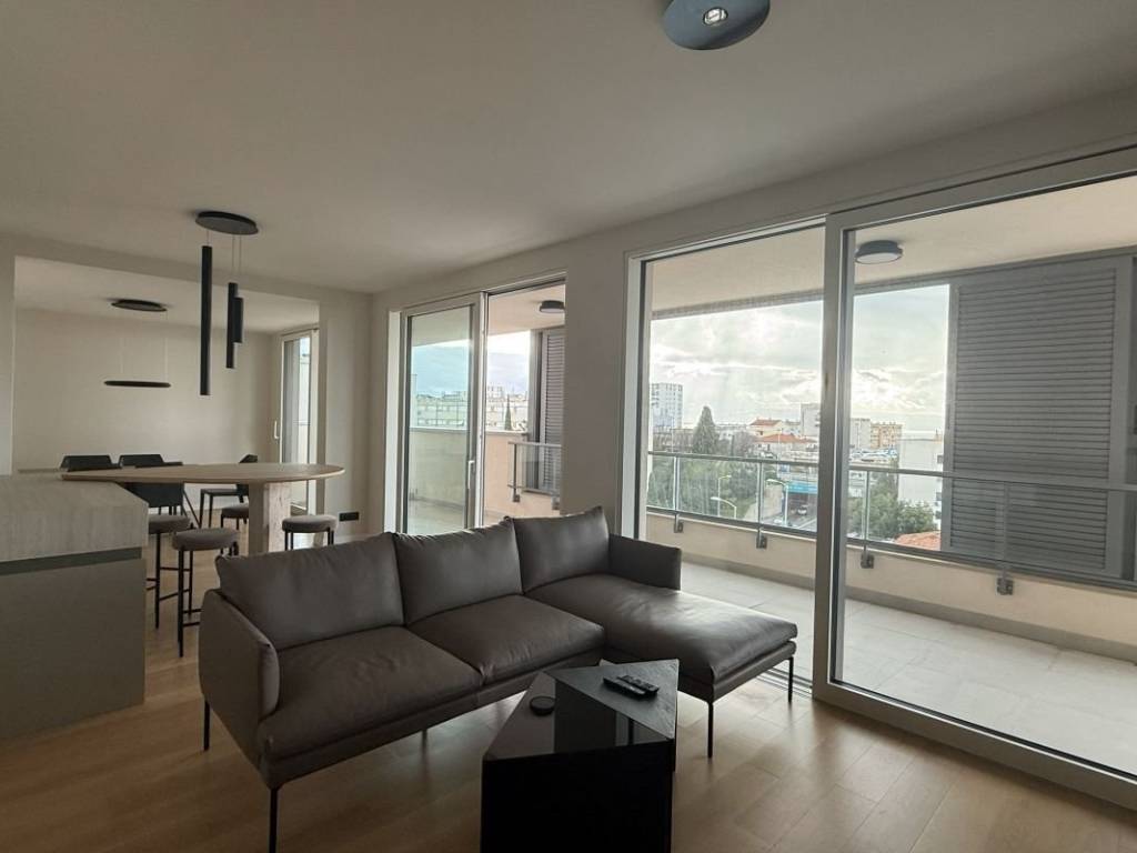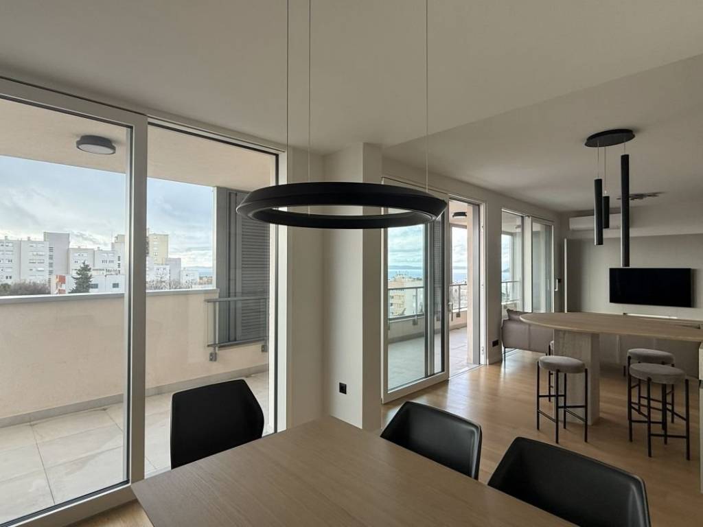 Zu vermieten: Designer-Penthouse mit zwei Schlafzimmern in einem Neubau nahe dem Zentrum von Split. Die Wohnung besticht durch luxuriöse Ausstattung, Privatsphäre und Ruhe und ist somit ideal für den Alltag – ob urbanes oder ruhiges Leben. Zwei Garagenstellplätze sorgen für zusätzlichen Komfort. Die Wohnung bietet ca. 80 m² Wohnfläche sowie ca. 70 m² Terrasse und Balkon. Vom Eingangsbereich gelangt man in einen offenen Wohnbereich mit Wohnzimmer, Küche und Esszimmer sowie einem weiteren Badezimmer, einem Gäste-WC und zwei Schlafzimmern. Ein Schlafzimmer öffnet sich zur nach Süden ausgerichteten Hauptterrasse mit herrlichem Blick auf das Meer und die Stadt, während das zweite Schlafzimmer über einen eigenen, ca. 10 m² großen Balkon verfügt. Vom Wohnbereich aus erreicht man eine großzügige Terrasse mit Blick auf das Meer und die vorgelagerten Inseln. Die geschmackvolle Einrichtung der Immobilie, die Klimaanlage in allen Räumen sowie der direkt mit der Wohnung verbundene Aufzug tragen zusätzlich zum angenehmen Wohngefühl bei. Die Lage der Immobilie ist ideal für den Alltag, da sich alle Annehmlichkeiten des täglichen Lebens in unmittelbarer Nähe befinden – egal ob für einen urbanen Lebensstil oder ein Familienleben.