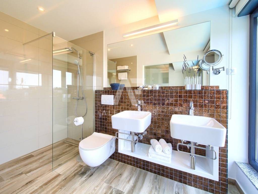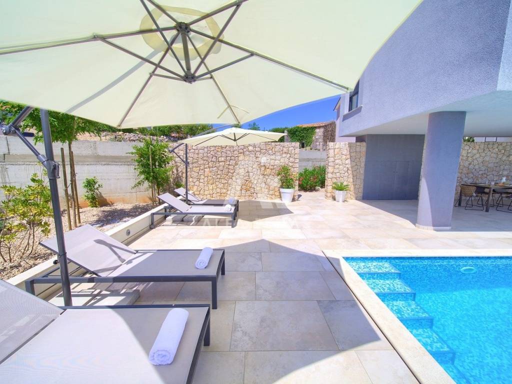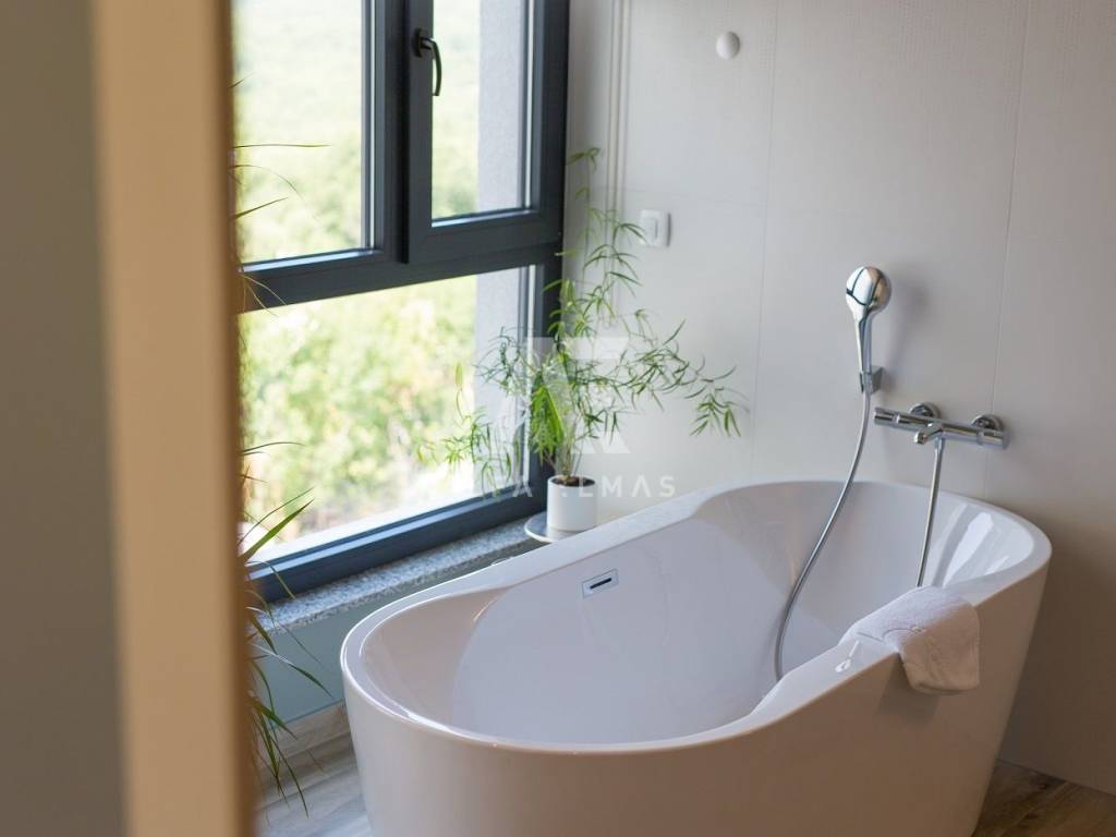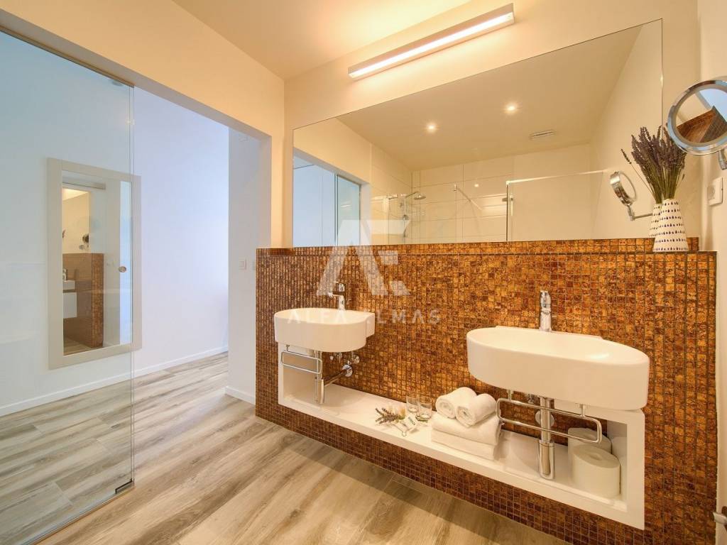 Krk, Umgebung, Luxusvilla mit Pool und Sauna zu verkaufen!! Luxusvilla in der Nähe von Krk mit modernen Elementen, Wohnfläche von 223 m2, auf einem Grundstück von 591 m2 und einem 400 m2 großen Garten, in dem sich ein wunderschöner Überlaufpool von 32 m2 befindet. Die Villa erstreckt sich über drei Etagen. Im Untergeschoss der Villa befindet sich ein Wellnessbereich mit Badezimmer, Heizraum und Abstellraum. Das Erdgeschoss besteht aus einem geräumigen und luftigen Wohnzimmer, einer Küche, einem Esszimmer, einer Toilette und einer Innentreppe, die in den ersten Stock führt, wo sich drei Schlafzimmer mit jeweils eigenem Bad und einer Terrasse mit herrlichem Meerblick befinden. Die Ausstattung der Villa auf Krk umfasst hochwertige Keramik, PVC-Tischlerei, hochwertige Sanitärkeramik, Sat-TV, Klimaanlage in den Zimmern und im Wohnzimmer. Das Grundstück der Villa ist mit mediterranen Pflanzen geschmückt, Parkplatz für zwei Autos. Die Villa befindet sich ca. 3000 m von Krk entfernt, gepflegte Strände und begleitende Annehmlichkeiten. Dokumentation in Ordnung!!