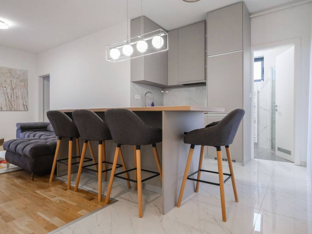 Stan je moderno uređen i svijetao te u potpunosti opremljen, spreman za useljenje bez dodatnih ulaganja. Sastoji se od dnevnog boravka povezanog s kuhinjom i blagovaonicom, spavaće sobe, kupaonice i terase.