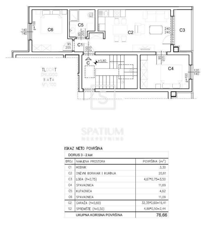 Die Wohnung befindet sich im zweiten Stock des Gebäudes und verfügt über eine gesamte Nettofläche von 76,66 m², einschließlich Wohnfläche, Loggia, Garagenstellplatz und Abstellraum im Erdgeschoss. Die Wohnfläche von 54,81 m² besteht aus einem großzügigen Wohnzimmer mit Küche und Essbereich, zwei Schlafzimmern, einem Badezimmer und einem Flur, während die Loggia einen angenehmen Außenbereich zum Entspannen bietet. Die Wohnung ist auf eine optimale Raumaufteilung, viel Tageslicht und einen hohen Wohnkomfort ausgelegt und eignet sich sowohl ideal für das Familienleben als auch als Investition zur langfristigen Vermietung.