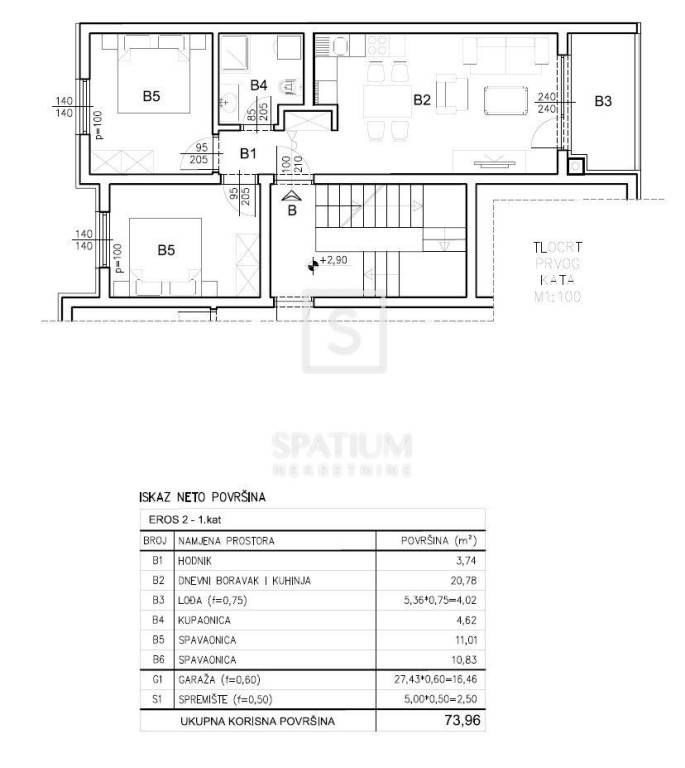 Die Wohnung befindet sich im ersten Stock des Gebäudes und hat eine gesamte Nettofläche von 73,96 m², einschließlich Wohnfläche, Loggia, Garagenstellplatz und Abstellraum im Erdgeschoss. Die Wohnfläche von 55 m² besteht aus einem großzügigen Wohnzimmer mit Küche und Essbereich, zwei Schlafzimmern, einem Badezimmer und einem Flur, während die Loggia zusätzlichen Raum zum Entspannen bietet. Die Wohnung überzeugt durch eine optimale Raumaufteilung, viel Tageslicht und ein hohes Maß an Wohnkomfort und eignet sich sowohl ideal für das Familienleben als auch als Investition zur langfristigen Vermietung.