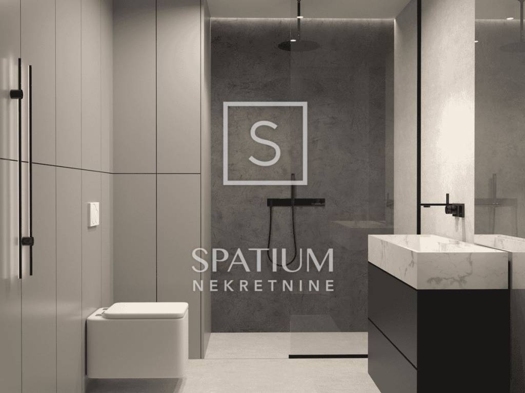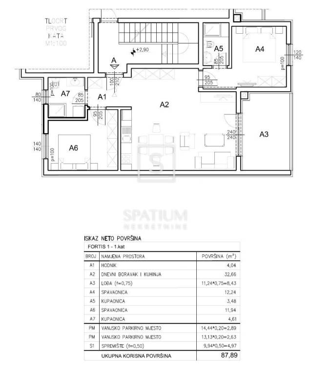 Die Wohnung befindet sich im ersten Stock des Gebäudes und hat eine gesamte Nettofläche von 87,89 m², einschließlich Wohnfläche, Loggia, zwei Stellplätze und Abstellraum im Erdgeschoss. Die Wohnfläche von 77,40 m² besteht aus einem großzügigen Wohnzimmer mit Küche und Essbereich, zwei Schlafzimmern, einem Badezimmer und einem Flur, während die Loggia zusätzlichen Raum zum Entspannen bietet. Die Wohnung überzeugt durch eine optimale Raumaufteilung, viel Tageslicht und ein hohes Maß an Wohnkomfort und eignet sich sowohl ideal für das Familienleben als auch als Investition zur langfristigen Vermietung.