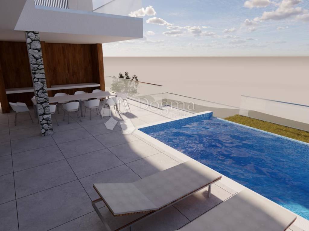 Auf dem Grundstück liegt eine Baugenehmigung für den Bau einer modernen Luxusvilla mit 378 m Wohnfläche vor, die sich über drei Etagen (Erdgeschoss, erster und zweiter Stock) erstreckt und über eine durchdachte Raumaufteilung sowie eine hochwertige Ausstattung verfügt.
