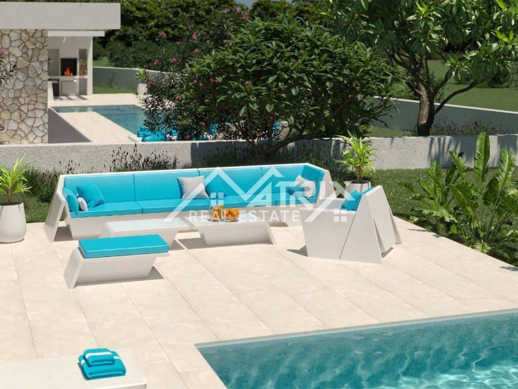 Der Außenbereich wurde mit besonderem Augenmerk auf Privatsphäre und Ästhetik gestaltet. Im Mittelpunkt steht ein 40 m² großer Swimmingpool, umgeben von gepflegtem Rasen, Olivenbäumen und autochthoner mediterraner Bepflanzung. Die Villa verfügt über eine eigene Zufahrt, ein vollständig eingezäuntes Grundstück sowie gepflasterte Parkflächen für mindestens drei Fahrzeuge.