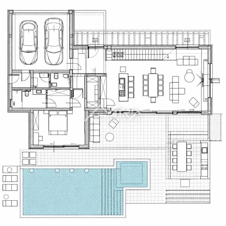 Das Haus erstreckt sich über zwei Etagen: Erdgeschoss und Obergeschoss. Der Eingangsbereich führt in einen beeindruckenden offenen Wohnraum, der Küche, Essbereich und Wohnzimmer vereint, mit direktem Zugang zur Poolterrasse über große Glasfronten, die den ganzen Tag über für viel Tageslicht sorgen. Im Erdgeschoss befinden sich außerdem ein großzügiges Schlafzimmer mit 20 m² und eigenem Badezimmer, ein separates Gäste-WC sowie ein funktionaler Zugang zur Garage und zum Abstellraum.