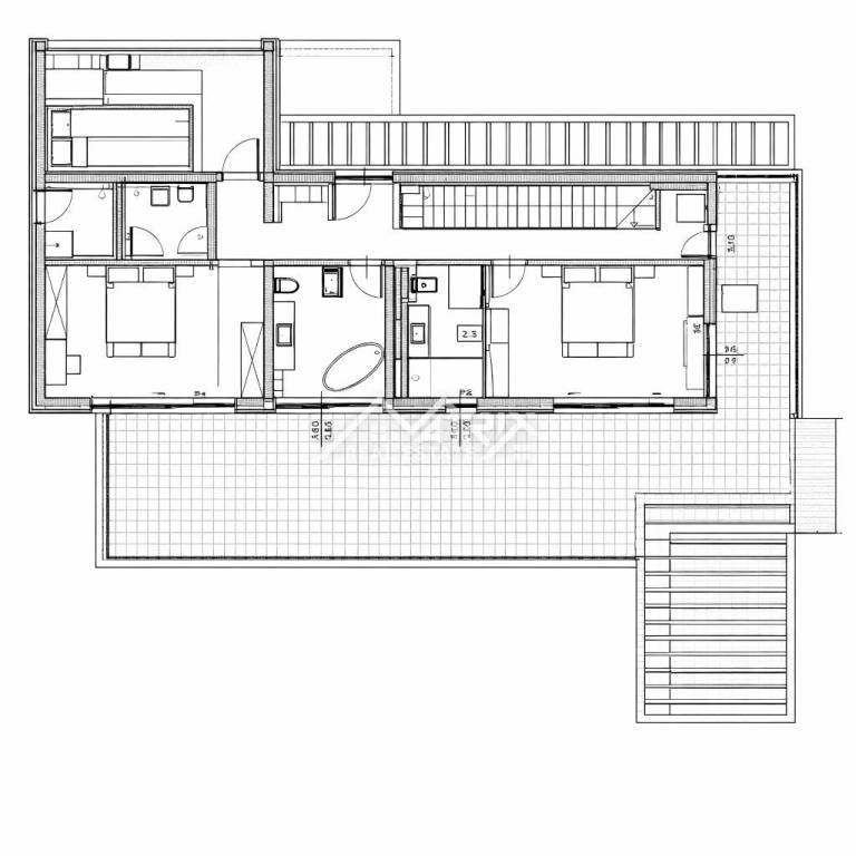 Über eine innenliegende Treppe gelangt man diskret in das Obergeschoss, wo sich zwei Schlafzimmer befinden, jeweils mit eigenem Badezimmer. Ein Schlafzimmer hat eine Fläche von 16 m², während das geräumige Master-Schlafzimmer 26 m² umfasst. Beide Zimmer verfügen über Zugang zu einer großen, teilweise überdachten Terrasse mit 45 m², von der sich ein offener Blick auf die Natur und das Meer bietet – ideal zum Entspannen den ganzen Tag über.