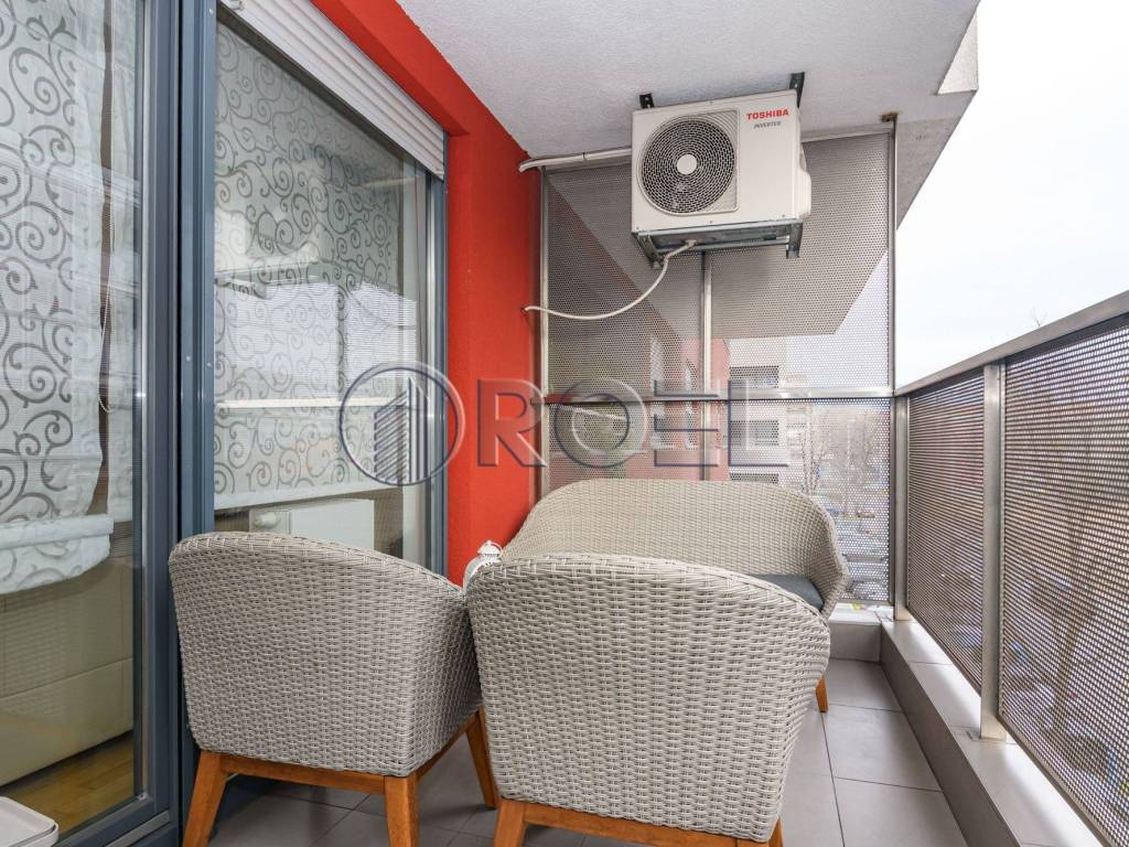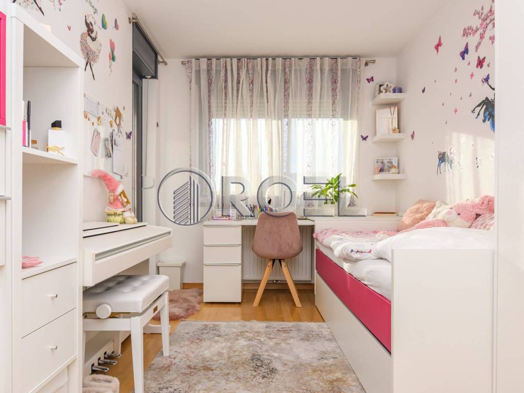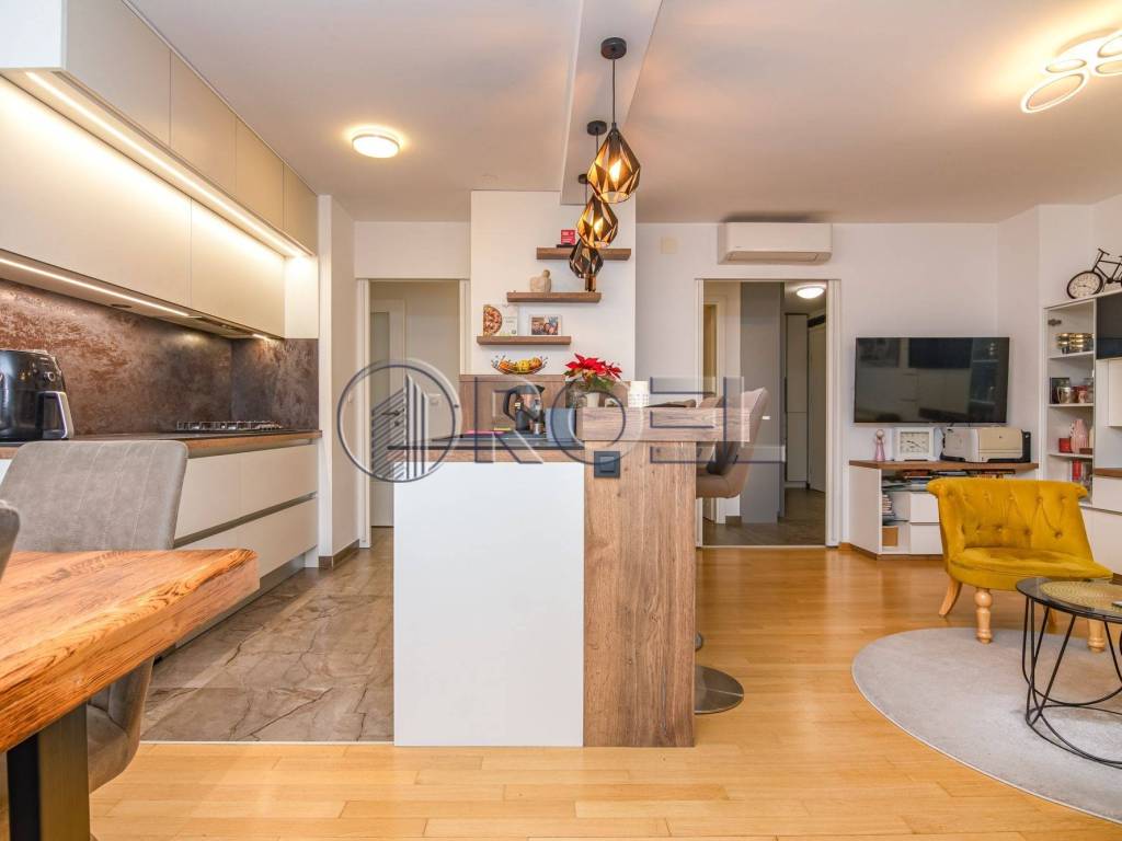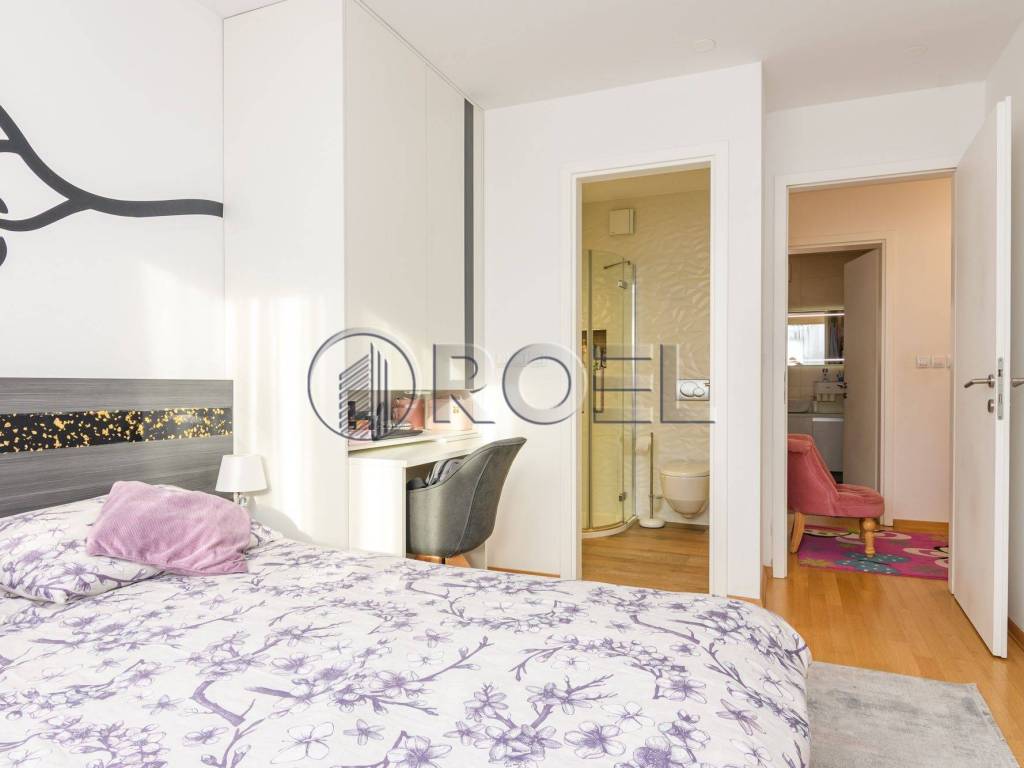 The living area of the apartment is oriented to the east, which ensures plenty of natural light in the morning hours, while the sleeping area is oriented to the south, providing warmth and light during the day. The apartment stands out for its top-notch design, quality materials and equipment, including custom-made furniture, oak parquet, quality ceramics, Laufen Pro sanitary ware, Hansgrohe fittings, wooden exterior joinery, security doors, air conditioning, video intercom, custom-built kitchen and underfloor heating in the bathrooms.