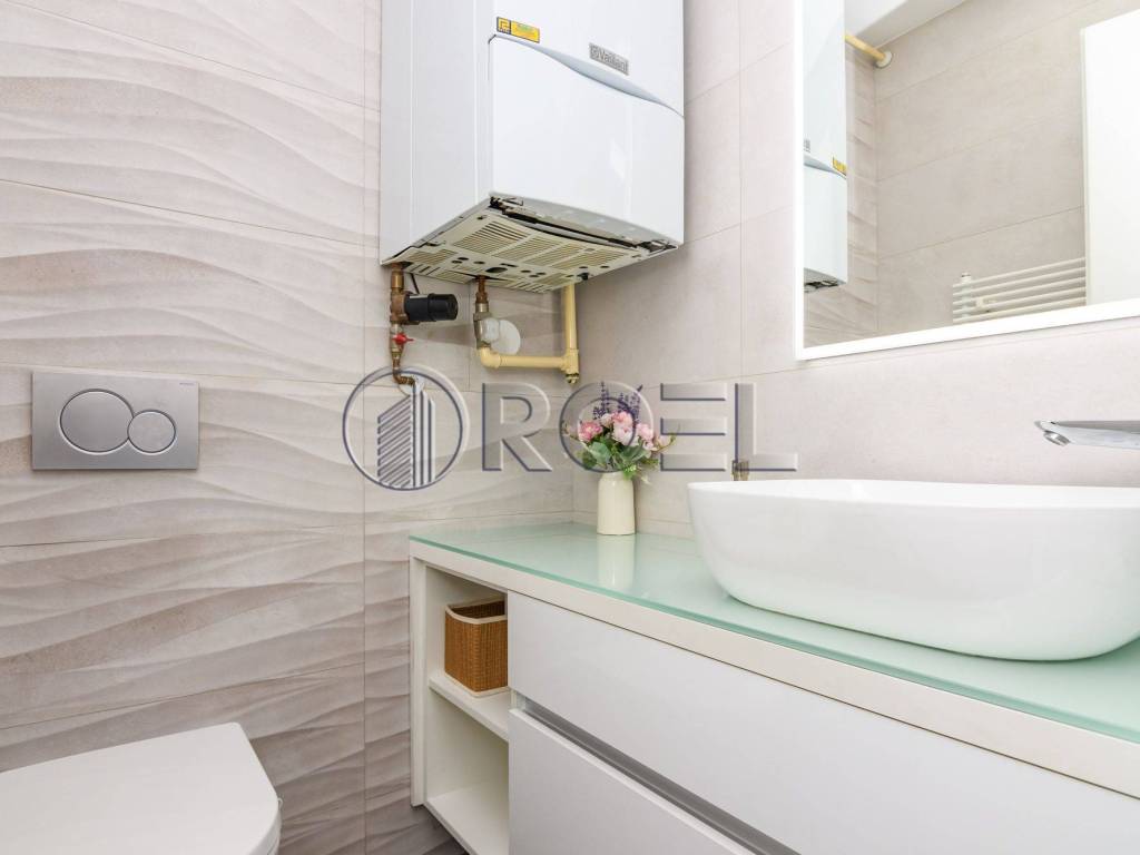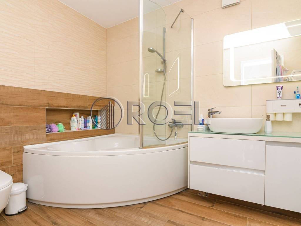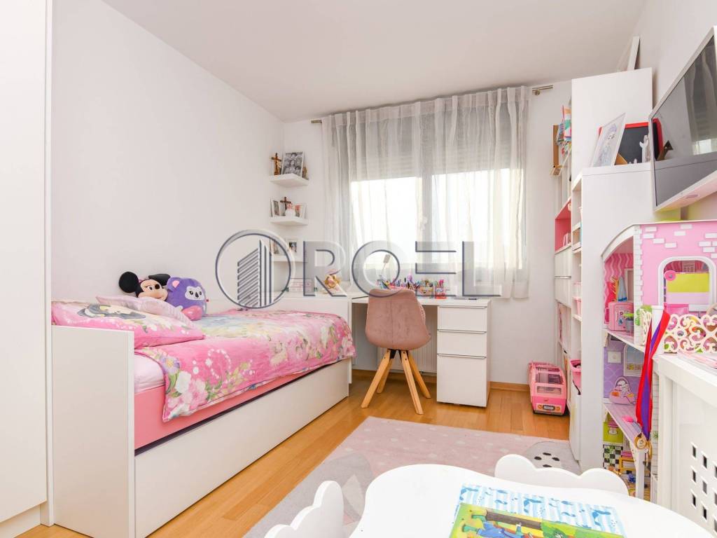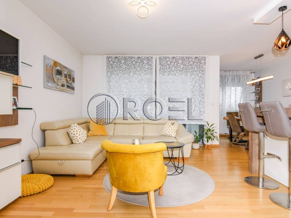The living area of the apartment is oriented to the east, which ensures plenty of natural light in the morning hours, while the sleeping area is oriented to the south, providing warmth and light during the day. The apartment stands out for its top-notch design, quality materials and equipment, including custom-made furniture, oak parquet, quality ceramics, Laufen Pro sanitary ware, Hansgrohe fittings, wooden exterior joinery, security doors, air conditioning, video intercom, custom-built kitchen and underfloor heating in the bathrooms.