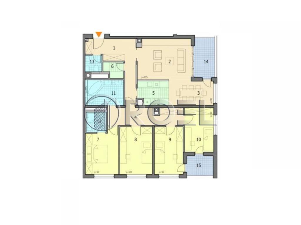 It consists of a functional entrance area with a wardrobe, a spacious open-space living area that combines the kitchen, dining room and living room with an exit to a large east-facing loggia, which forms a natural extension of the living room and further emphasizes the feeling of spaciousness. The hallway with built-in wardrobes provides plenty of storage space, while the sleeping area of the apartment is clearly separated and includes four bedrooms. One of them is a master bedroom with a private bathroom and WALK-in shower, the second bathroom is equipped with a large corner bathtub, and two rooms have access to a second south-facing loggia. In addition, the apartment has a pantry, a separate guest toilet and a storage room in the basement.