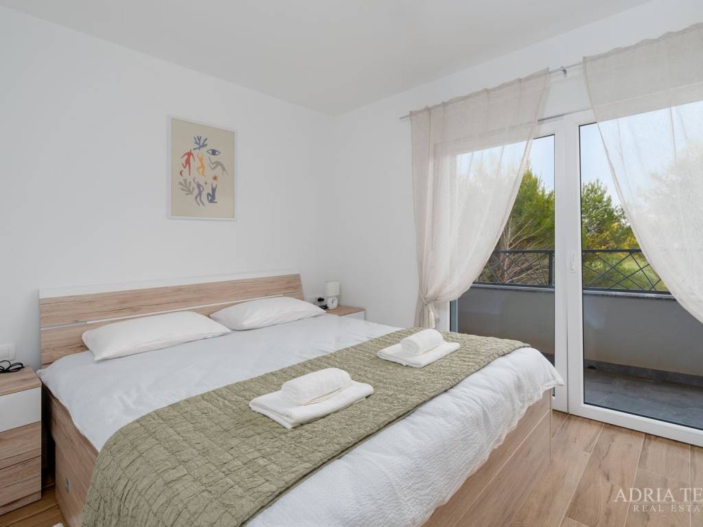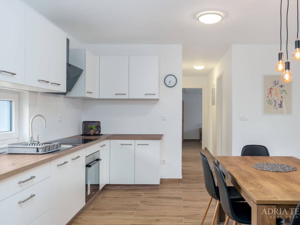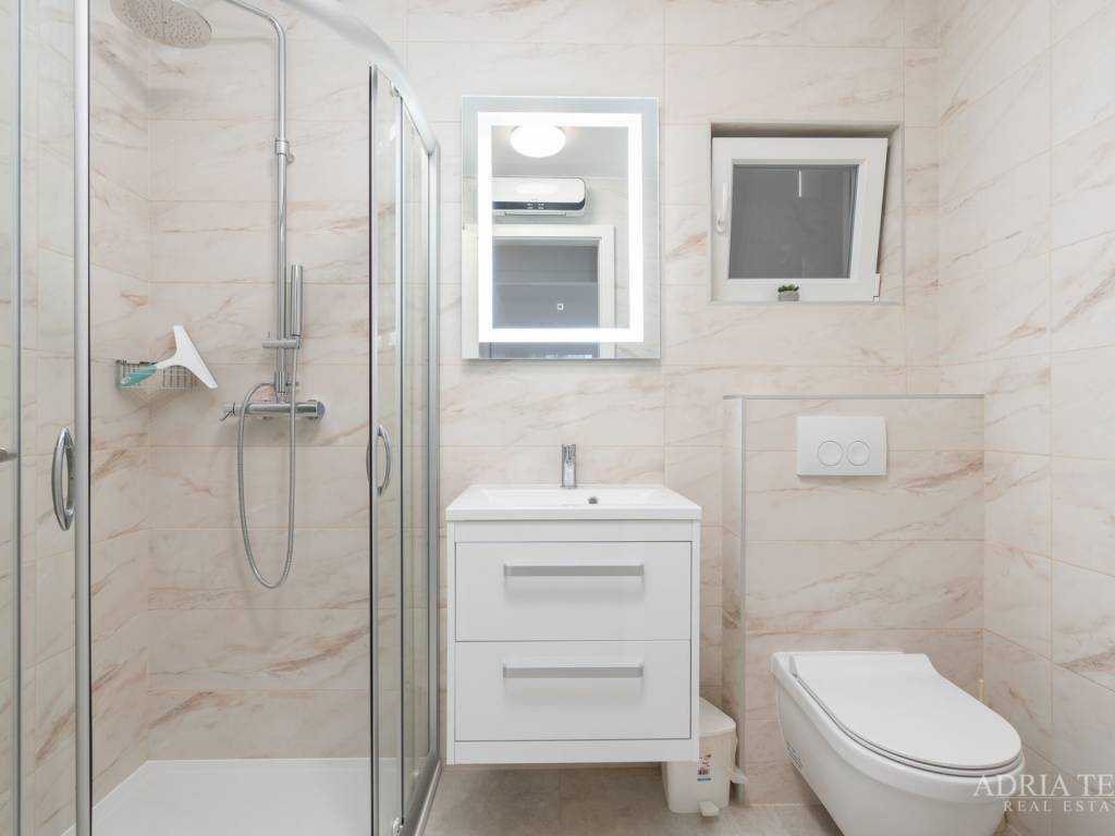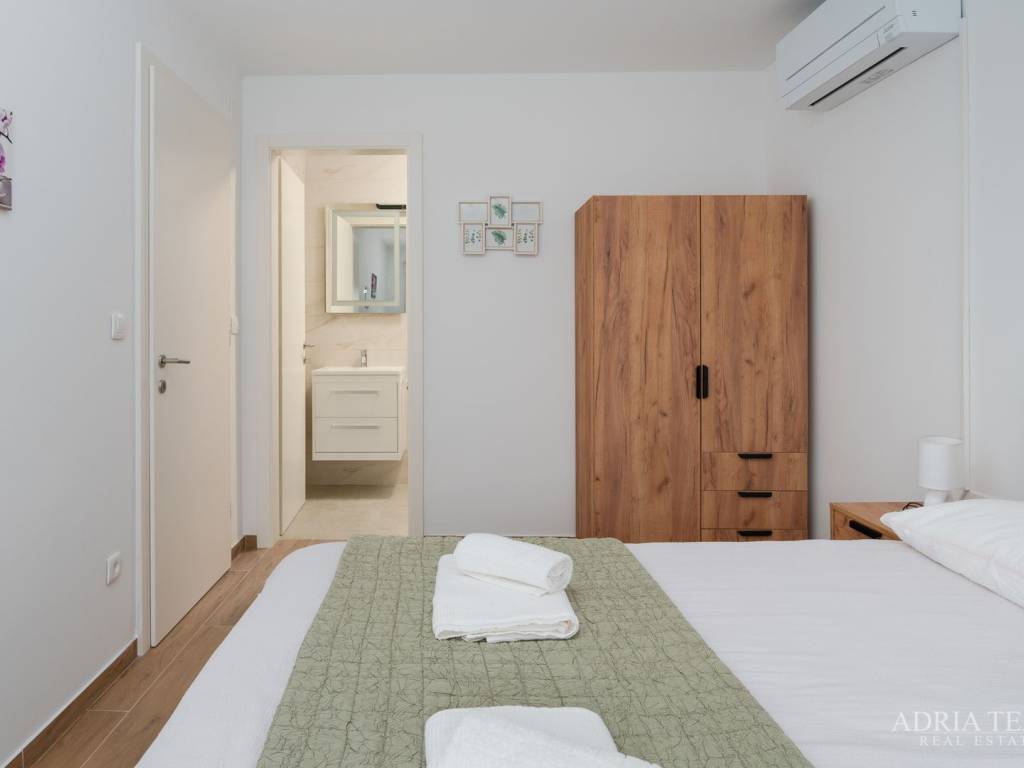 Apartman je potpuno namješten i odmah useljiv, a sastoji se od otvorenog koncepta kuhinje s blagovaonicom i dnevnim boravkom, dvije spavaće sobe te dvije moderno opremljene kupaonice. Posebnu vrijednost čine prostrani balkon, terasa te krovna sunčana terasa s jacuzzijem, idealna za opuštanje i uživanje.