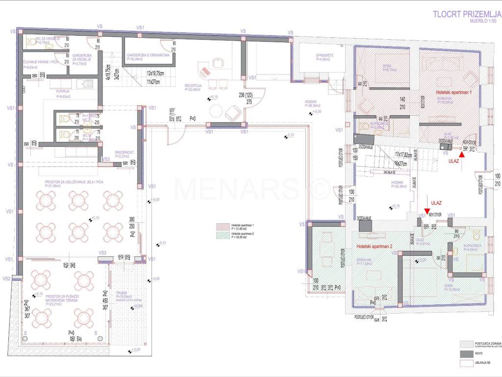 -prizemlje: dva apartmana, recepciju, hodnik, kuhinju, prostor za posluživanje jela i pića, sanitarni čvor, garderobe i natkrivenu vanjsku terasu