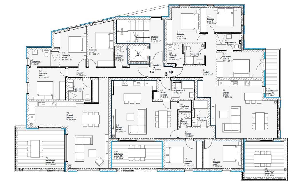 Wohnung S5 im 1. Stock mit einer Gesamtfläche von 120,89 m2 besteht aus Eingang, Flur, WC/Hauswirtschaftsraum, zwei Schlafzimmern, Badezimmer 1, Schlafzimmer mit eigenem Badezimmer 2, Küche mit Essbereich und Wohnzimmer sowie überdachter Terrasse mit einer Fläche von 16,90 m2. Zur Wohnung gehört ein Abstellraum im Keller und ein überdachter Parkplatz.