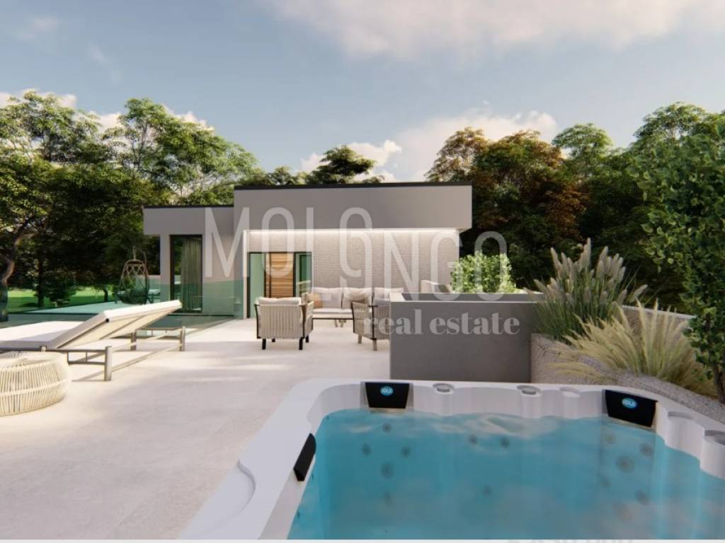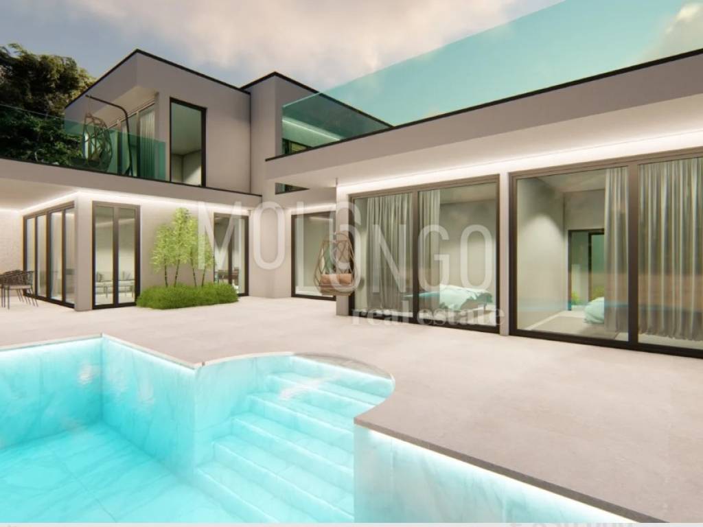 Villa in luxuriöser architektonischer Bauweise, gelegen auf einem 2.700 m2 großen Baugrundstück mit großem Swimmingpool, gelegen in einer ruhigen Gegend mit viel Natur. Derzeit im Bau, Zimmerei wird eingebaut. Geplanter Abschluss der Arbeiten 12/2024.