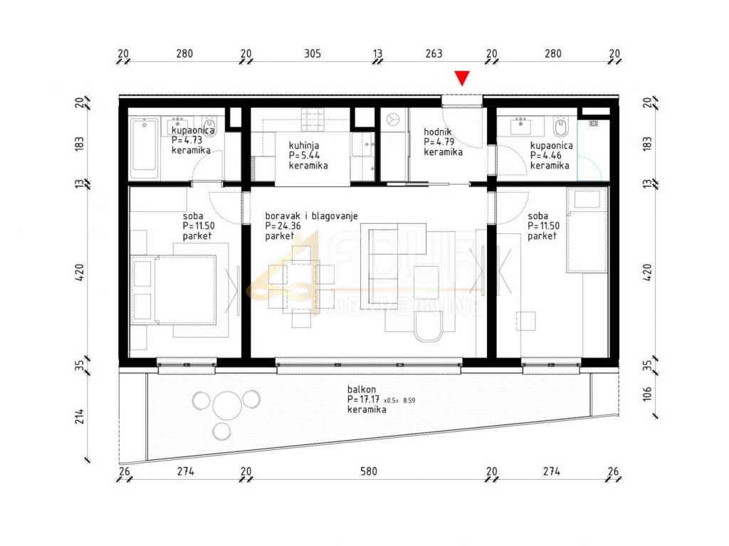 Sie ist mit modernster Technologie und hochwertigen Materialien ausgestattet. Das Gebäude ist in Stahlbetonkonstruktion mit Trennwänden aus Kalziumsilikatplatten gebaut, während einige Teile aus doppeltem Knauf bestehen. Die Fassade ist mit 15 cm Steinwolle isoliert, was eine hervorragende Wärmedämmung gewährleistet. In der gesamten Wohnung ist dreischichtiges Weizer-Eichenparkett verlegt, mit Ausnahme des Badezimmers, der Küche und des Eingangsbereichs, wo Porzellankeramik vorhanden ist. Zum Heizen und Kühlen werden Daikin-Luft-/Luft-Wärmepumpen mit Brüstungssystem verwendet.
