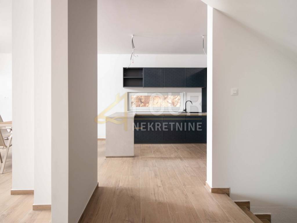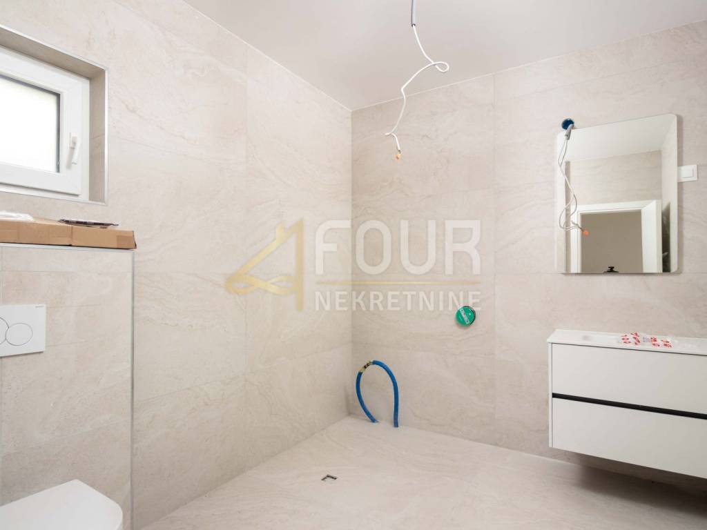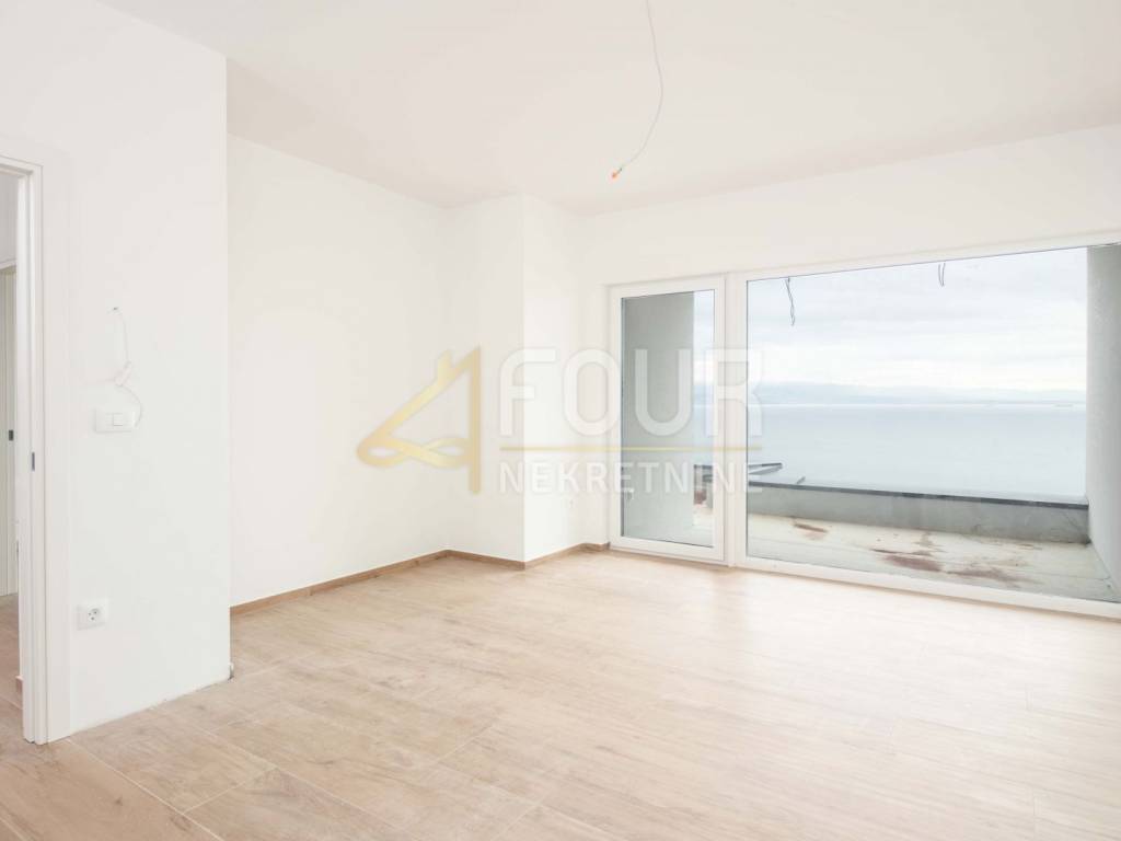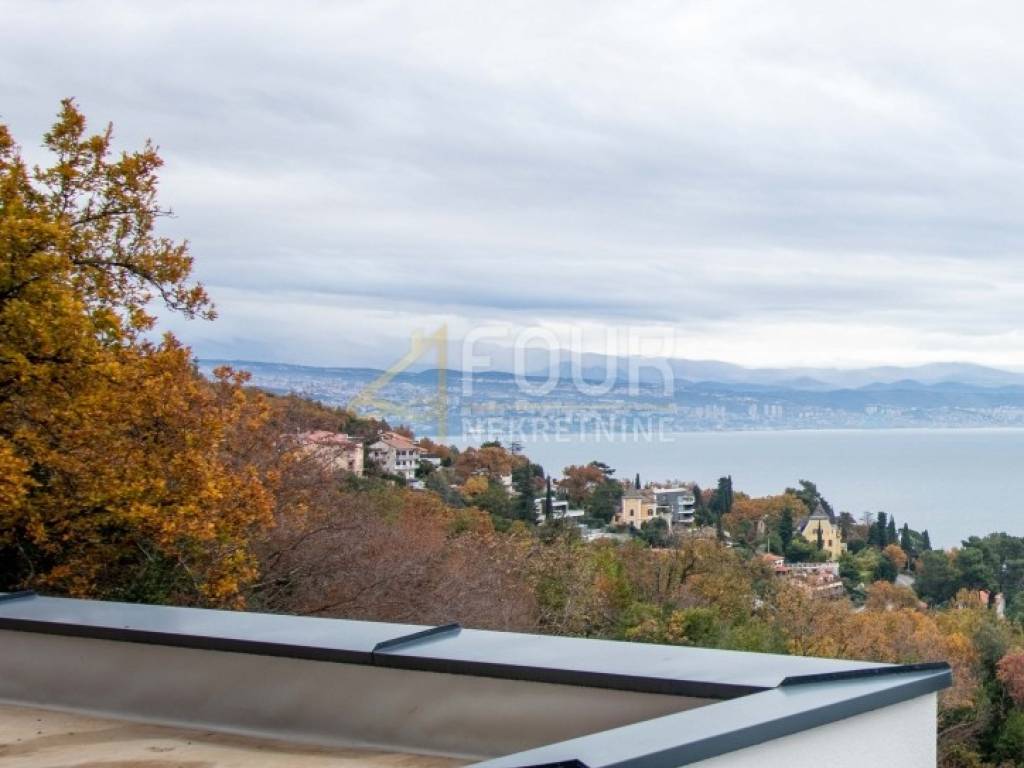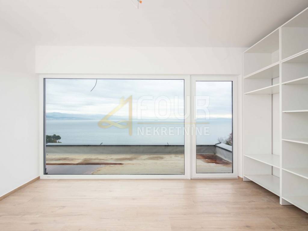 Im Obergeschoss befinden sich drei elegante Schlafzimmer, jedes mit eigenem Bad. Der große Balkon auf der Südseite bietet einen herrlichen Panoramablick auf das Meer und die Kvarner-Inseln.
