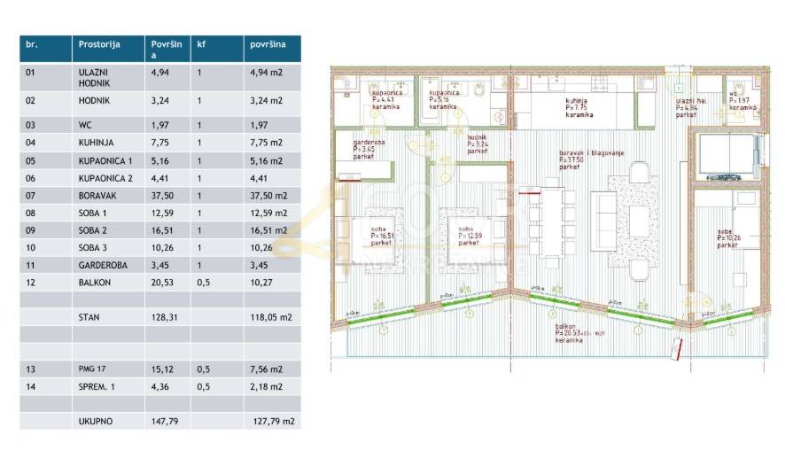 Die Wohnung hat eine Gesamtfläche von 128,31 m² (mit Koeffizient 118,05 m²), einschließlich zusätzlicher Flächen – Stellplatz und Abstellraum – insgesamt 147,79 m² (mit Koeffizient 127,79 m²).
