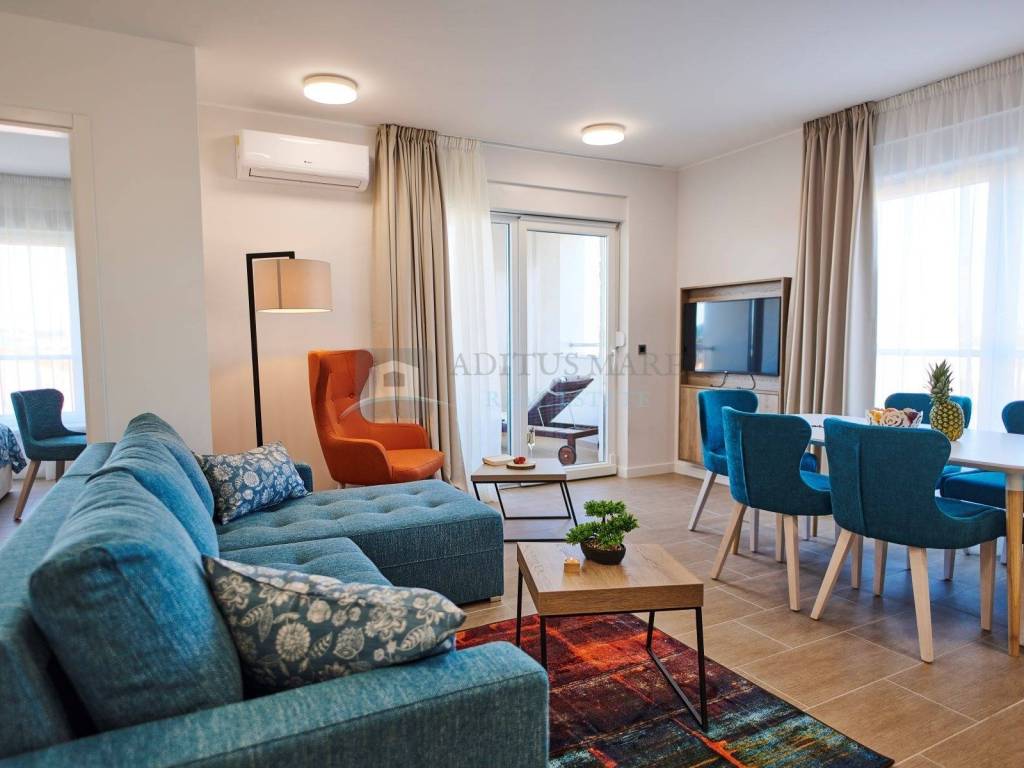Dvosoban stan s pogledom na more stambene površine 67,25 m2 potpuno namješten i s moderno osmišljenim dizajnom čini ovaj apartman uistinu atraktivnim i posebnim.