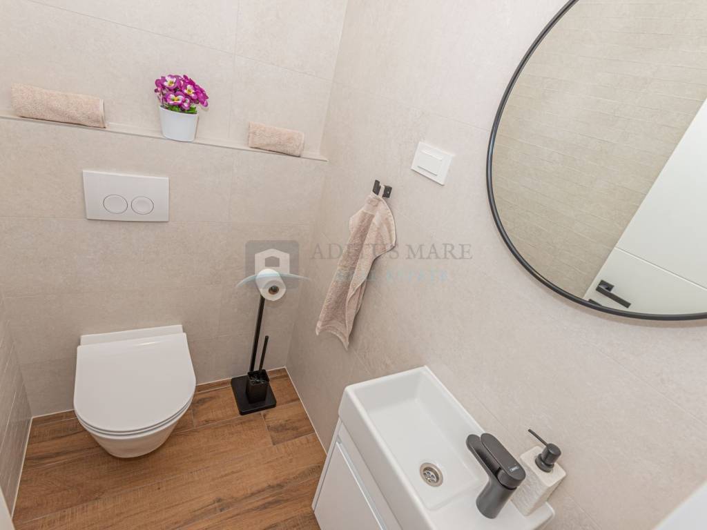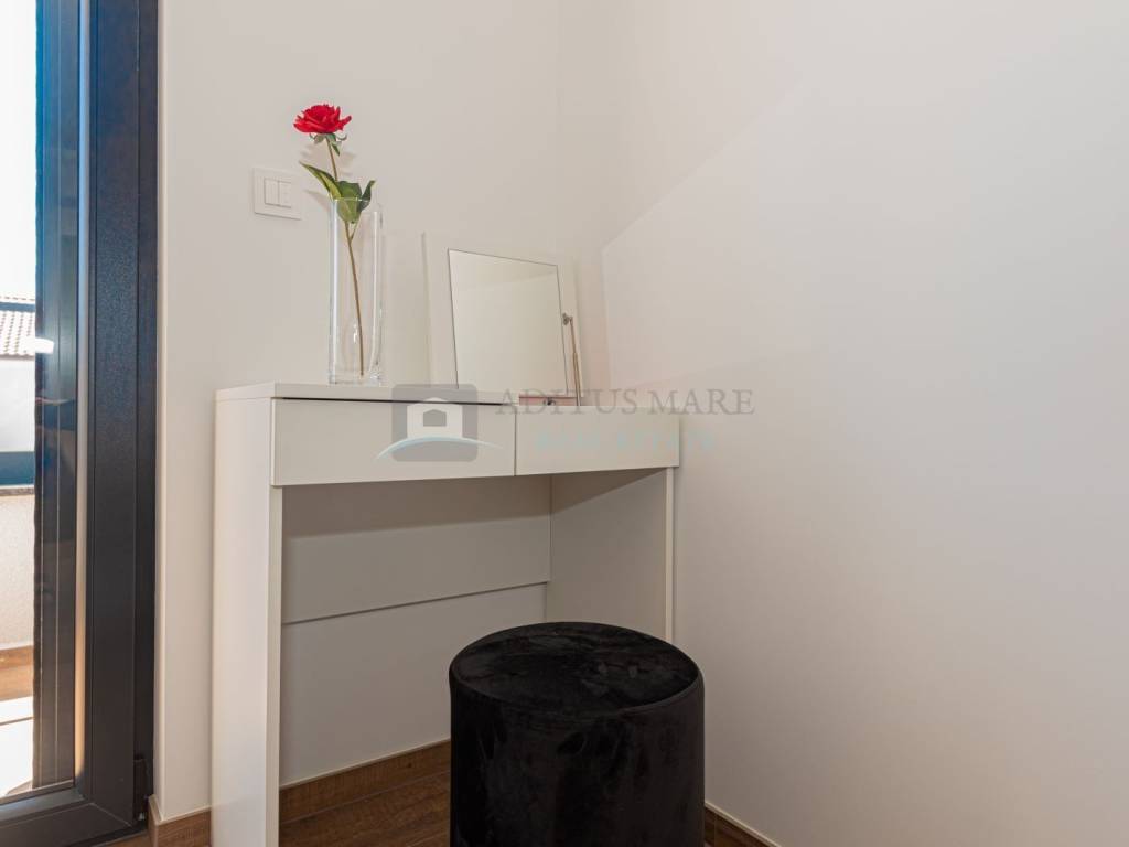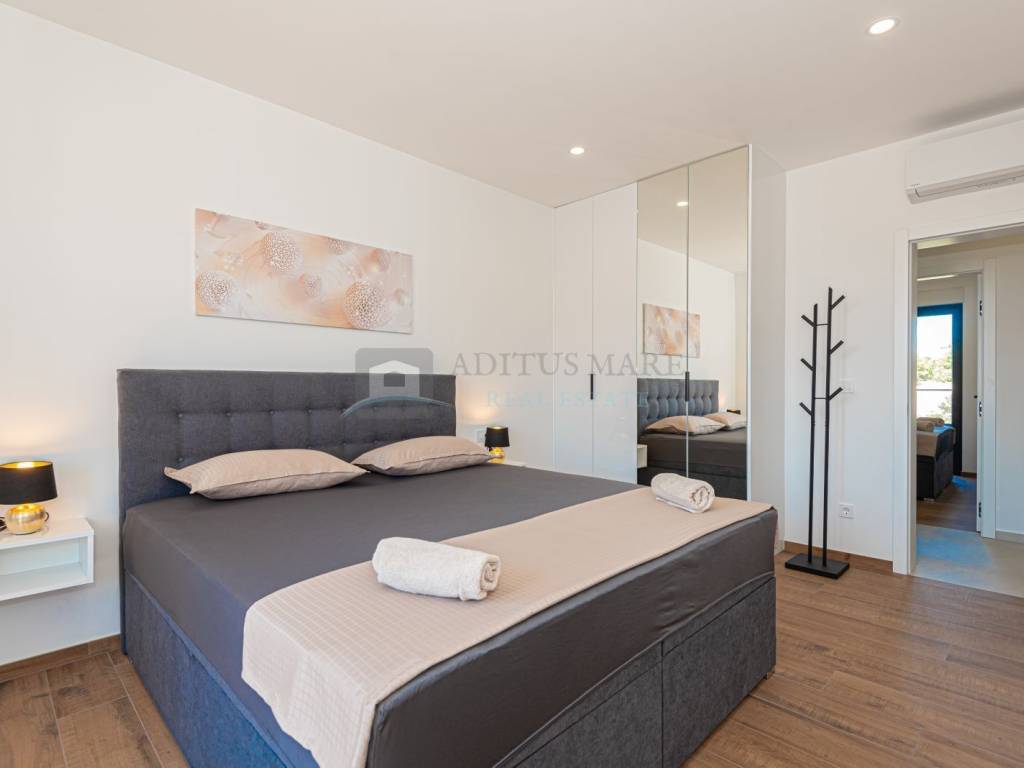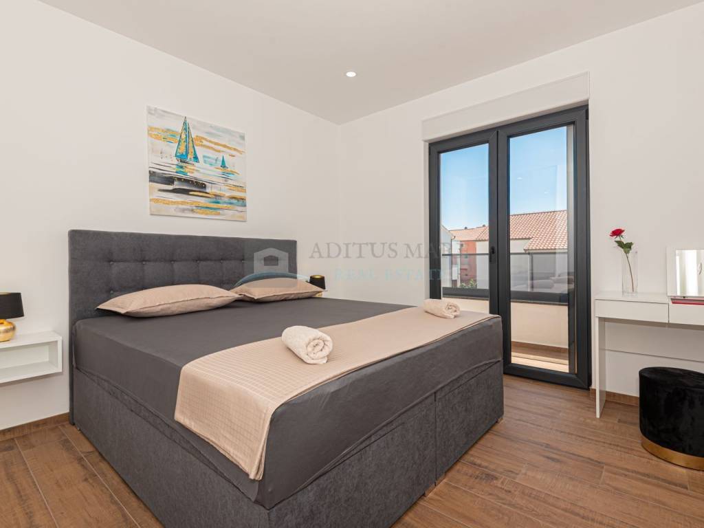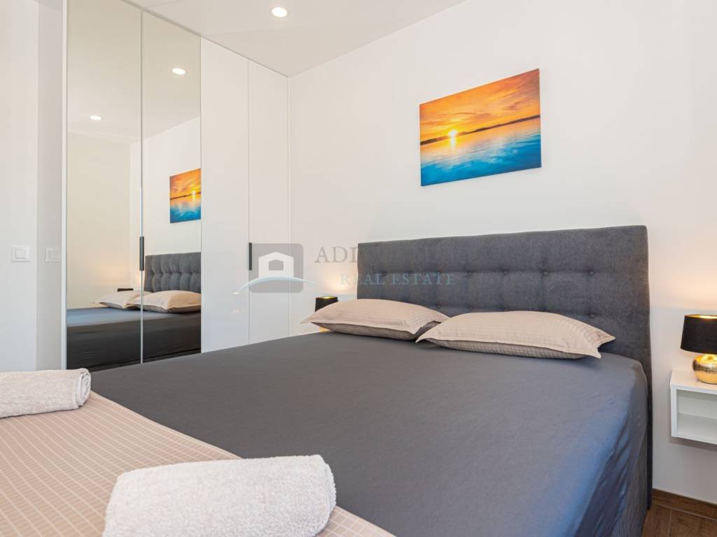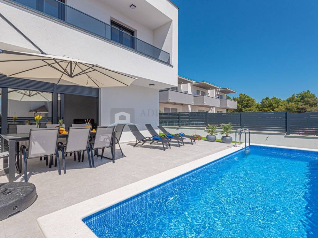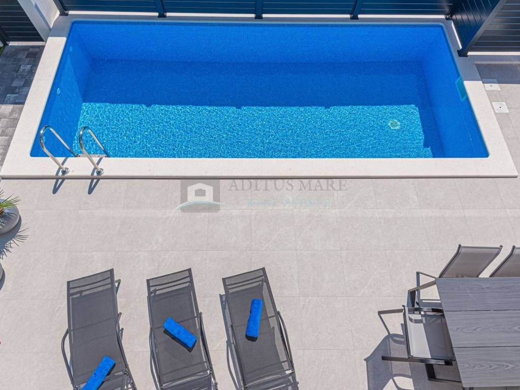 Na prodaju luksuzni dvojni objekt u Vodicama, 800 metara od mora. Kuća se prostire na prizemlje i prvi kat. U prizemlju su spavaća soba, kupaonica, kuhinja s blagovaonicom i dnevni boravak s izlazom na terasu. Na katu s još tri spavaće sobe i dvije kupaonice. U dvorištu s prednje strane kuće se nalazi bazen s ležaljkama, sa stražnje strane kuće je roštilj s ljetnom kuhinjom i vrtnom kućicom. Kuća je kompletno opremljena i uređena te se tako i prodaje. U svakoj sobi klima uređaj, podno grijanje s dizalicom topline kroz cijelu kuću provedeno.