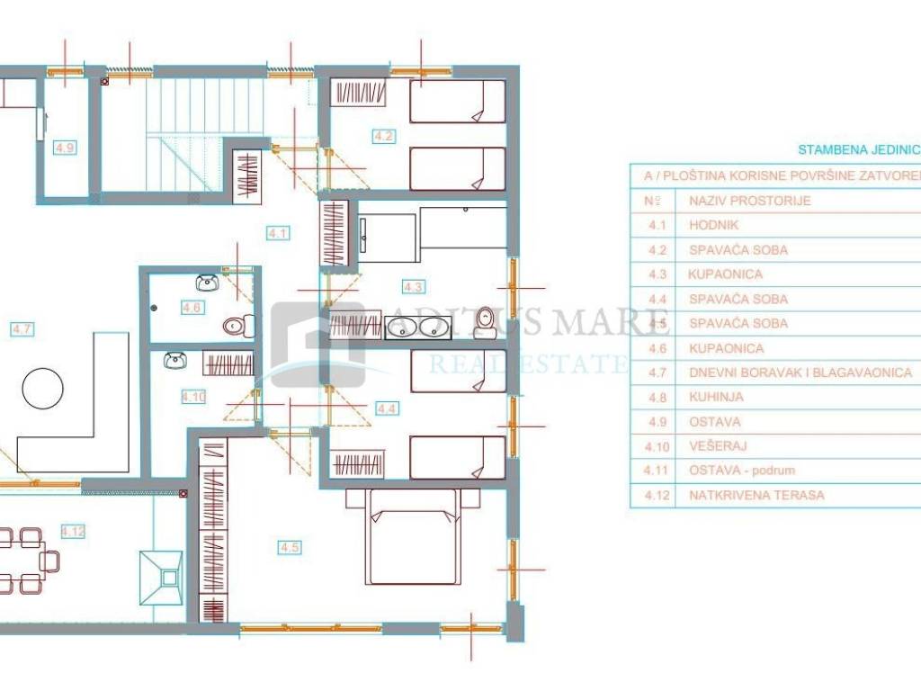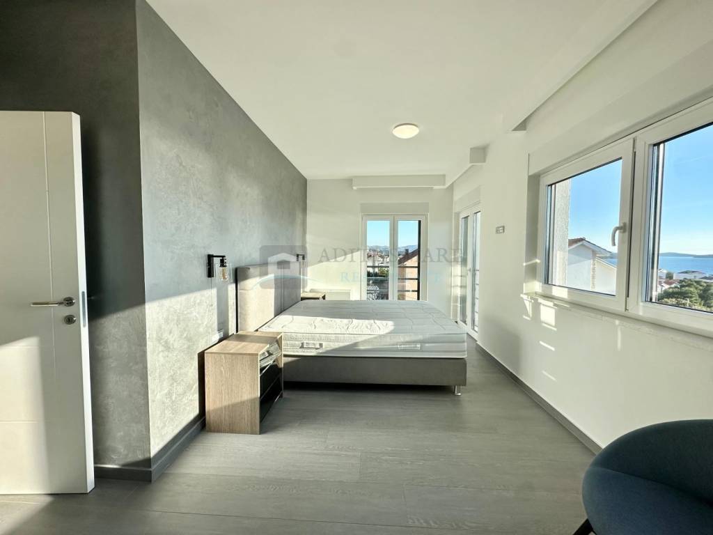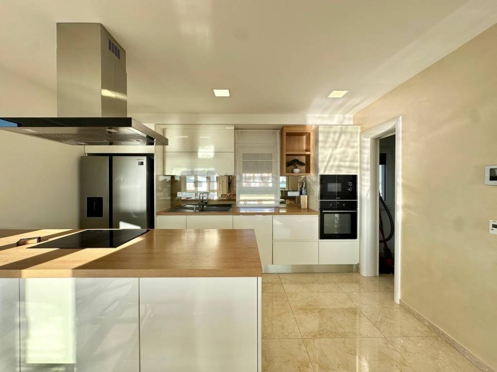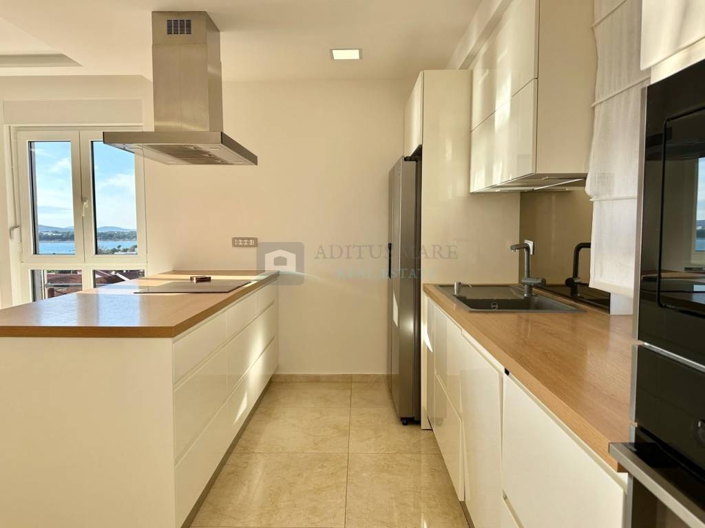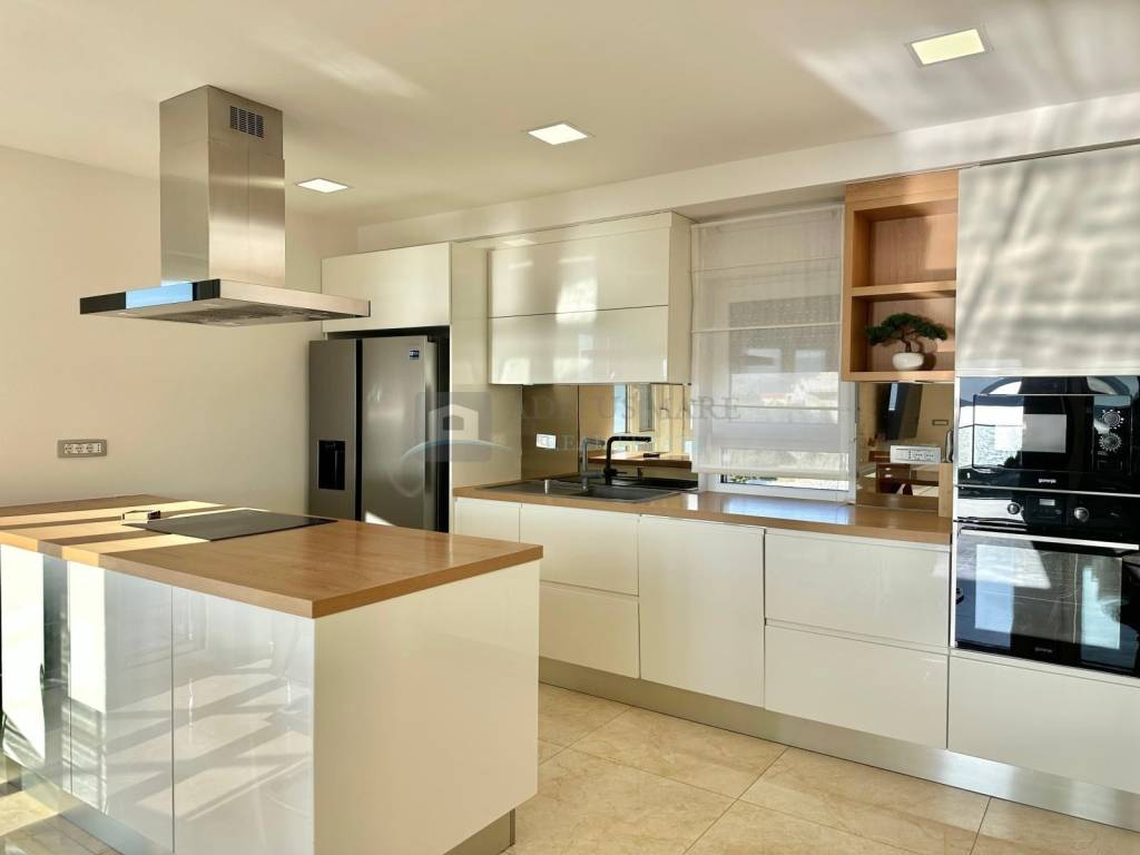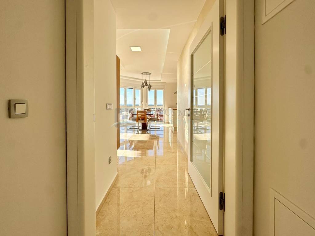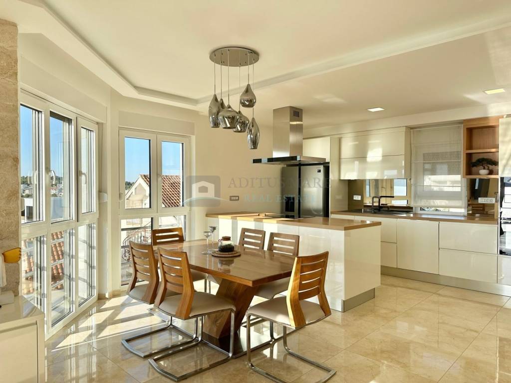 Penthouse se prostire na cijeloj gornjoj etaži moderne zgrade i nudi impresivan otvoreni tlocrt koji povezuje kuhinju, blagovaonicu i dnevni boravak u jedinstven, prozračan prostor idealan za svakodnevni život i druženje. Kuhinja je opremljena vrhunskim aparatima, modernim elementima i središnjim otokom koji poziva na kulinarska uživanja. Dnevni boravak, okupan prirodnim svjetlom zahvaljujući velikim kliznim stijenama, izlazi na prostranu terasu koja predstavlja pravu oazu mira.