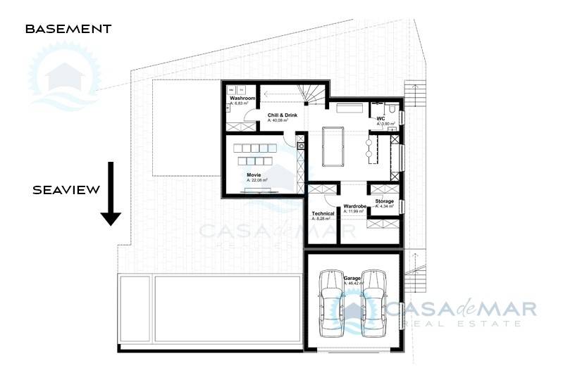 Im Untergeschoss des Gebäudes, das durch eine Innentreppe mit dem Erdgeschoss verbunden ist, befindet sich eine Garage für 2 Autos, die mit einem Elektroladegerät ausgestattet ist, ein Heizungsraum, eine Waschküche, ein Raum für Geselligkeit und eine Taverne, ein Heimkino und eine Toilette.