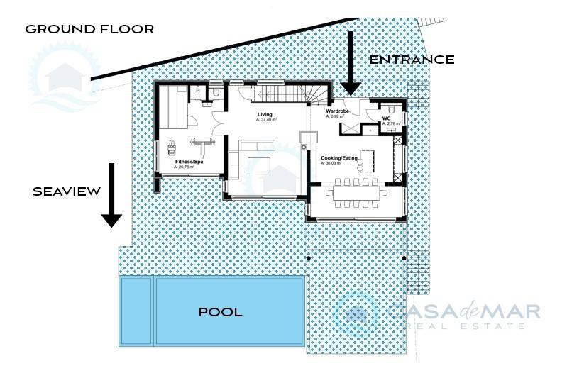 Es erstreckt sich über insgesamt drei Etagen. Das Erdgeschoss besteht aus einer Eingangshalle, einem Sauna- und Fitnessbereich mit Badezimmer, einer Toilette und einem offenen Wohnzimmer mit Küche und Essbereich, mit Zugang zu einer überdachten Terrasse und einem Garten mit Pool und Sonnendeck.